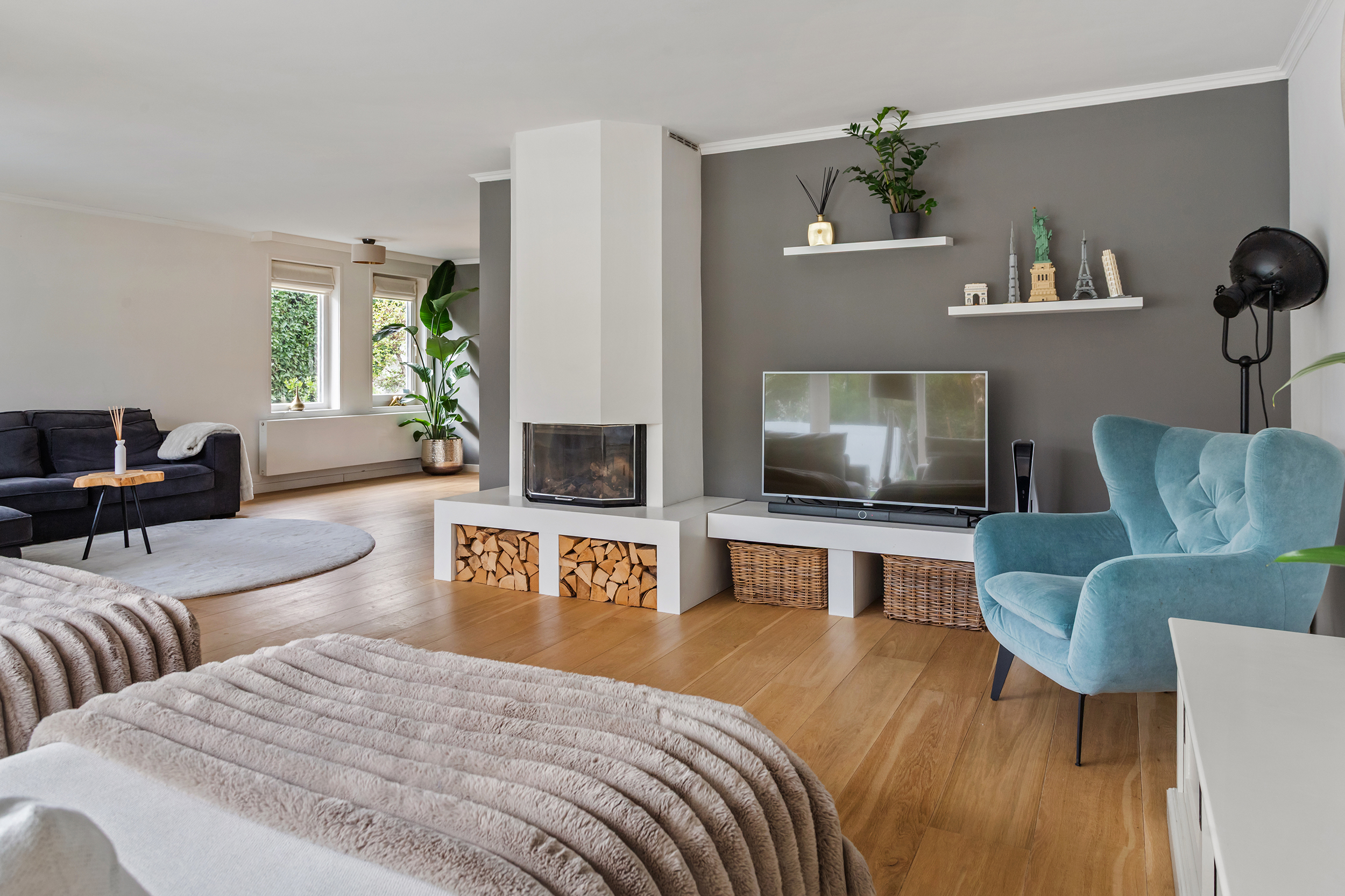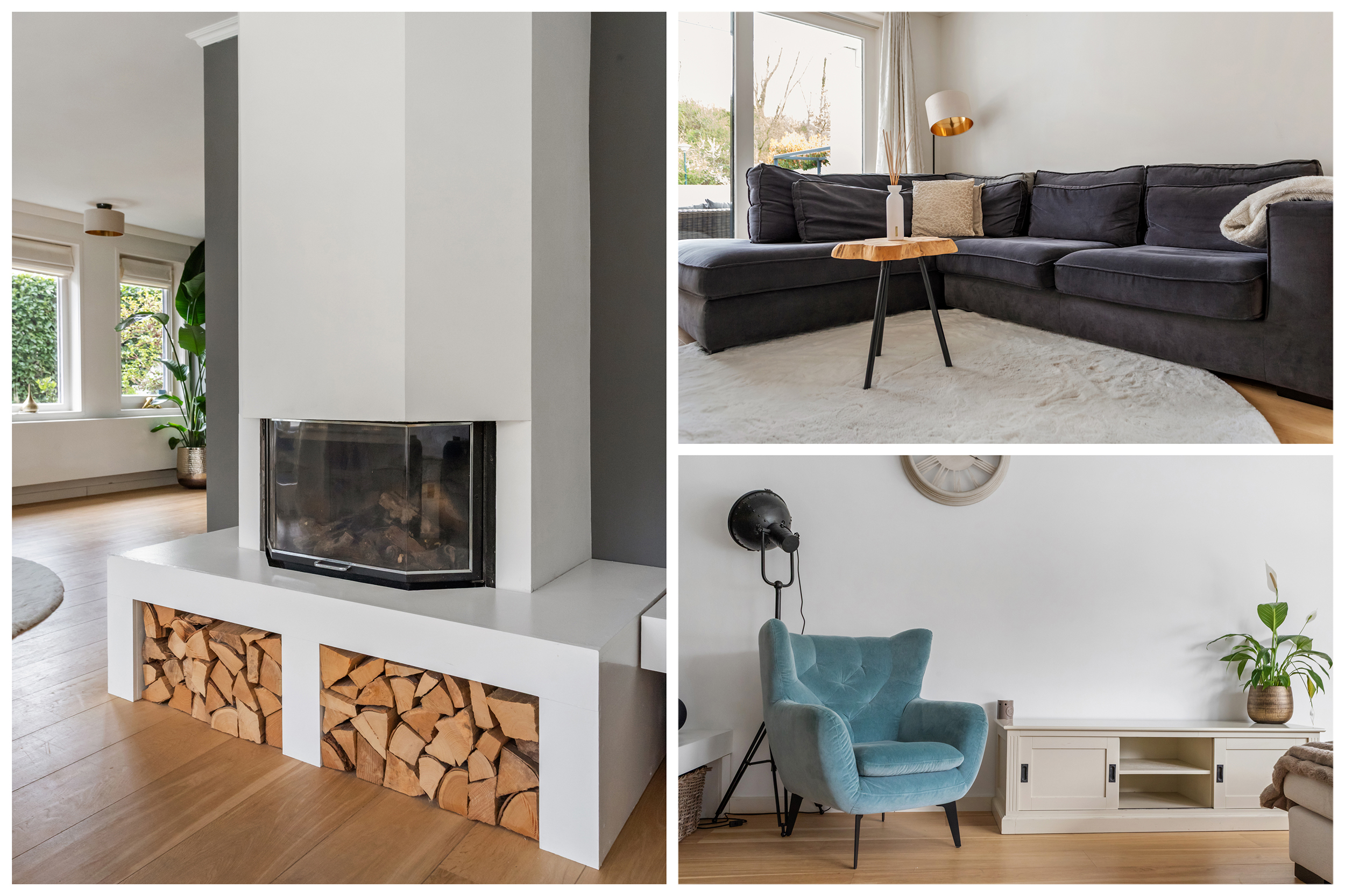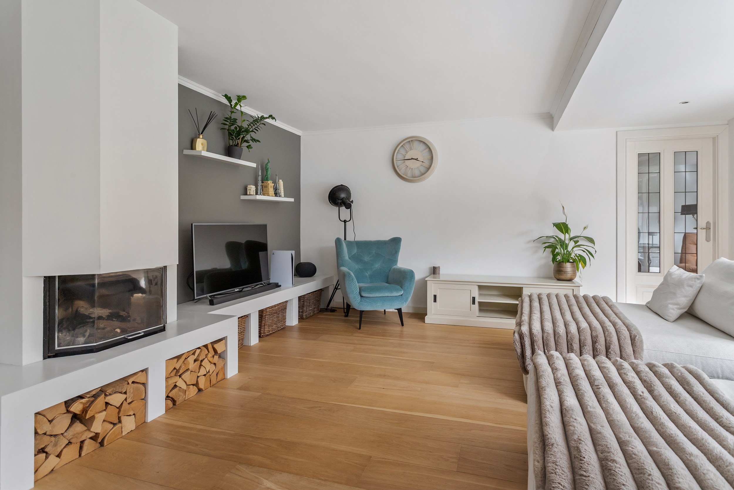 De woonkamer is royaal opgezet en kenmerkt zich door de mooie lichtinval en de fijne indeling met meerdere zitgedeeltes. Grote raampartijen en een schuifpui zorgen voor een directe verbinding met de tuin en laten het daglicht rijkelijk naar binnen stromen. De houten vloer en de open haard geven de ruimte een warme en uitnodigende sfeer.