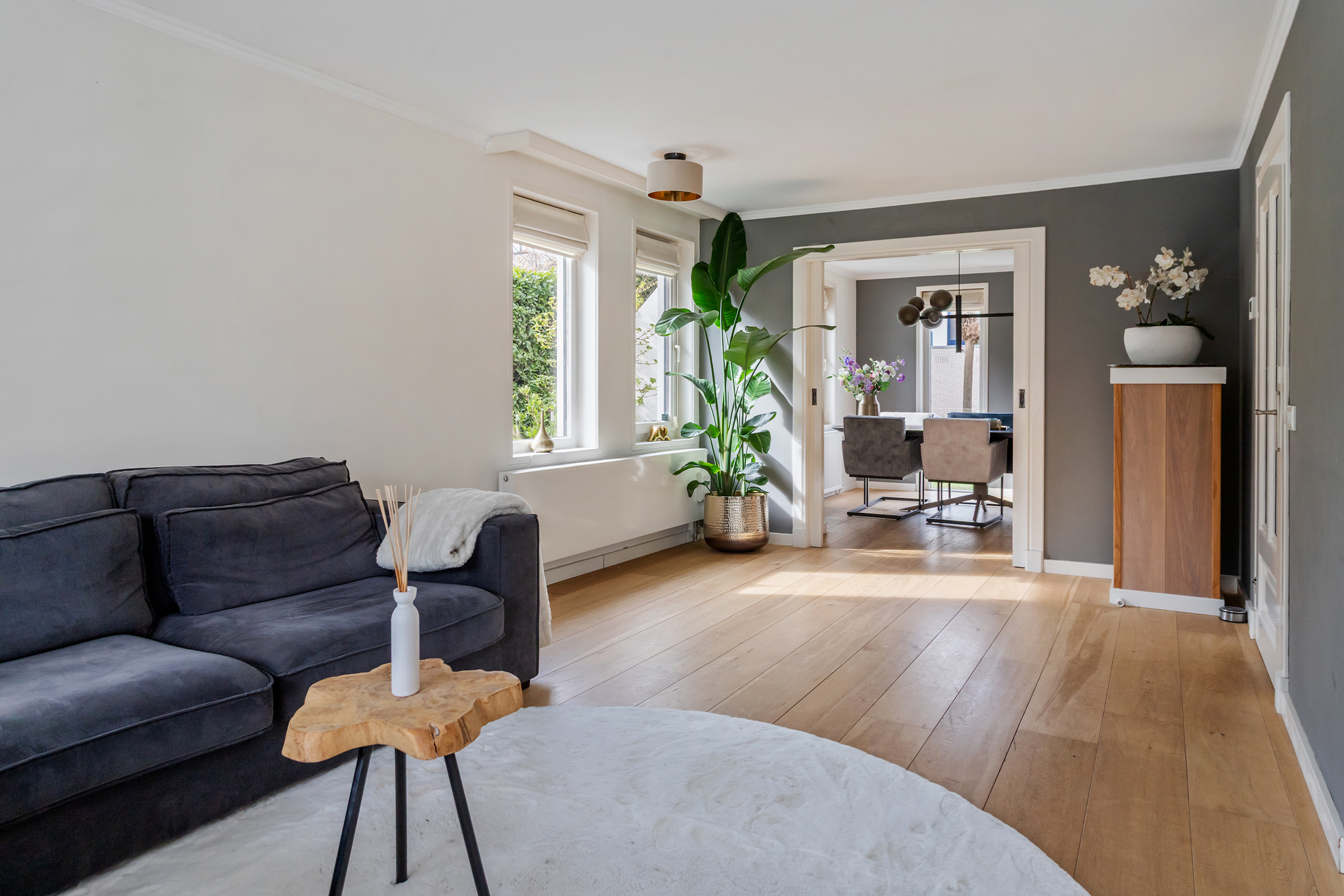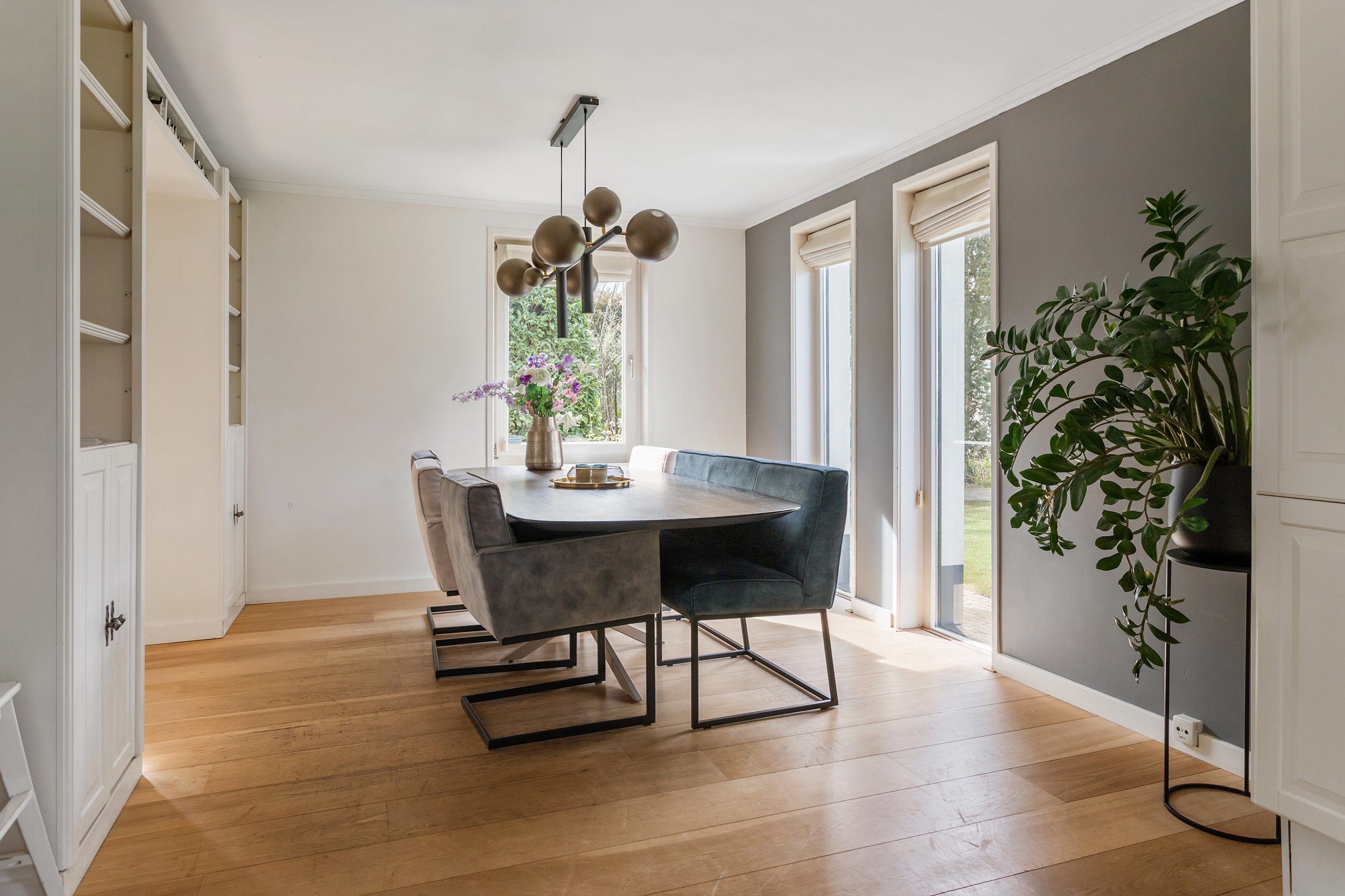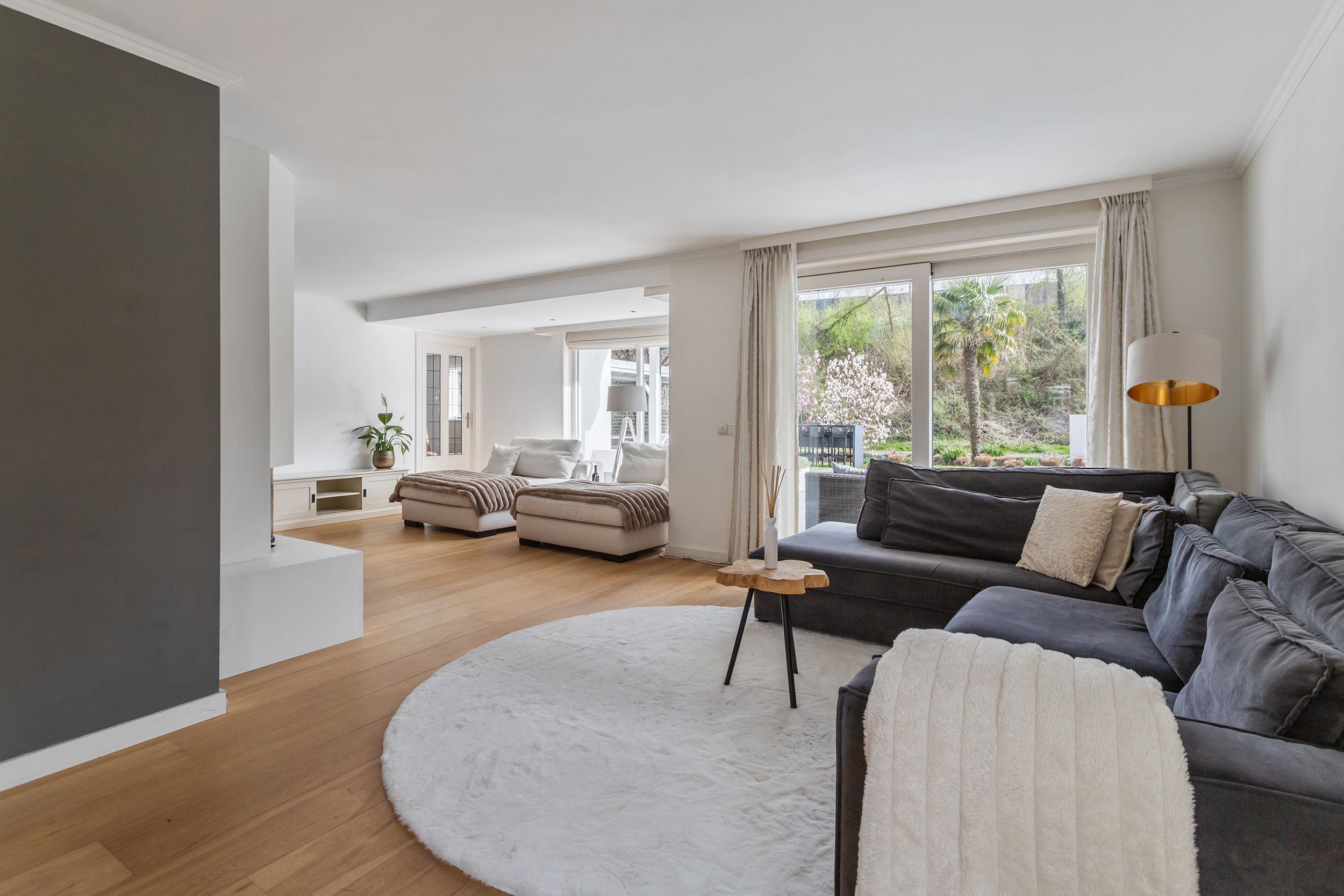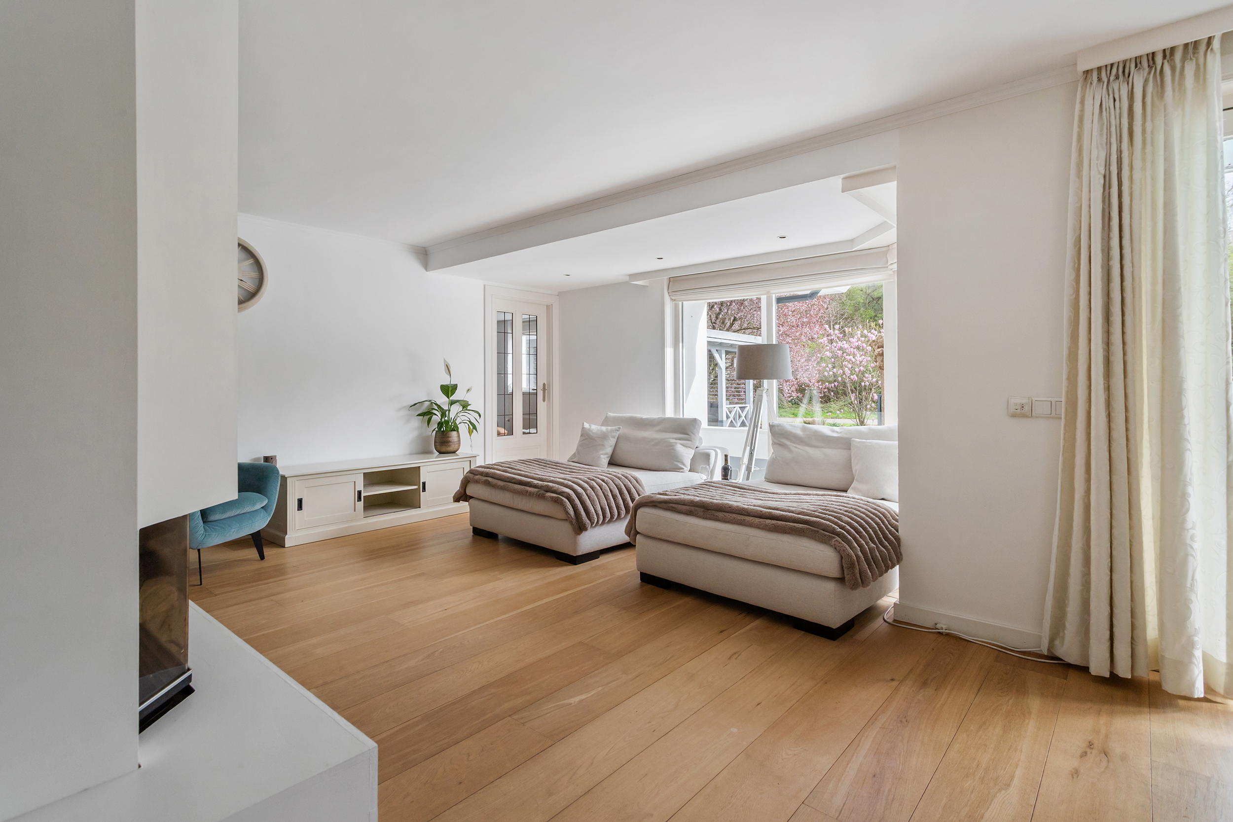 De woonkamer is royaal opgezet en kenmerkt zich door de mooie lichtinval en de fijne indeling met meerdere zitgedeeltes. Grote raampartijen en een schuifpui zorgen voor een directe verbinding met de tuin en laten het daglicht rijkelijk naar binnen stromen. De houten vloer en de open haard geven de ruimte een warme en uitnodigende sfeer.