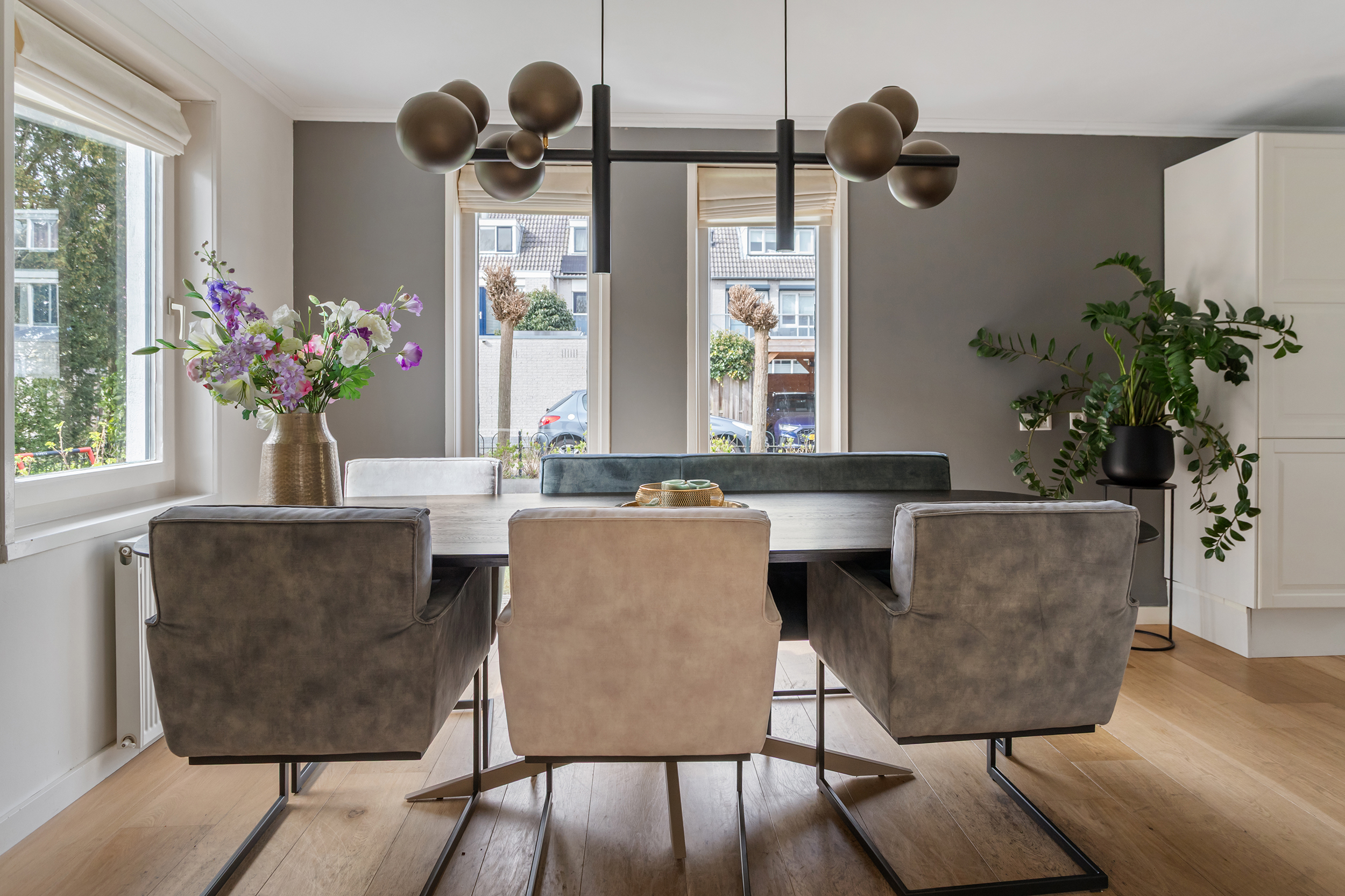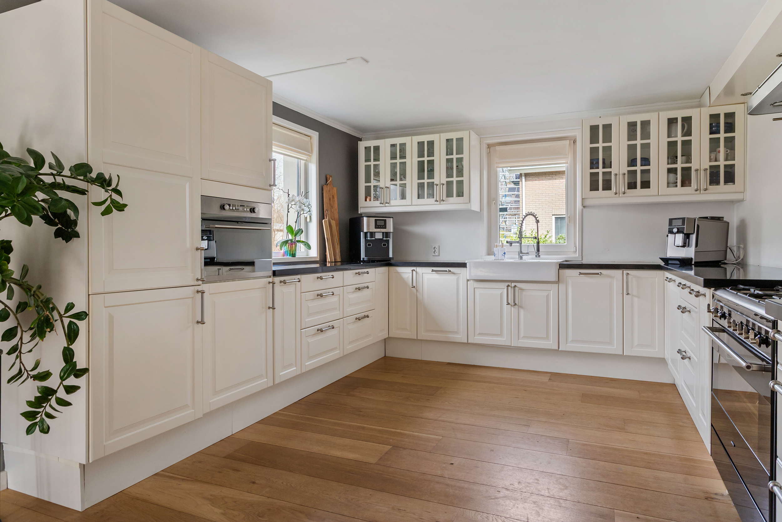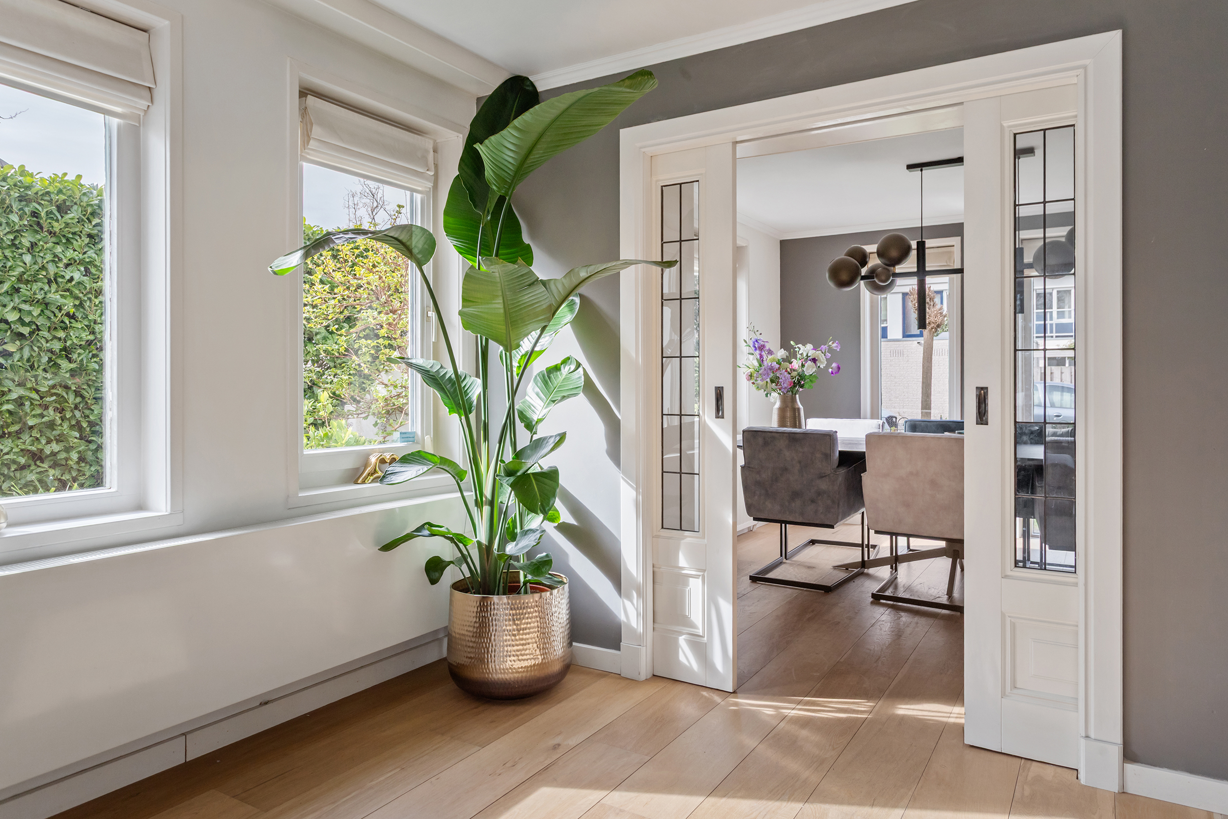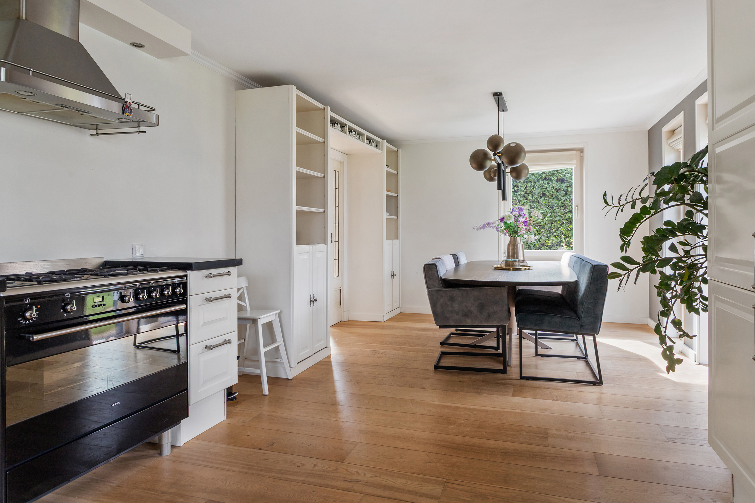 De woonkamer en de woonkeuken worden van elkaar gescheiden door en-suite deuren met karakteristieke glas-in-looddetails, waardoor je eenvoudig kunt kiezen tussen een open indeling of juist meer beslotenheid.