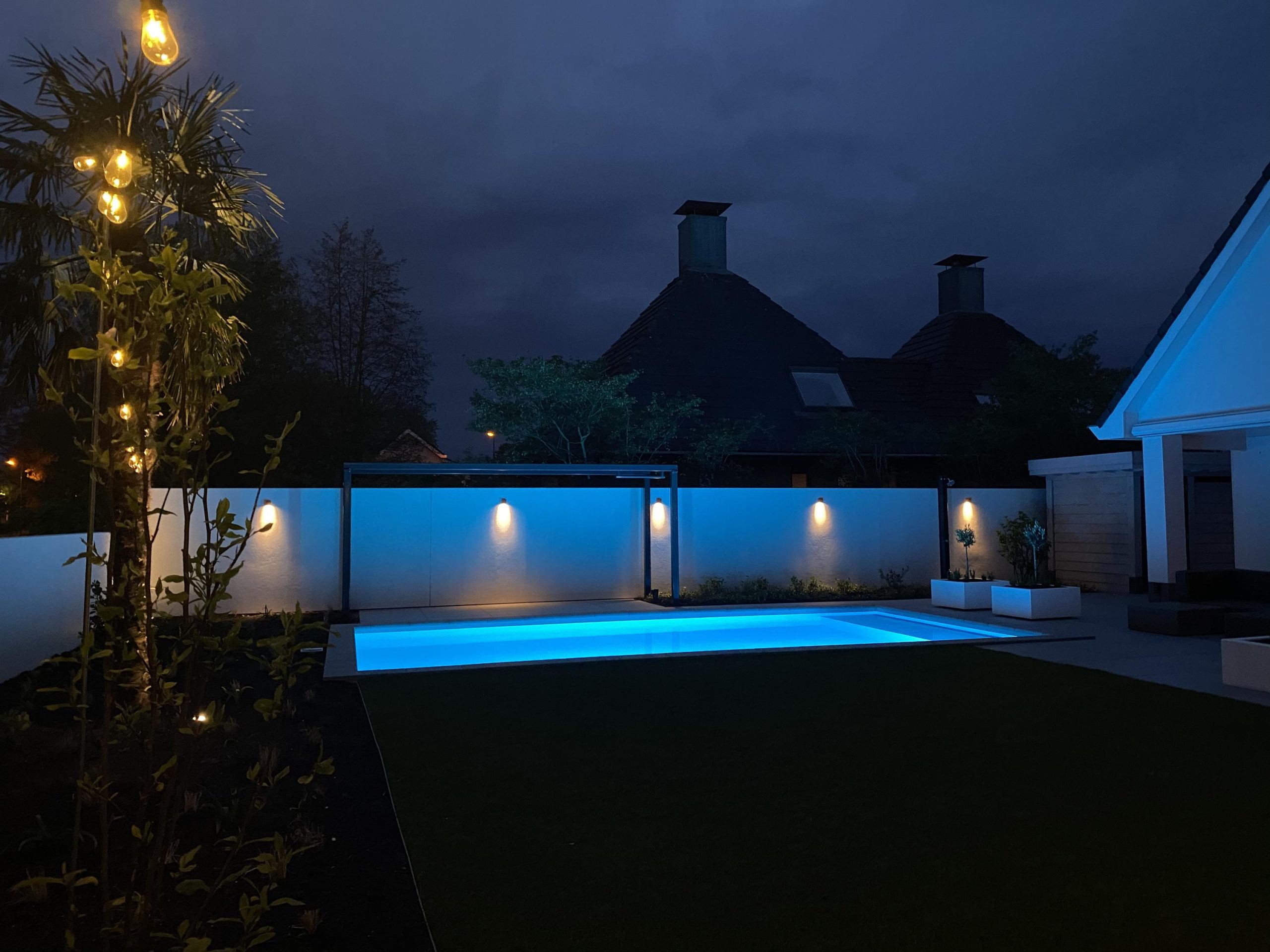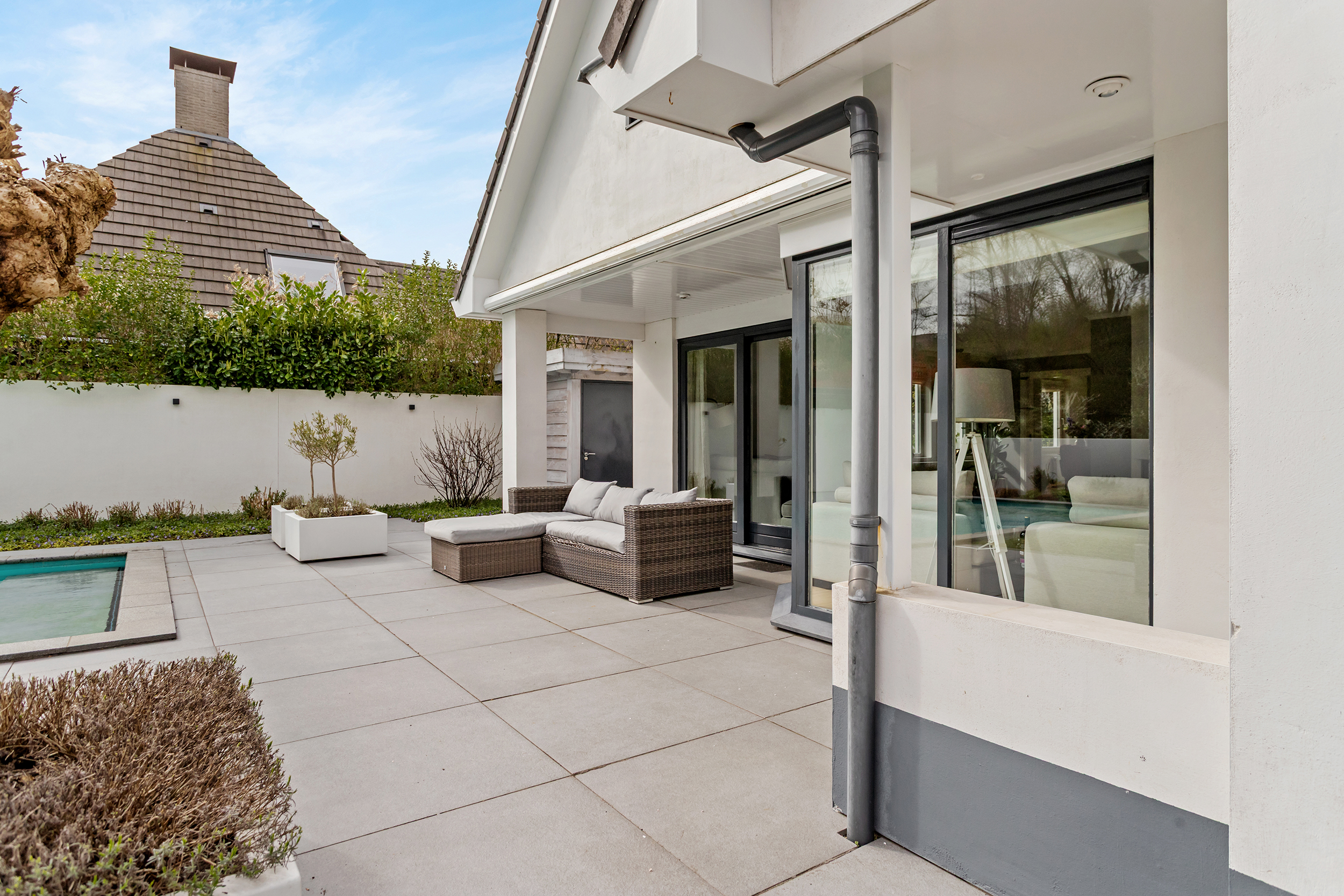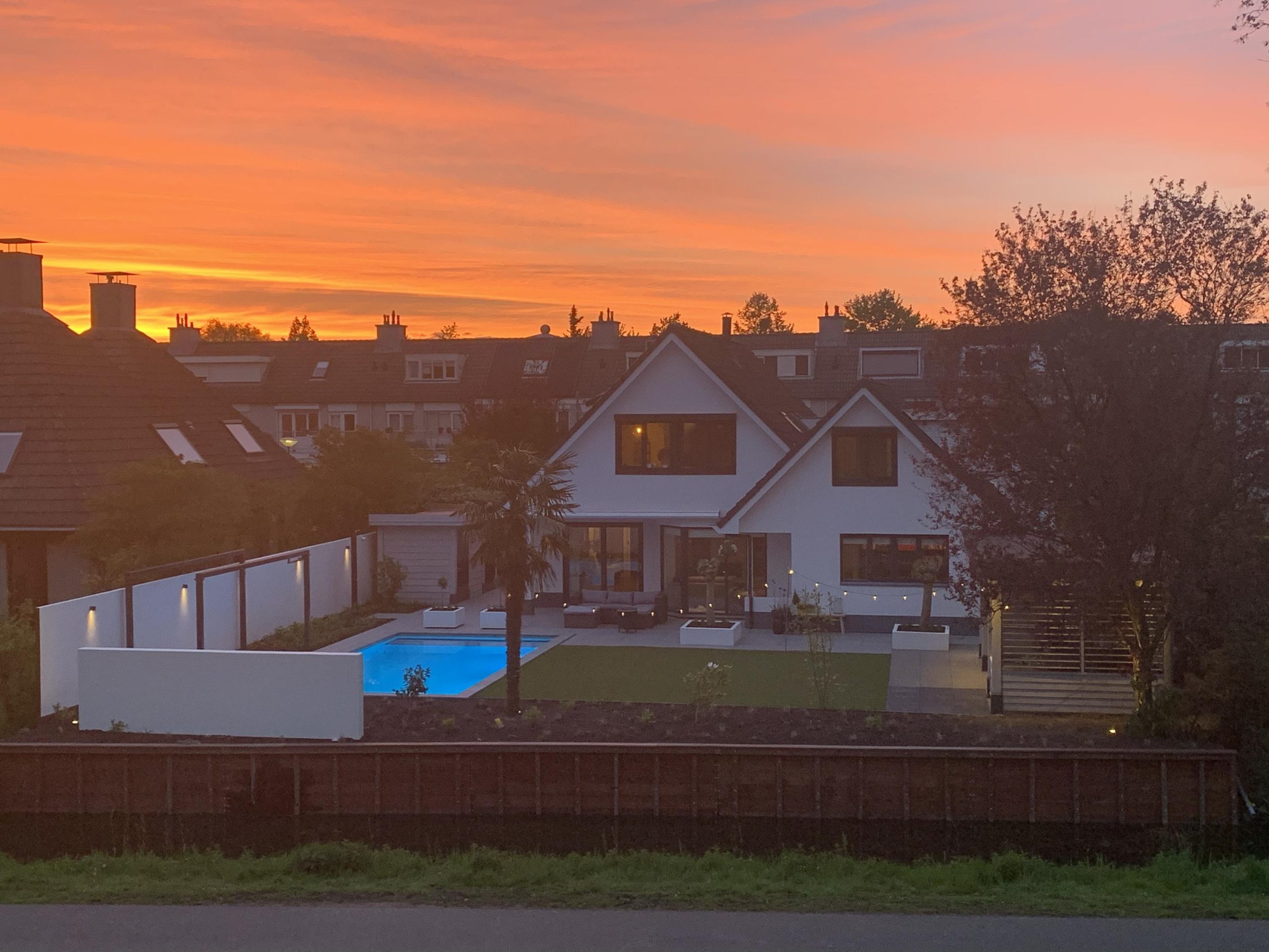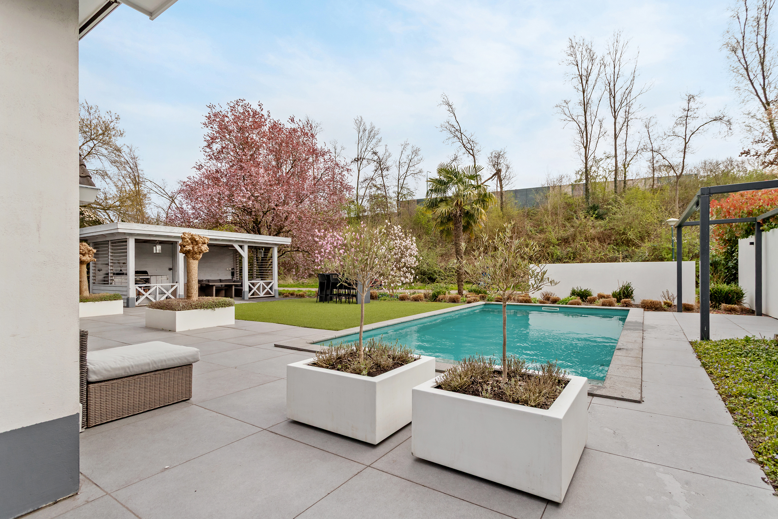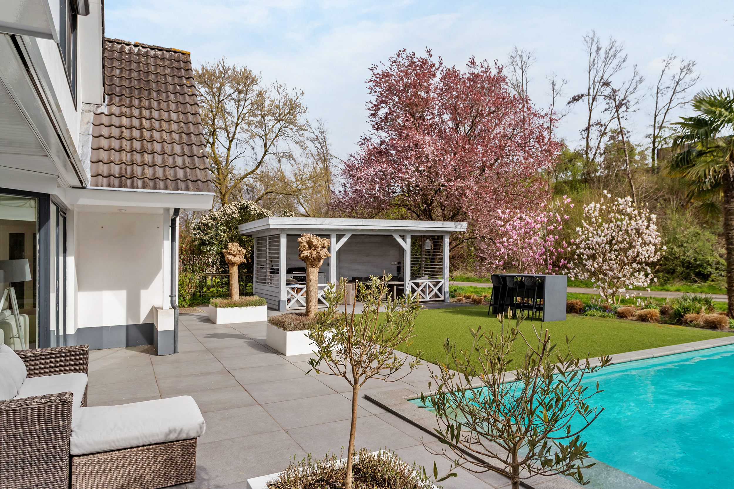 De tuin is royaal opgezet en fraai aangelegd met een mooie afwisseling van groen, gazon en strakke terrassen. Met de ligging op het zuiden geniet je hier de hele dag van de zon. Direct aan de woning ligt een ruim terras waar je moeiteloos lange dagen buiten doorbrengt, met het zwembad als absoluut middelpunt. Hier begint de dag met een kop koffie in de zon en eindigt hij met een verfrissende duik op een warme avond.