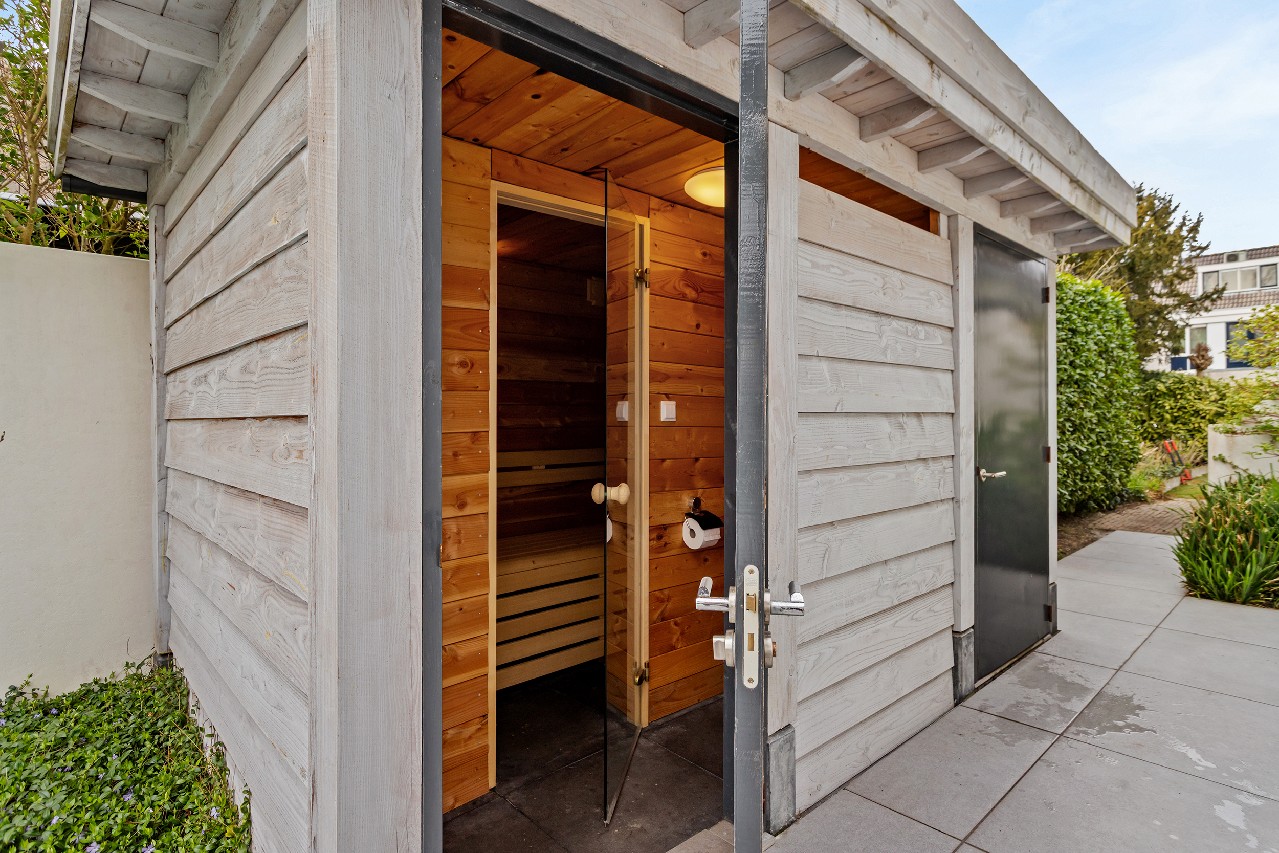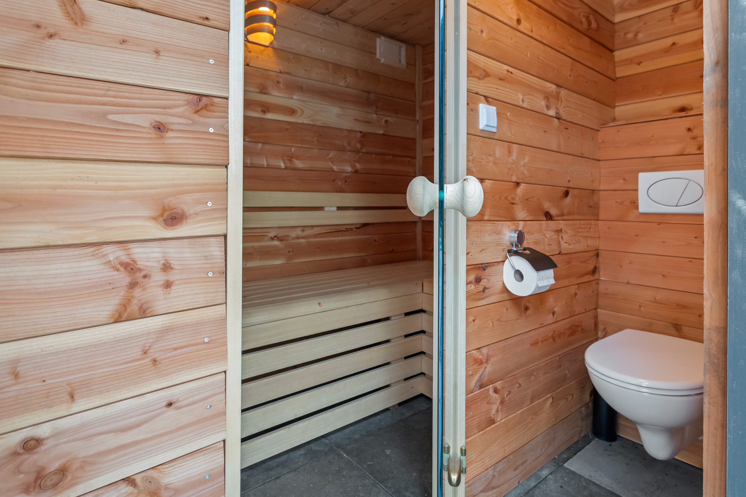 De eigen wellnessruimte met sauna, douche en toilet maakt het geheel compleet – een zeldzaam niveau van comfort in je eigen achtertuin.