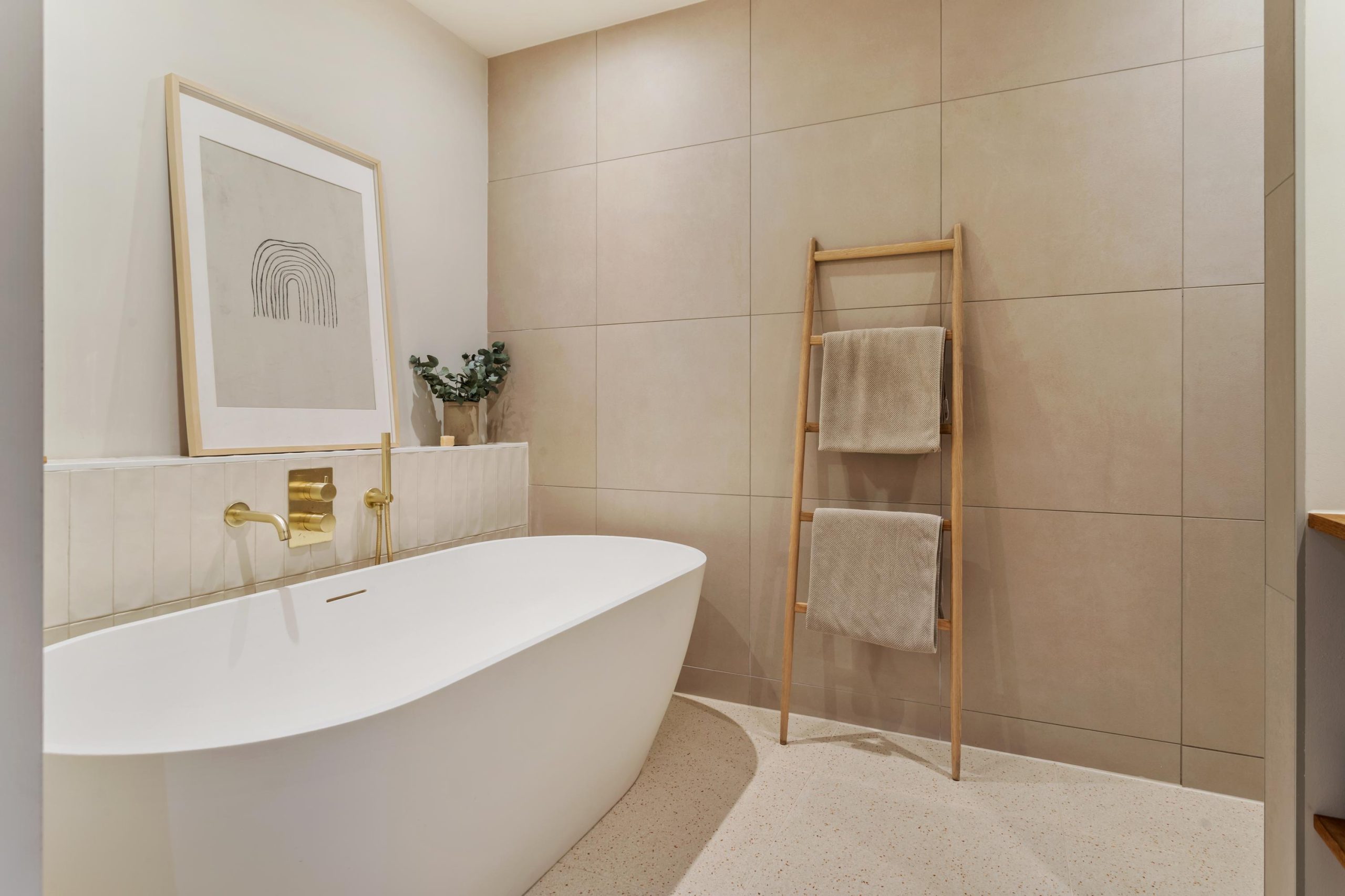 De eerste badkamer is heerlijk ruim en uitgerust met een vrijstaand ligbad, een royale inloop regendouche en een elegant wastafelmeubel. De combinatie van zachte kleurtinten, lichte wandtegels en verfijnde messing details creëert een ontspannen, bijna spa-achtige sfeer waarin je direct tot rust komt.