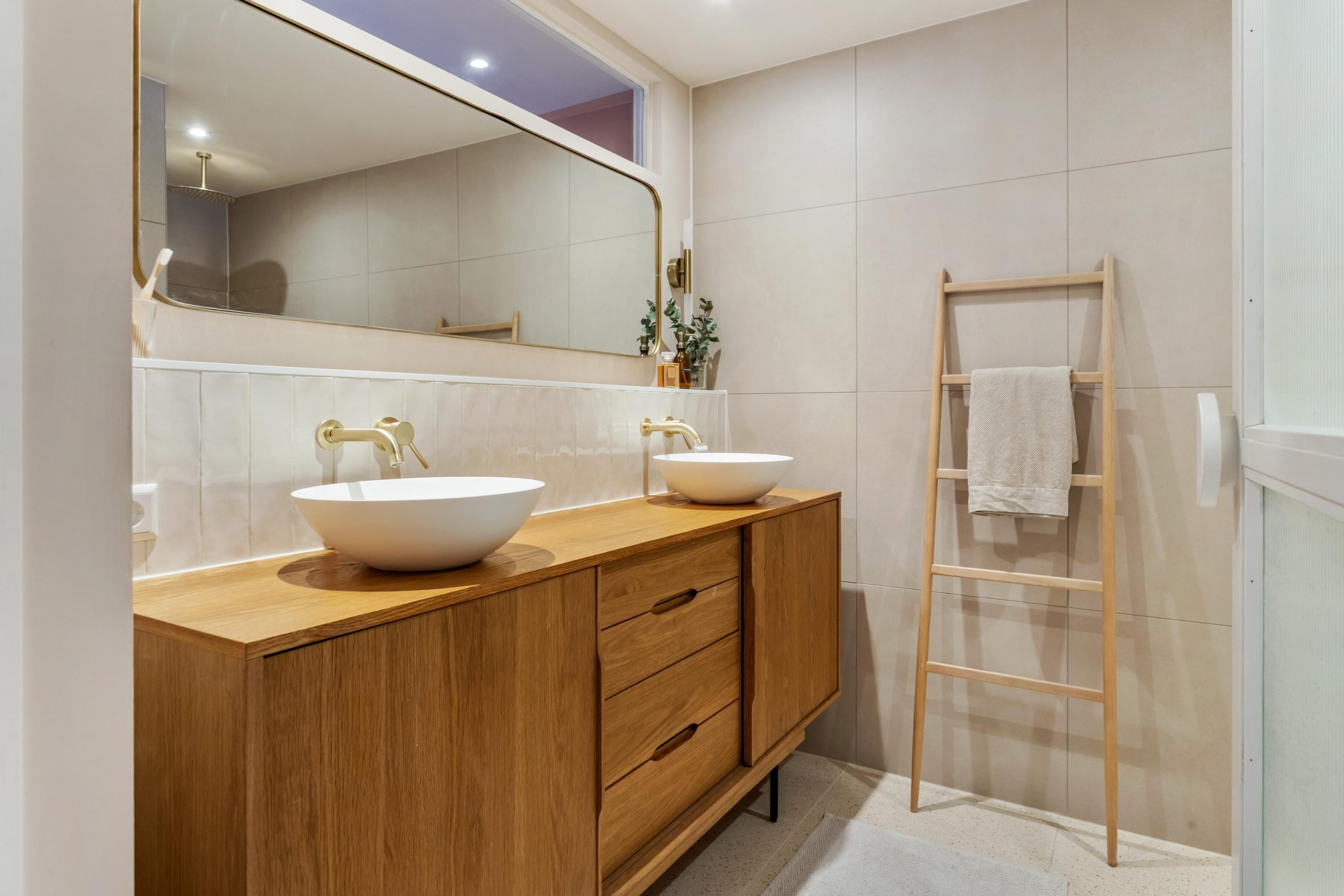 De woning beschikt over twee stijlvol afgewerkte badkamers en een separaat toilet – elk met een eigen sfeer en indeling, maar samen één harmonieus geheel.