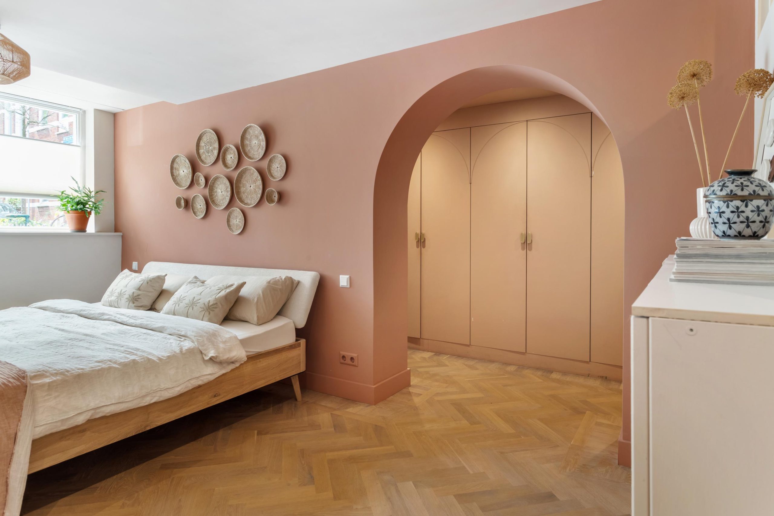 De hoofdslaapkamer is een oase van rust en comfort. De zachte kleurtinten, het natuurlijke licht en de fraai afgewerkte boogdoorgang naar de op maat gemaakte inbouwkasten geven de kamer een luxueuze uitstraling.