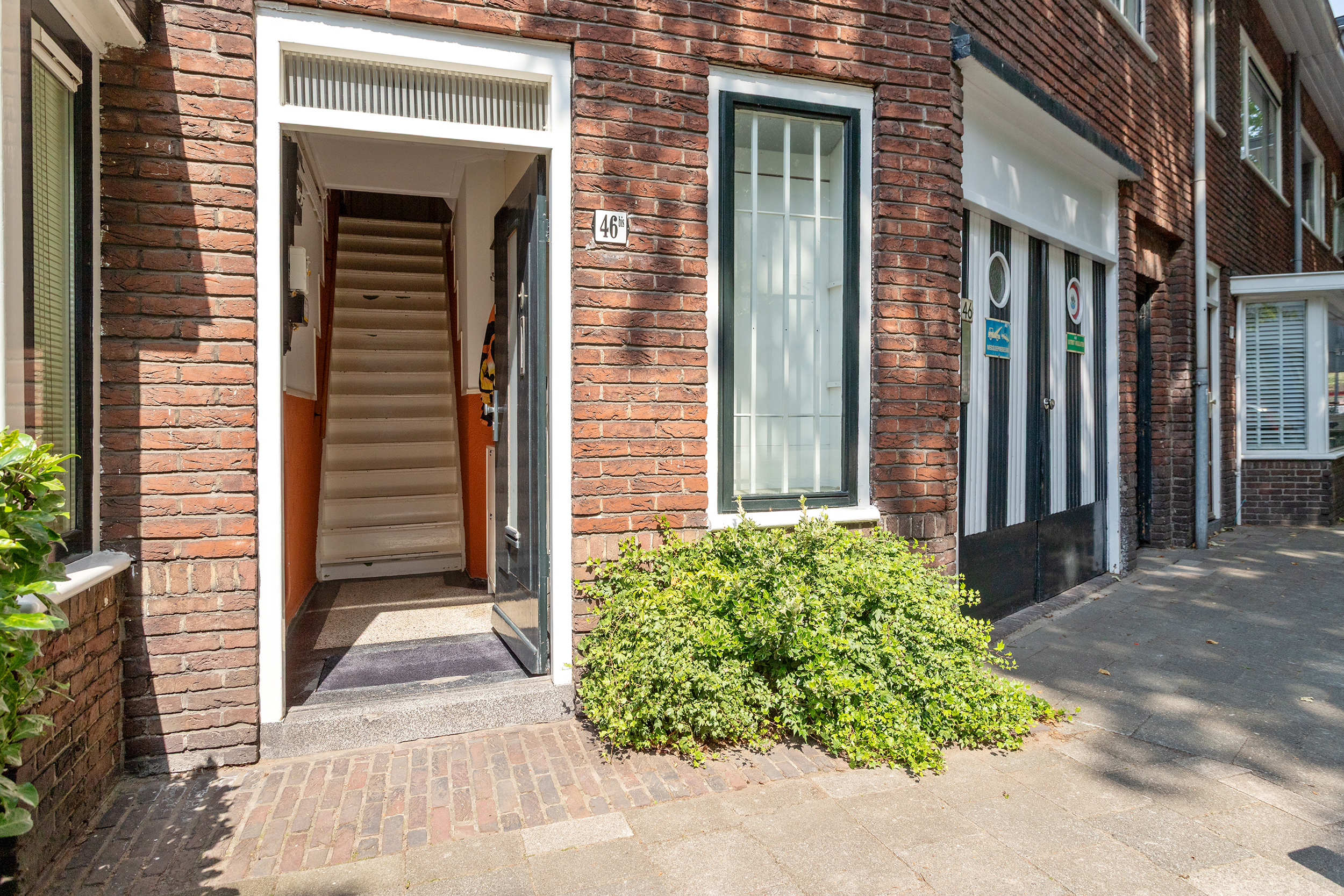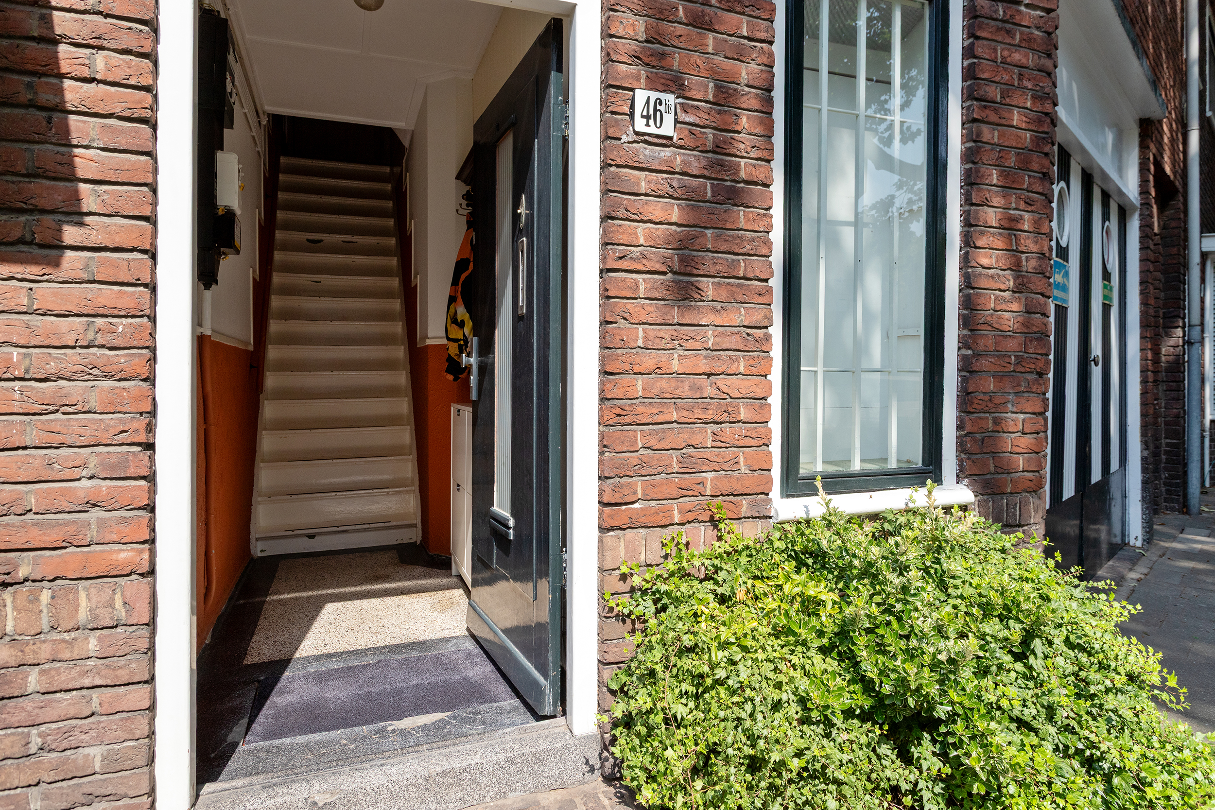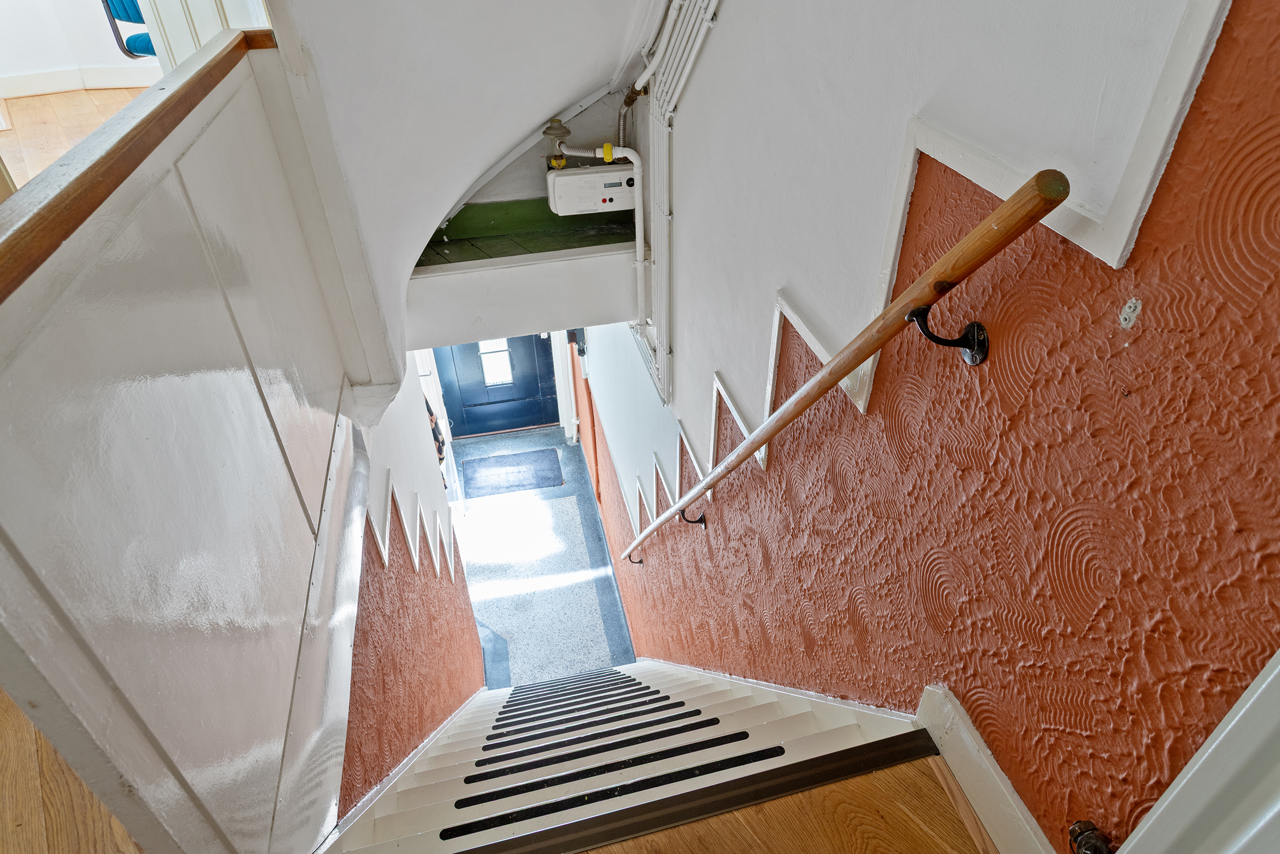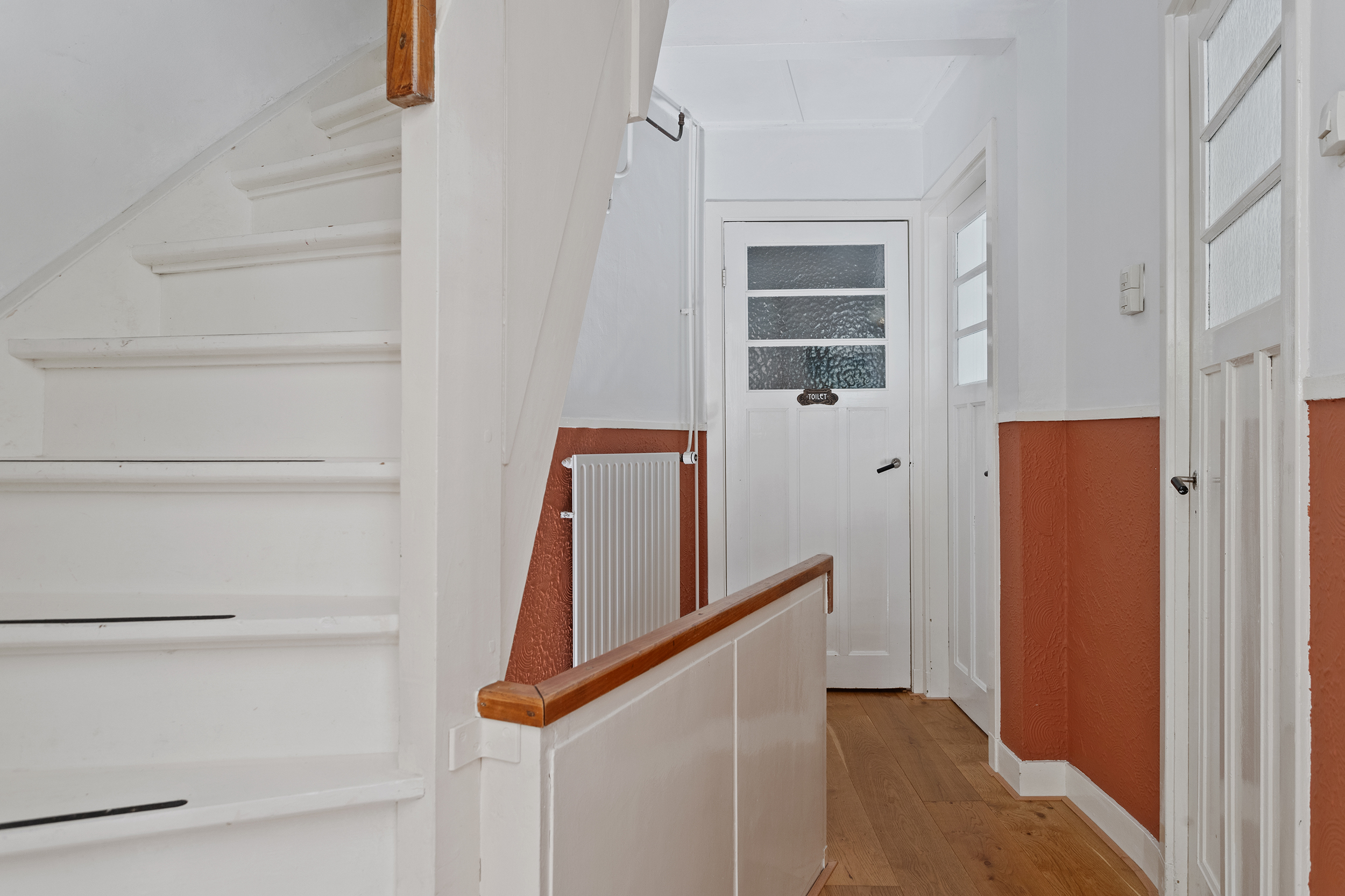 Eigen entree met trapopgang naar de eerste verdieping. Al bij binnenkomst proef je de jaren ’30 sfeer door het originele betonnen terrazzo met emaille afwerking.
