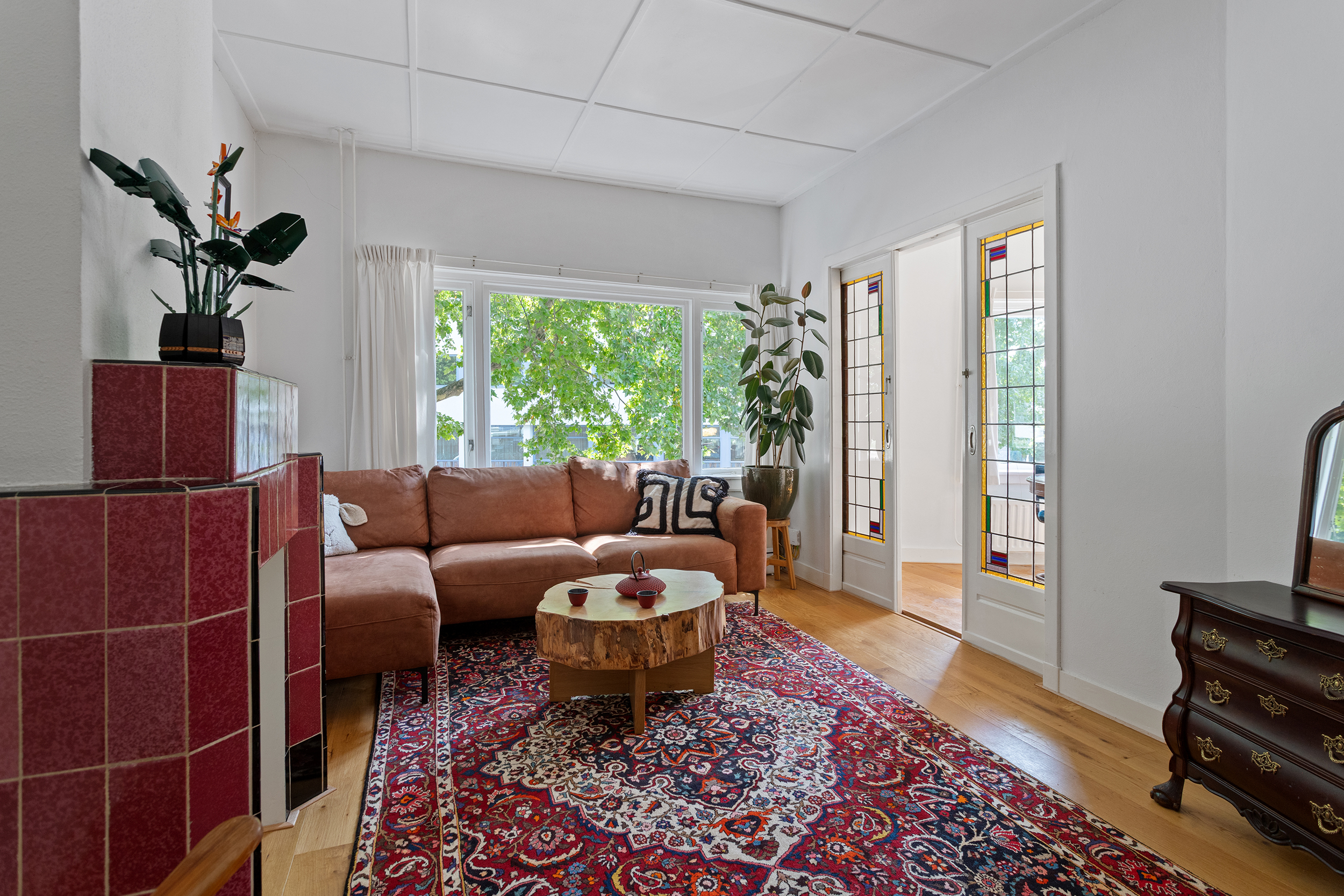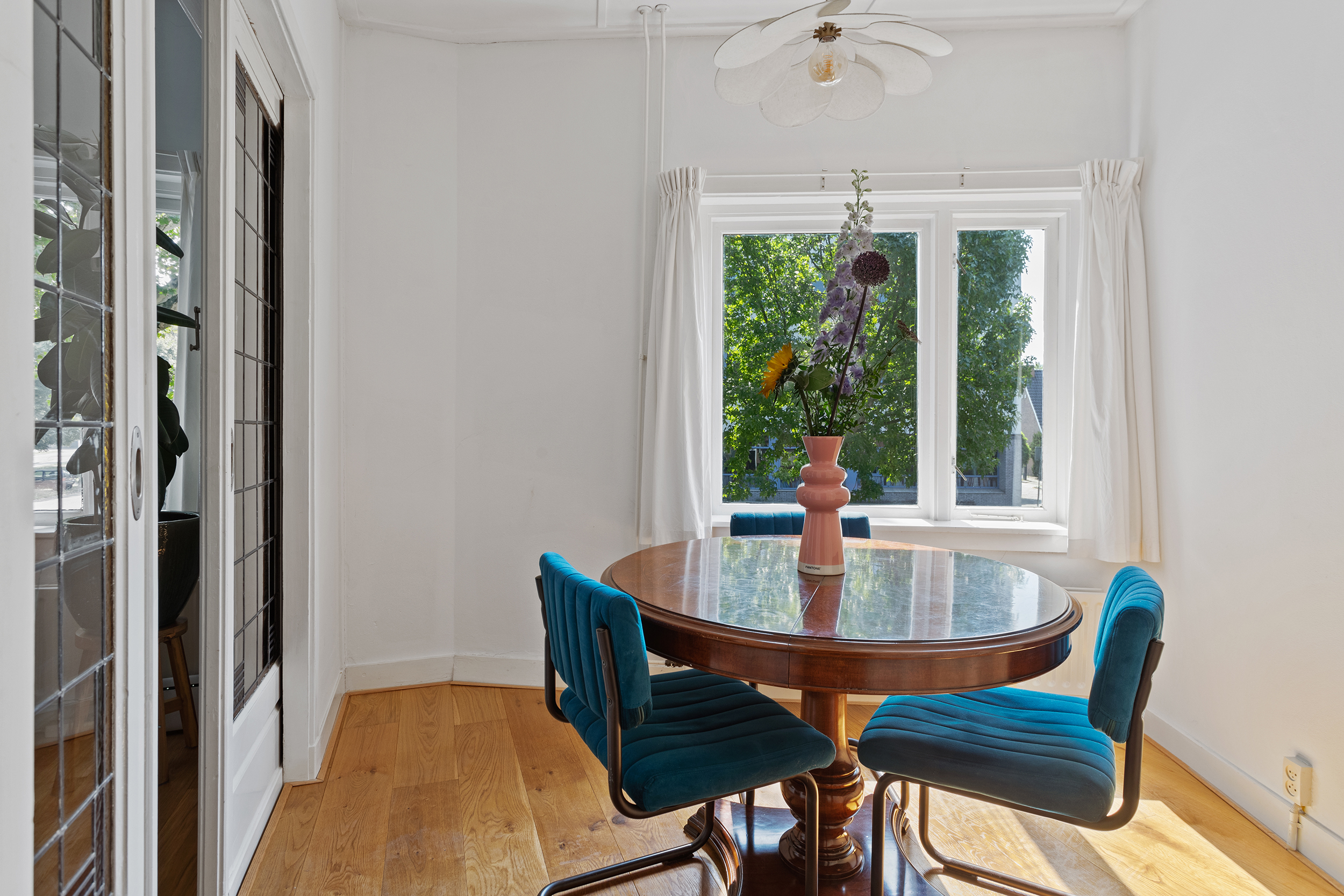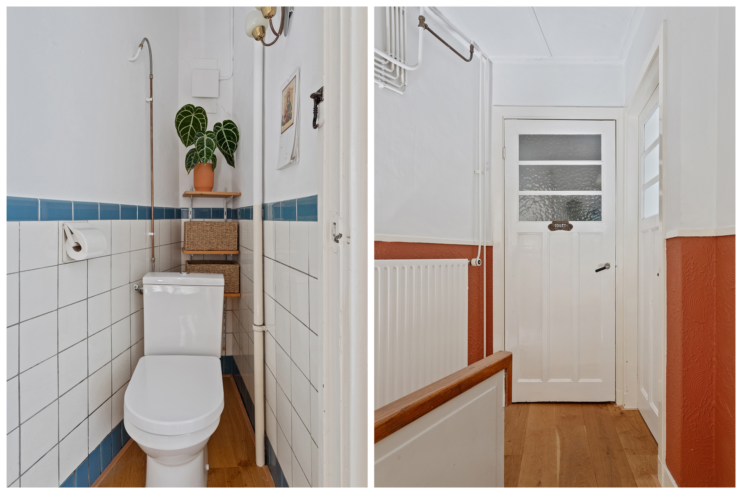 De overloop geeft toegang tot het toilet en de woonvertrekken. De woonkamer straalt warmte en sfeer uit, met een prachtige licht eikenhouten vloer van brede planken, twee vaste kasten en een originele schouw als blikvanger. Via de karaktervolle schuifdeuren met glas-in-lood bereik je de eetkamer – een heerlijke plek voor een grote eettafel om uitgebreid te dineren of borrelen met vrienden en familie.