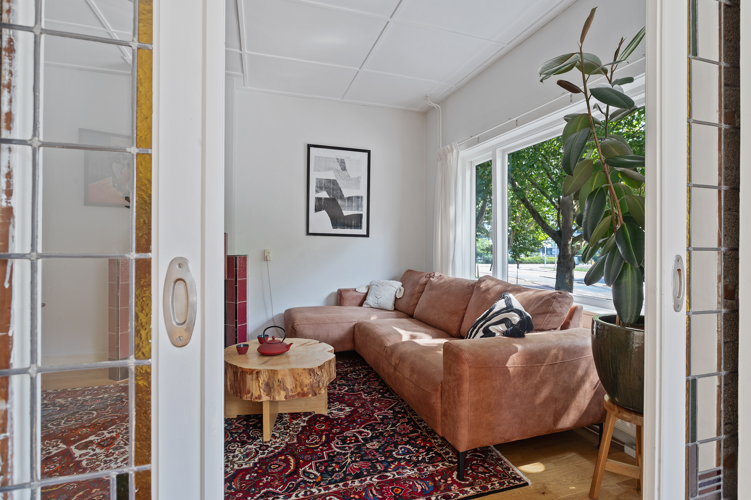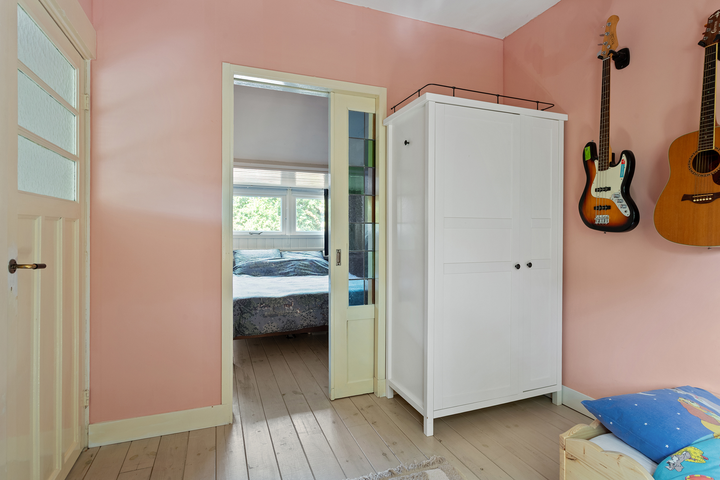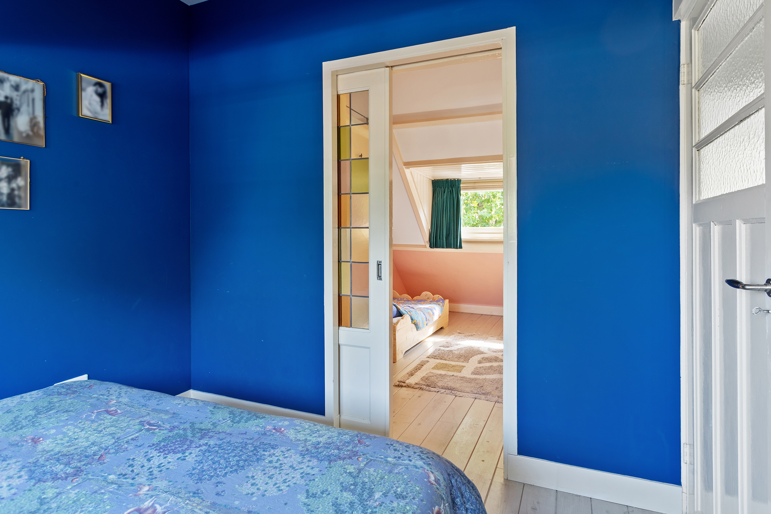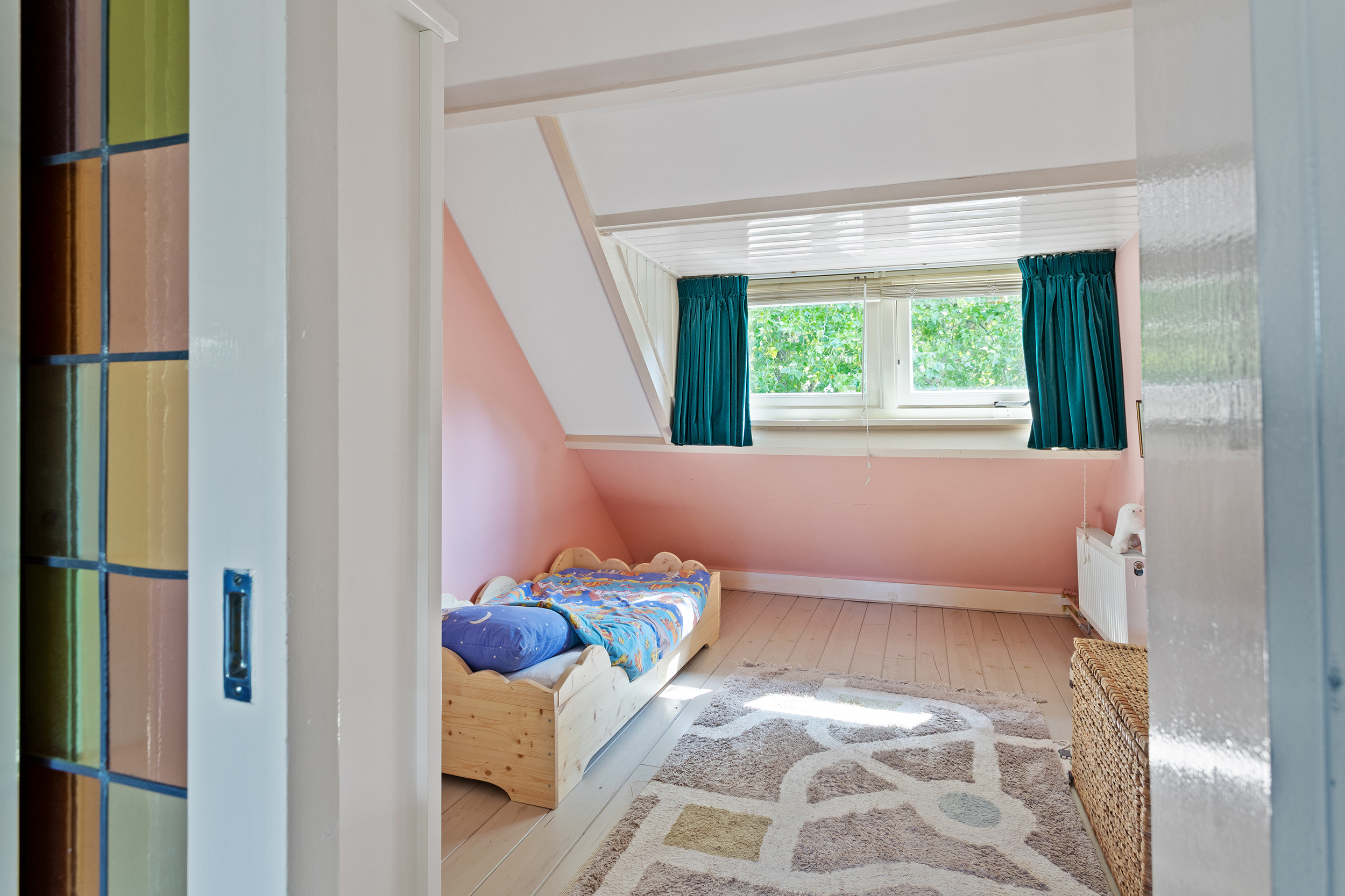 De overloop geeft toegang tot het toilet en de woonvertrekken. De woonkamer straalt warmte en sfeer uit, met een prachtige licht eikenhouten vloer van brede planken, twee vaste kasten en een originele schouw als blikvanger. Via de karaktervolle schuifdeuren met glas-in-lood bereik je de eetkamer – een heerlijke plek voor een grote eettafel om uitgebreid te dineren of borrelen met vrienden en familie.