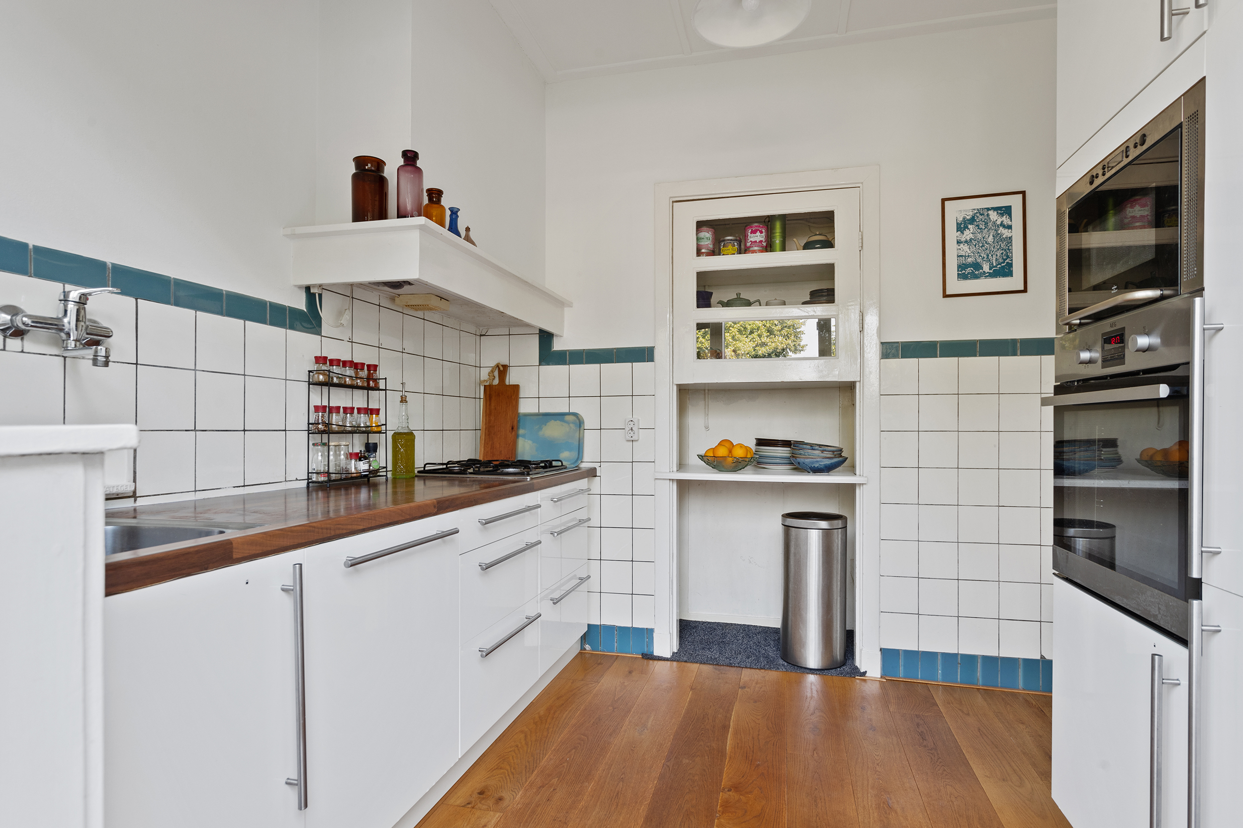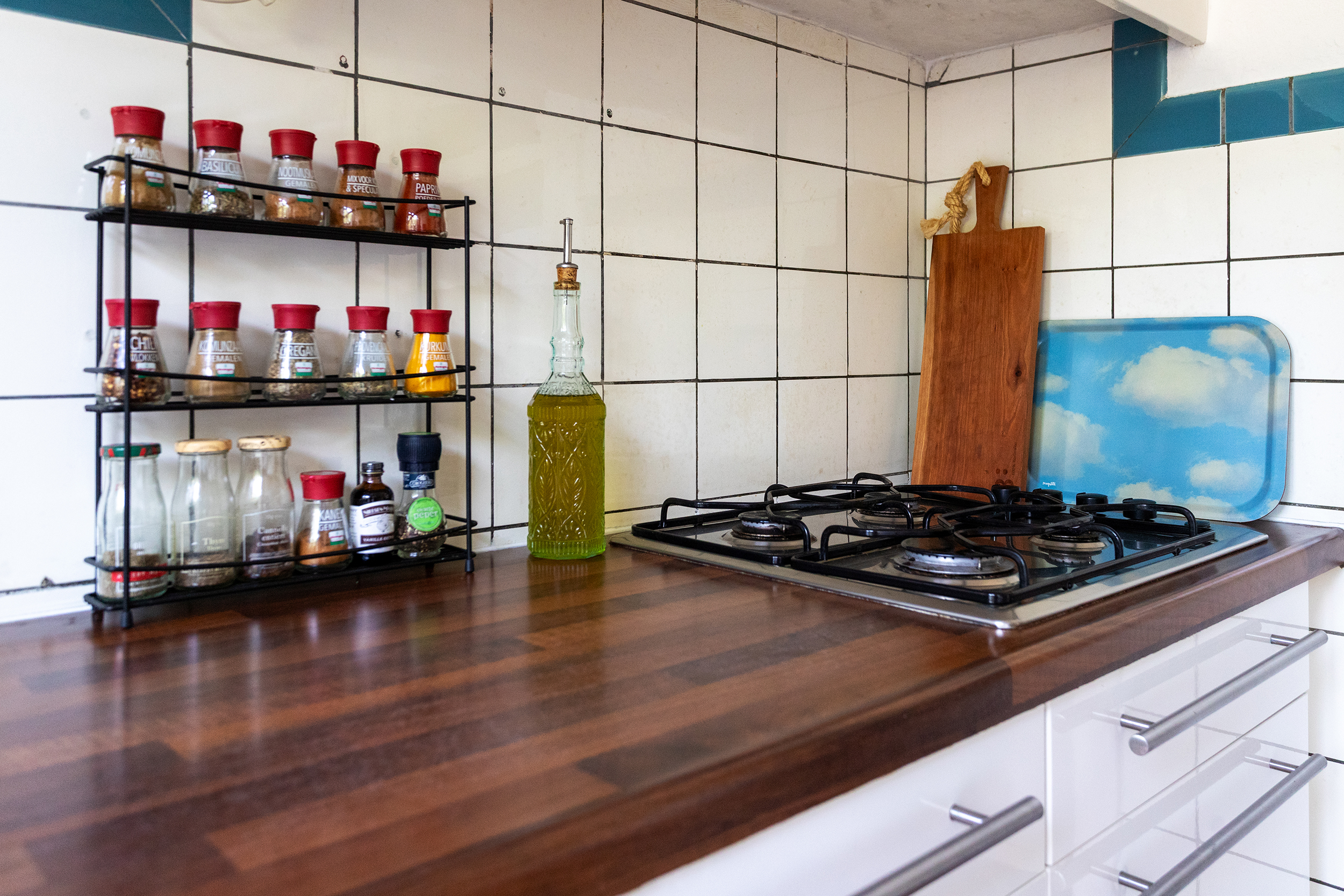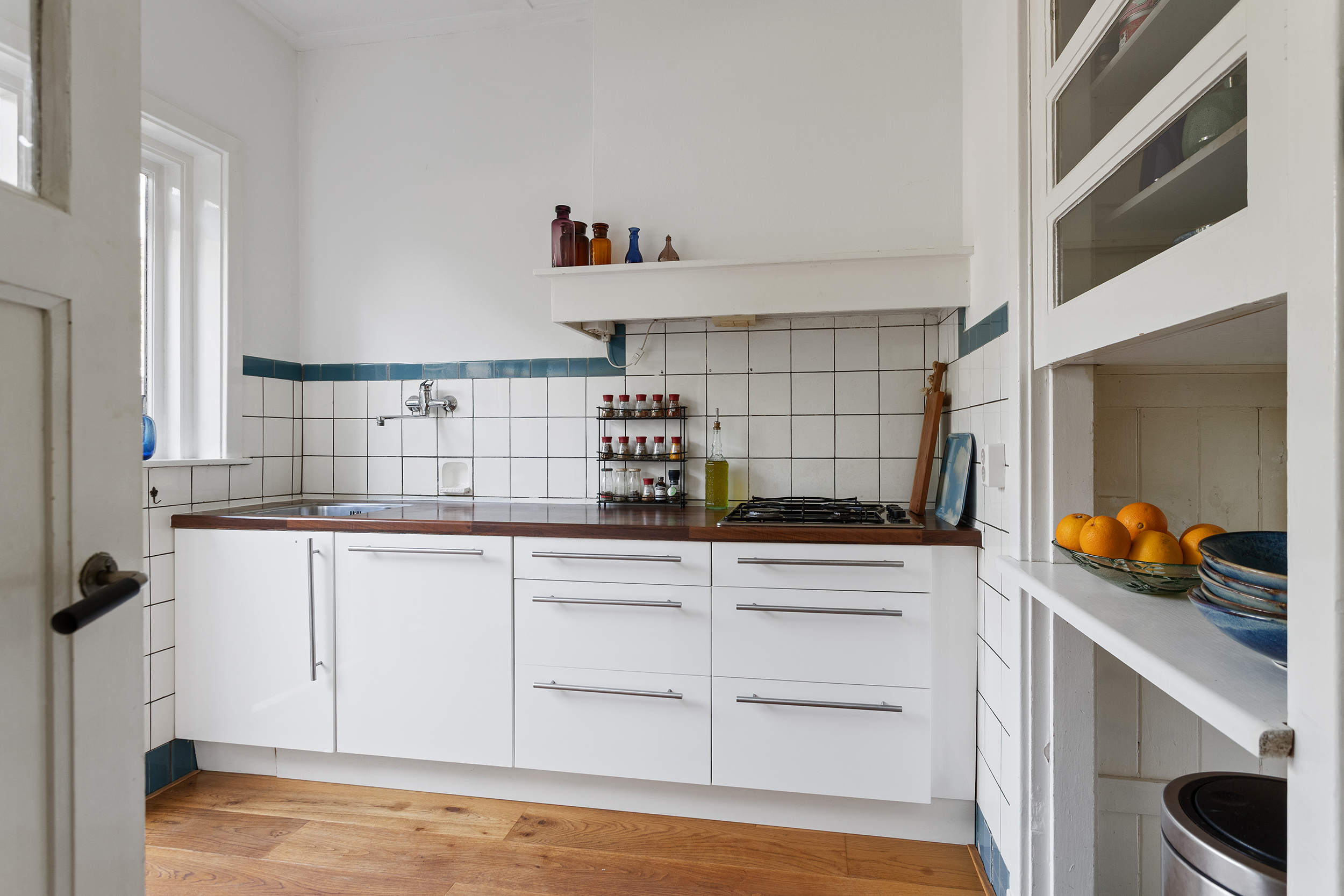 De keuken combineert functionaliteit met charme: een praktische inrichting met vernieuwde inbouwapparatuur, omlijst door originele tegels die de ruimte extra karakter geven. Vanuit de keuken loop je zo het balkon op, gelegen op het noordwesten – dé perfecte plek om in de namiddagzon te genieten van een drankje.