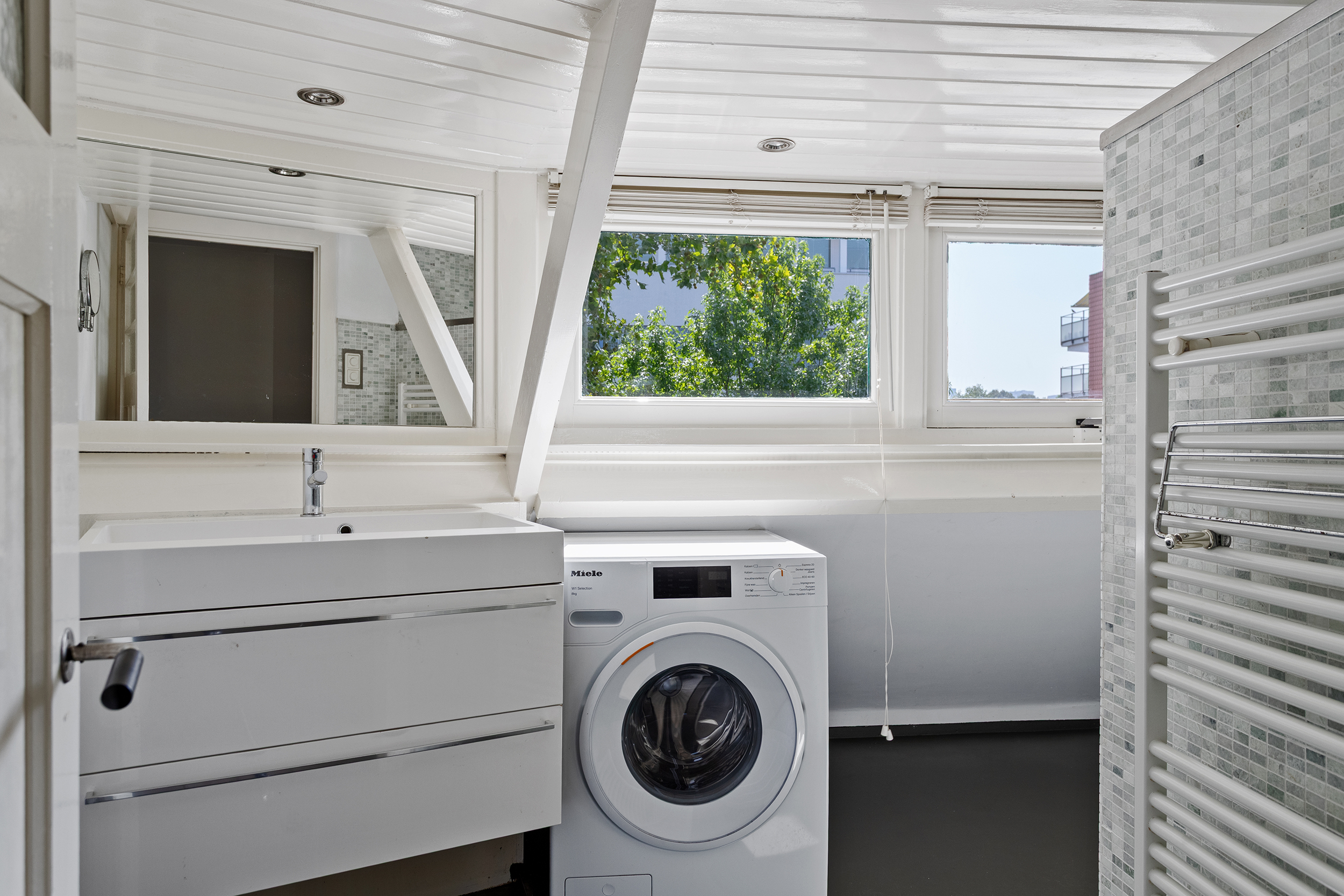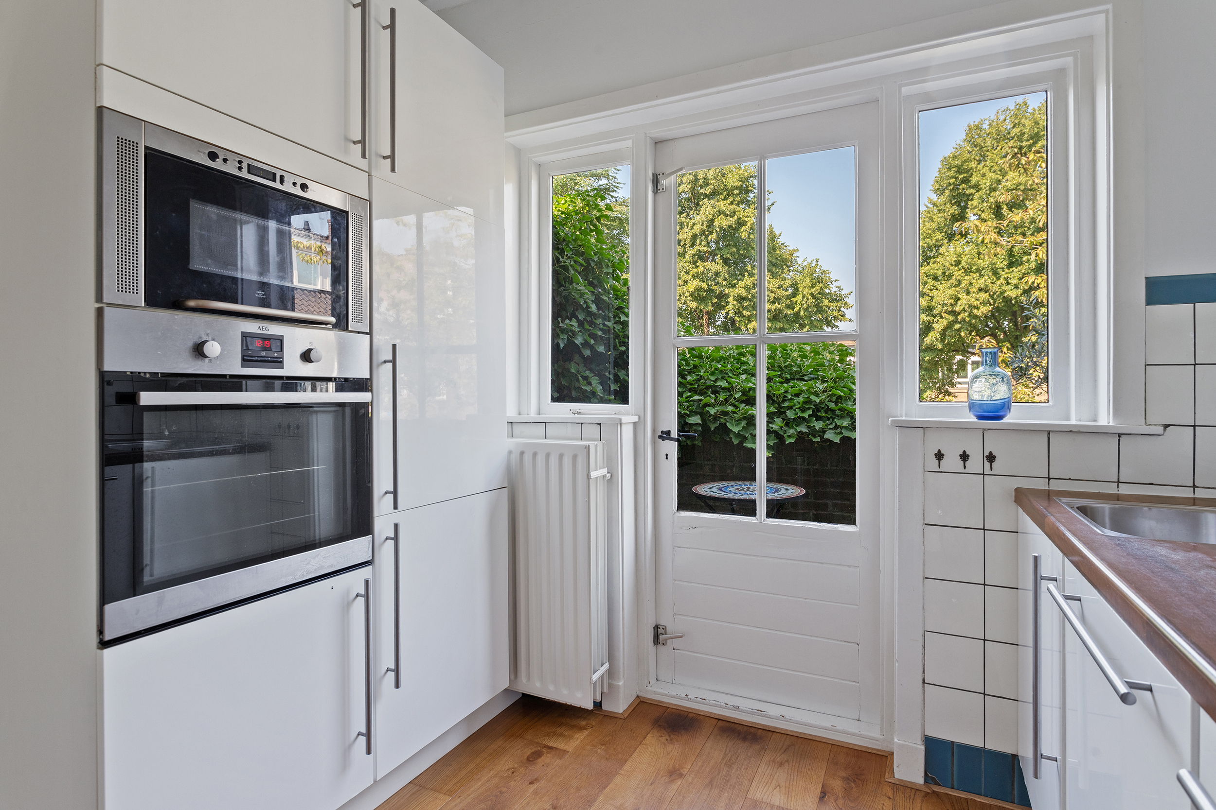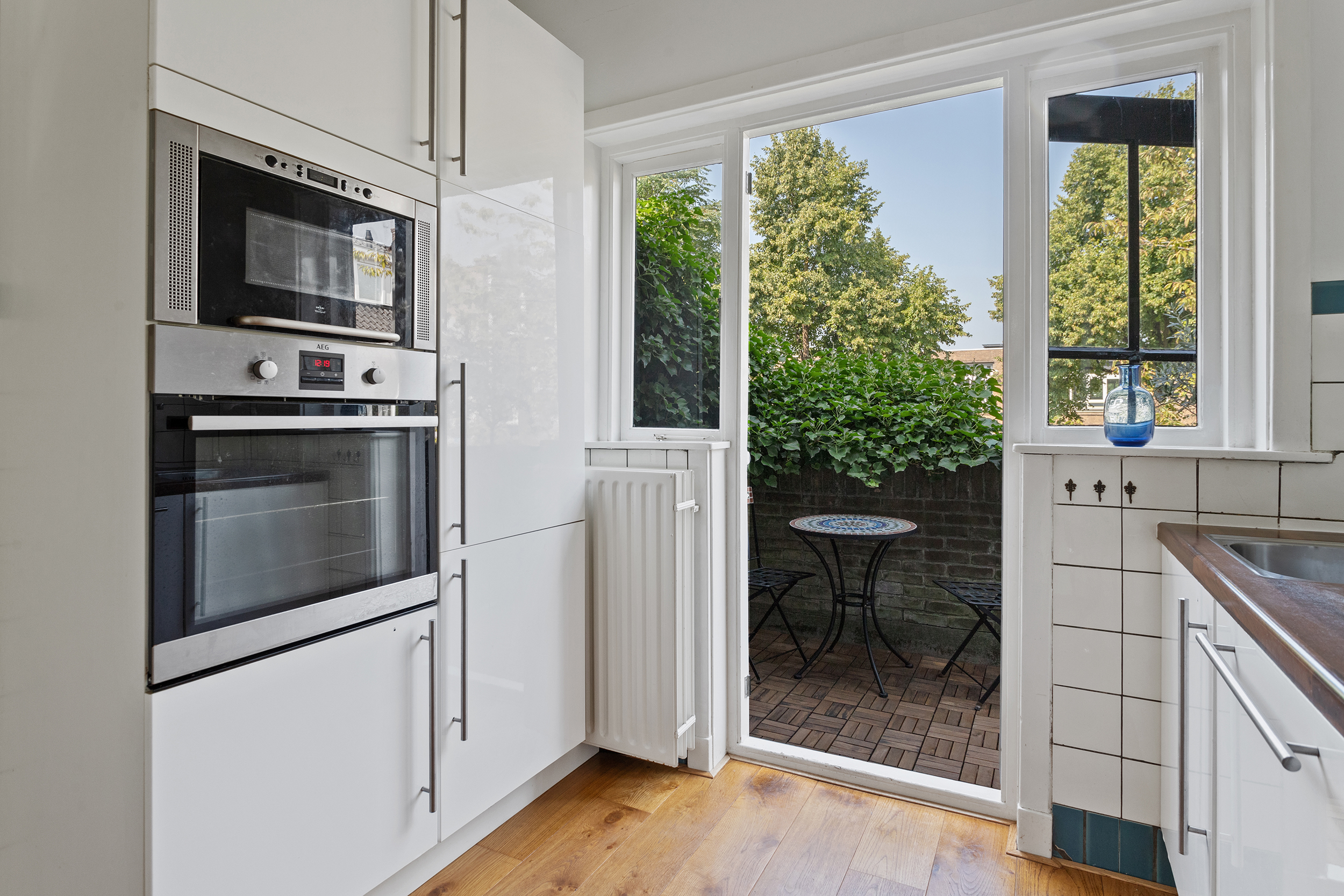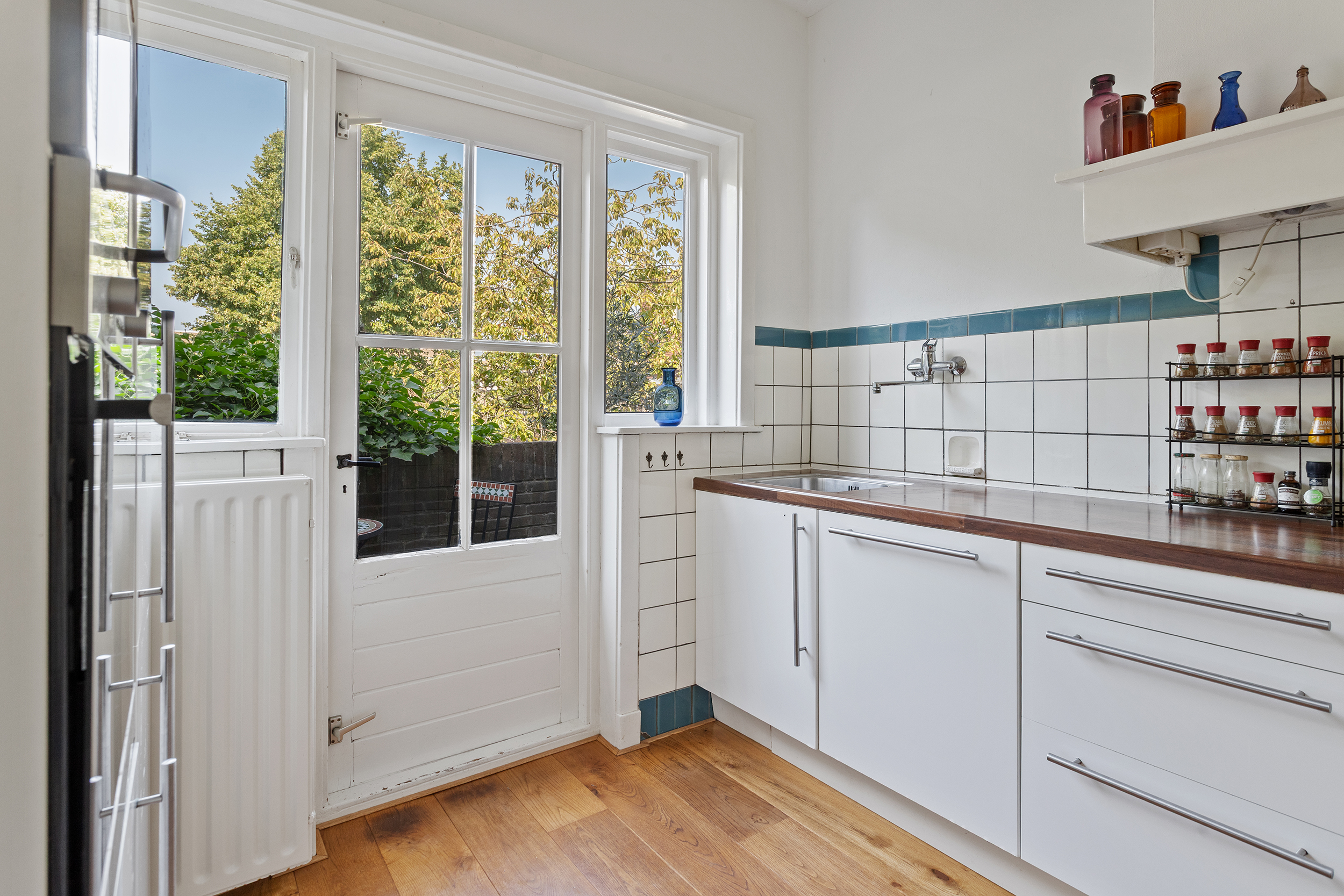 De keuken combineert functionaliteit met charme: een praktische inrichting met vernieuwde inbouwapparatuur, omlijst door originele tegels die de ruimte extra karakter geven. Vanuit de keuken loop je zo het balkon op, gelegen op het noordwesten – dé perfecte plek om in de namiddagzon te genieten van een drankje.