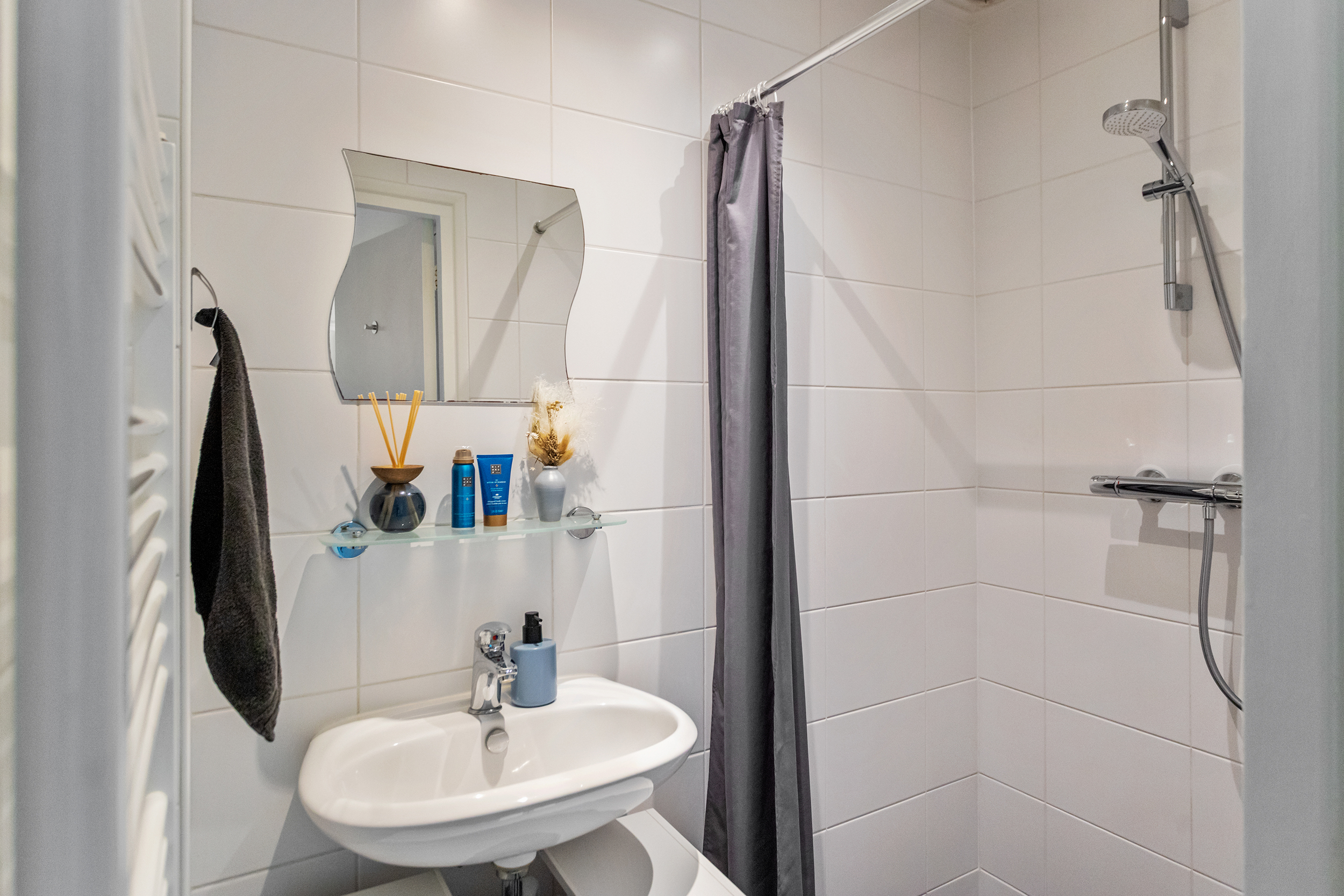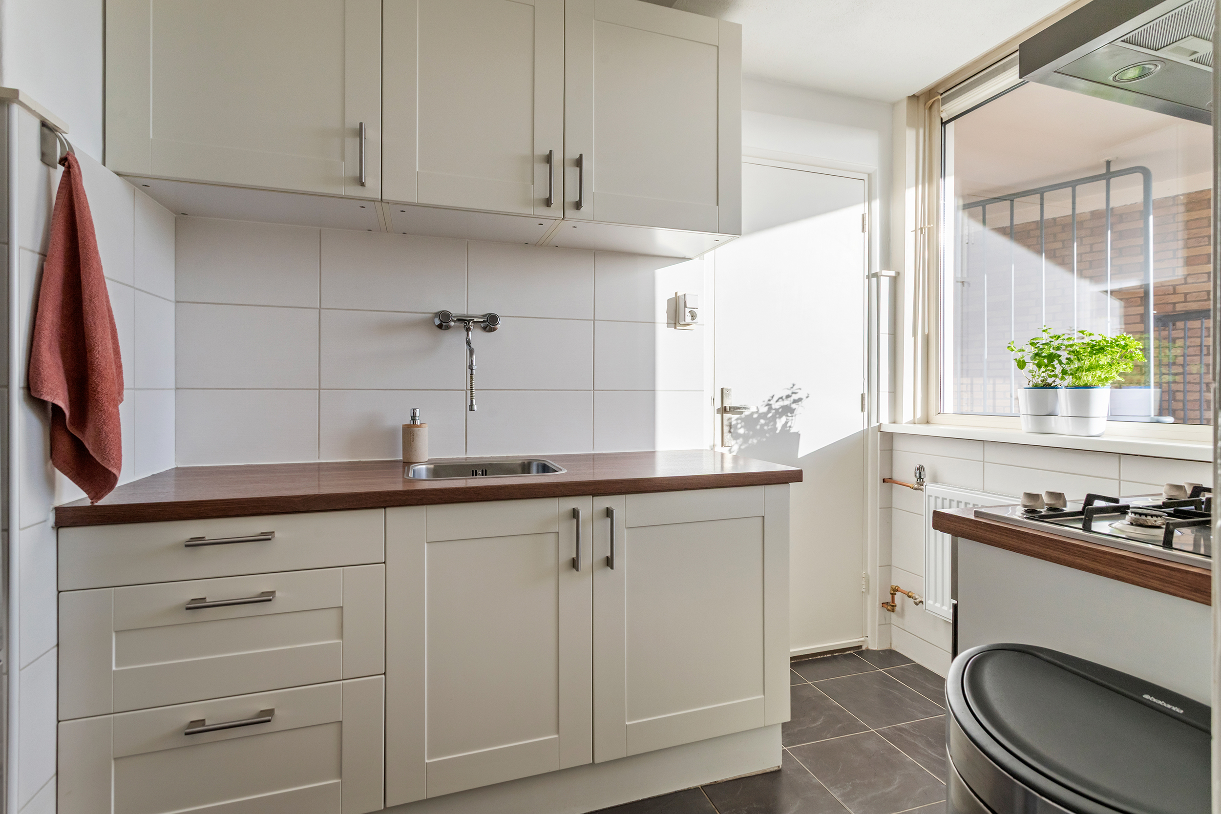 De keuken is gelegen aan de voorzijde van het appartement en is tijdloos uitgevoerd en van alle gemakken voorzien. Aansluitend aan de keuken ligt de bijkeuken, een praktische ruimte met een vaatwasser, wasmachine en droger. De nette badkamer is voorzien van een douche, wastafel en designradiator. Het toilet is separaat van de badkamer.