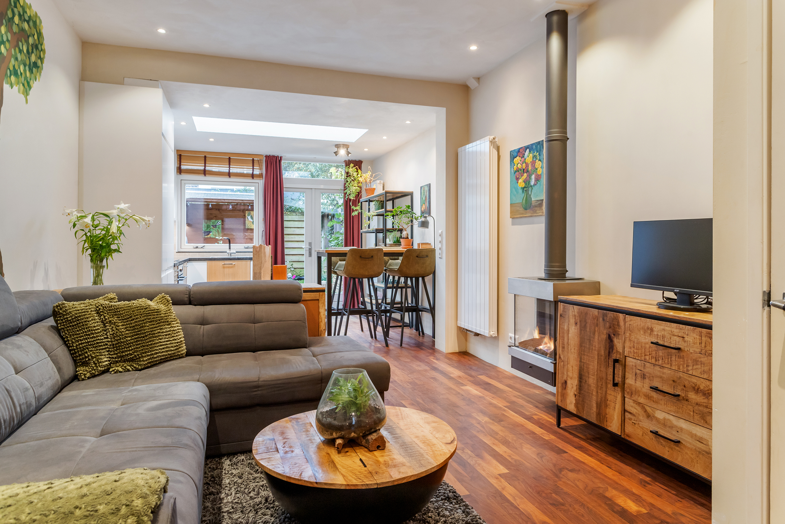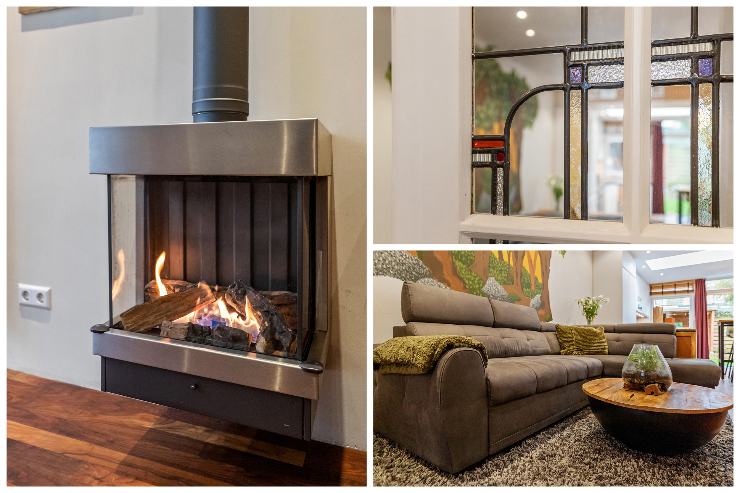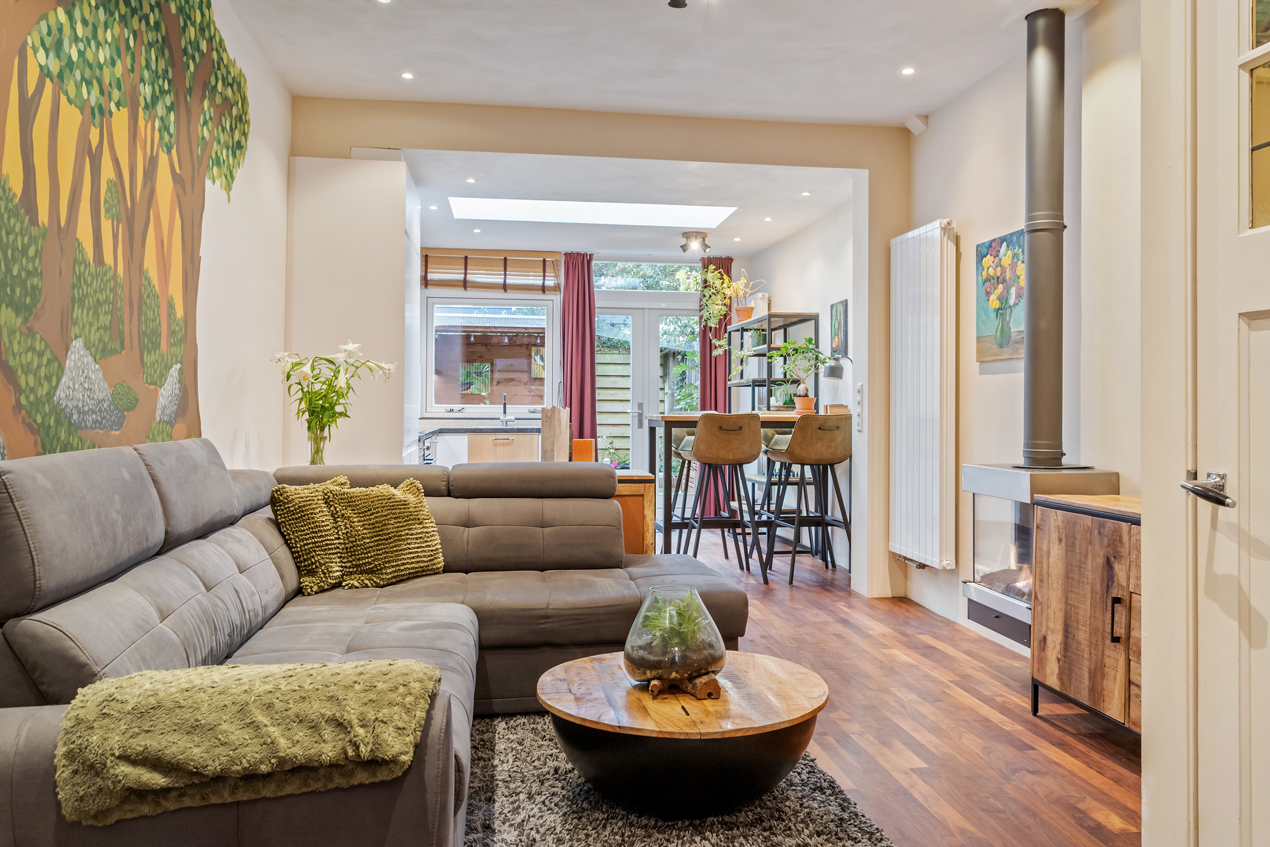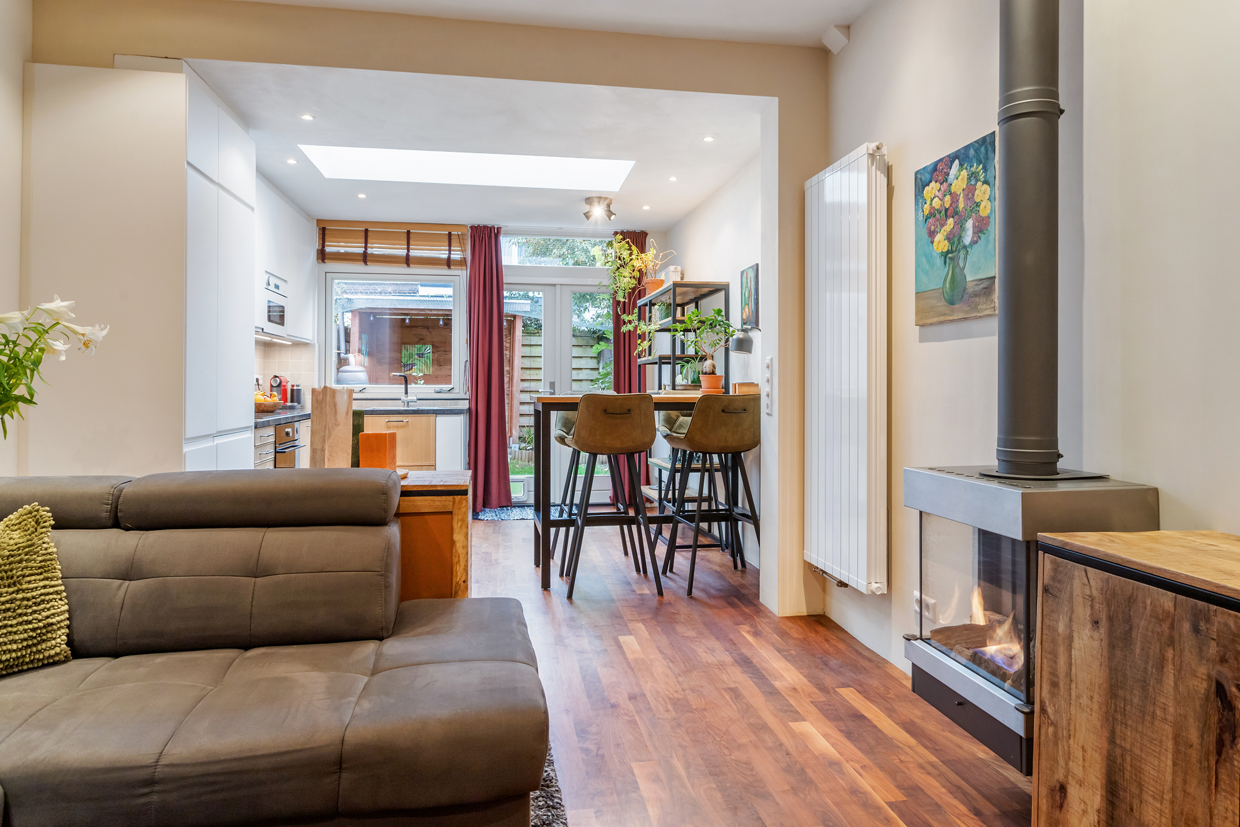 Je komt binnen in de hal, die toegang biedt tot het toilet en de royale leefruimte. Dankzij de klassieke en-suite met vaste kasten en glas-in-lood schuifdeuren is de ruimte eenvoudig op te delen in twee afzonderlijke kamers. Aan de voorzijde kun je een knusse zithoek creëren, terwijl je aan de achterzijde geniet van een open en lichte leefruimte die je helemaal naar eigen wens kunt inrichten. De voorkamer kan tevens gebruikt worden als apart kantoor, of werkruimte aan huis. Via deze voorkamer heb je ook toegang tot de diepe trappenkast waar voldoende ruimte is voor bijvoorbeeld de stofzuiger of extra voorraad. De prachtige houten vloer en de gashaard geven de kamer een warm en uitnodigend karakter. Door de grote raampartijen aan de voor- én achterzijde, én het dakraam, baadt de ruimte bovendien in het licht.