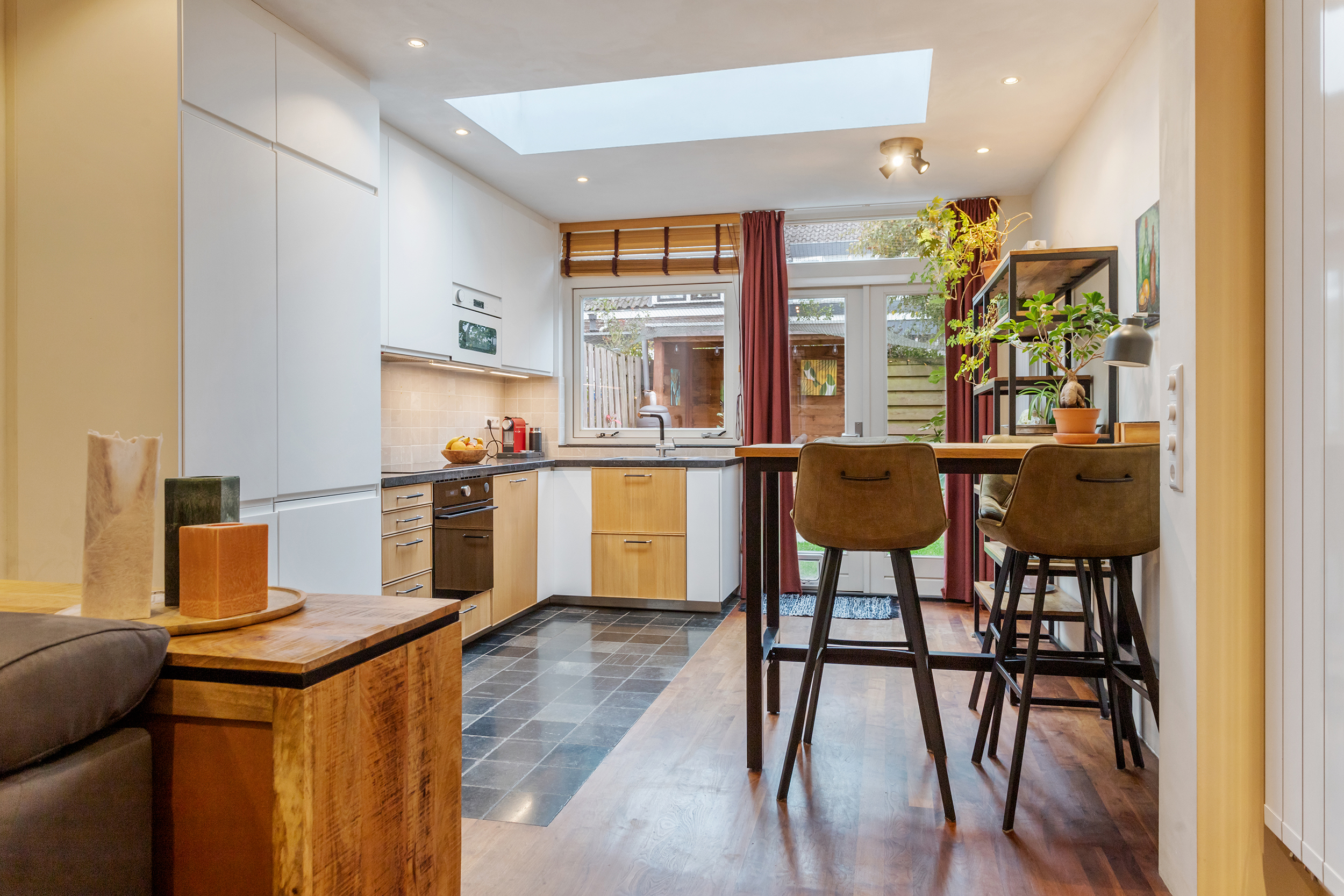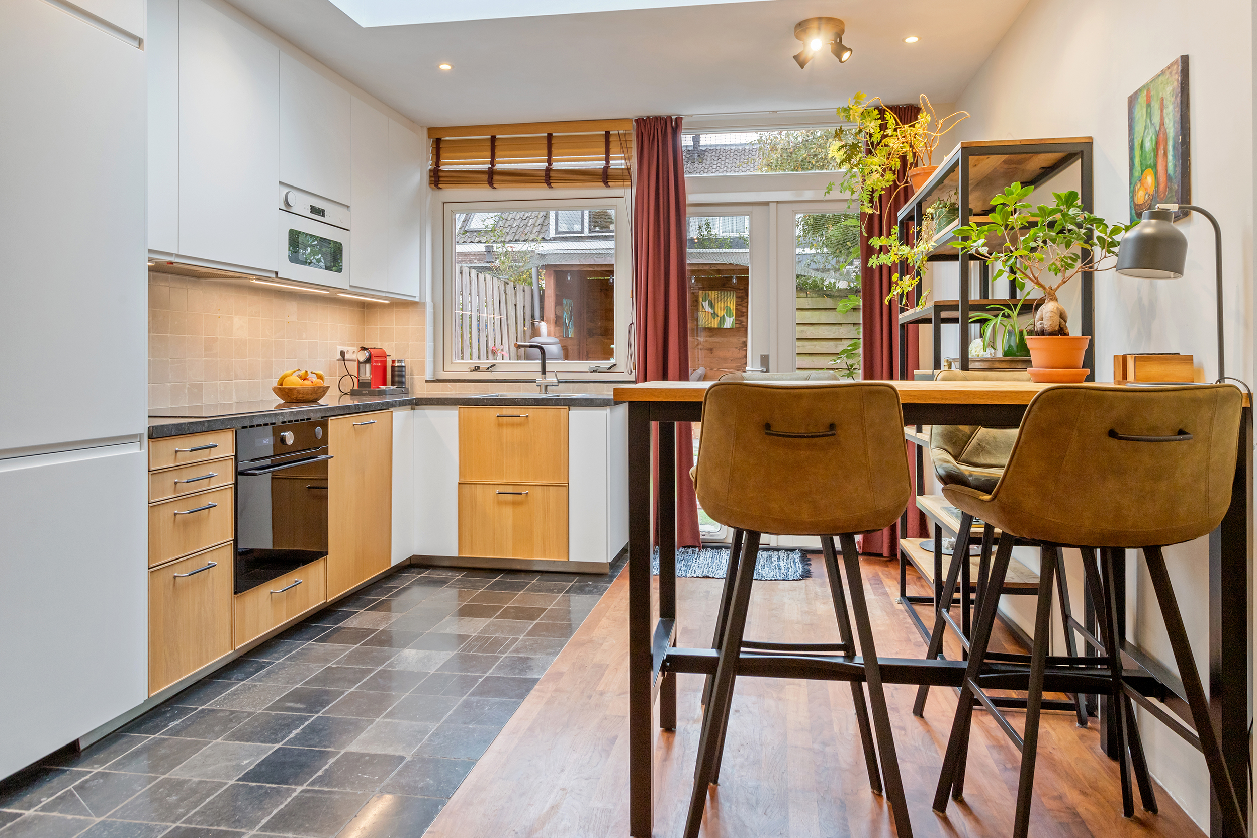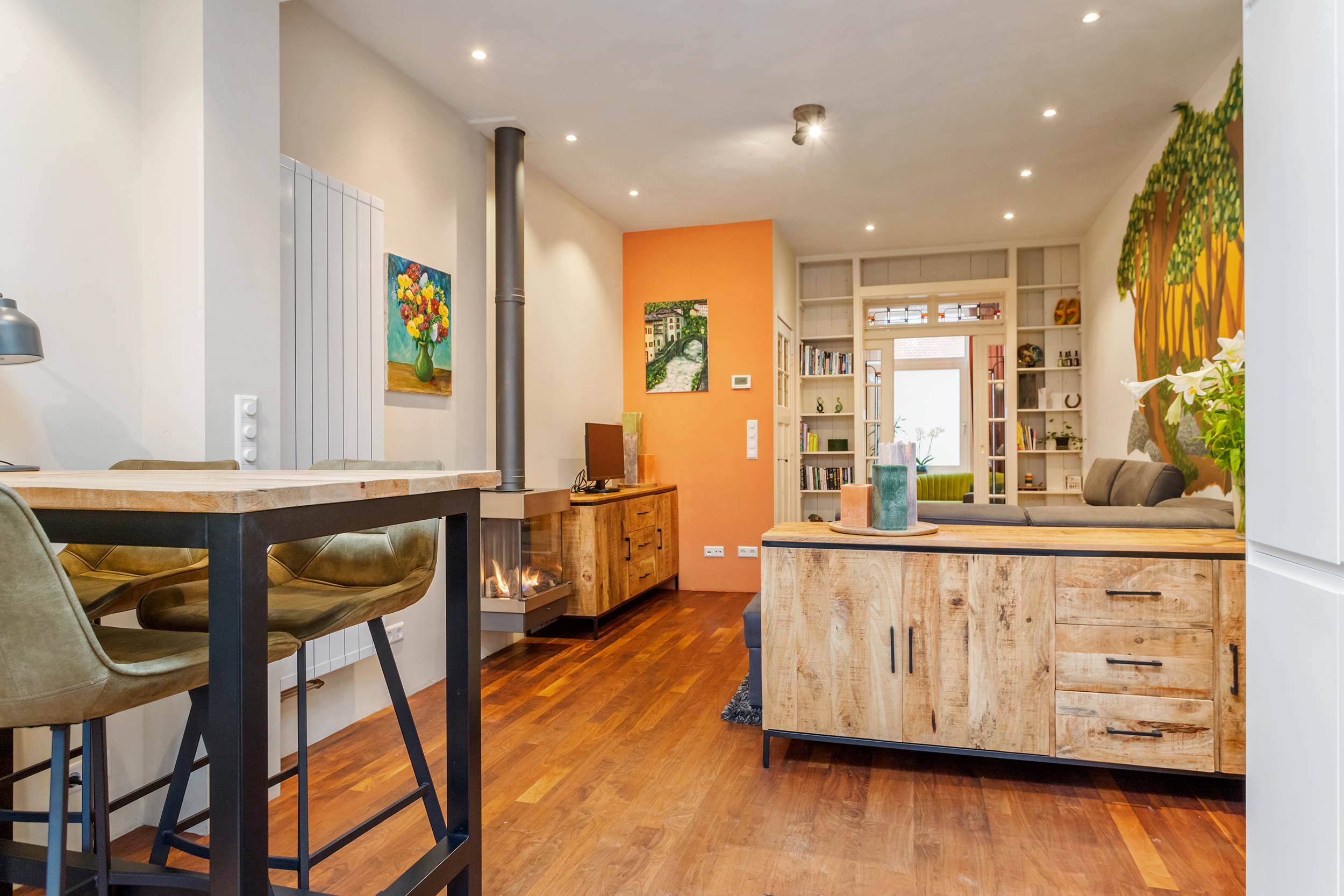 Je komt binnen in de hal, die toegang biedt tot het toilet en de royale leefruimte. Dankzij de klassieke en-suite met vaste kasten en glas-in-lood schuifdeuren is de ruimte eenvoudig op te delen in twee afzonderlijke kamers. Aan de voorzijde kun je een knusse zithoek creëren, terwijl je aan de achterzijde geniet van een open en lichte leefruimte die je helemaal naar eigen wens kunt inrichten. De voorkamer kan tevens gebruikt worden als apart kantoor, of werkruimte aan huis. Via deze voorkamer heb je ook toegang tot de diepe trappenkast waar voldoende ruimte is voor bijvoorbeeld de stofzuiger of extra voorraad. De prachtige houten vloer en de gashaard geven de kamer een warm en uitnodigend karakter. Door de grote raampartijen aan de voor- én achterzijde, én het dakraam, baadt de ruimte bovendien in het licht.