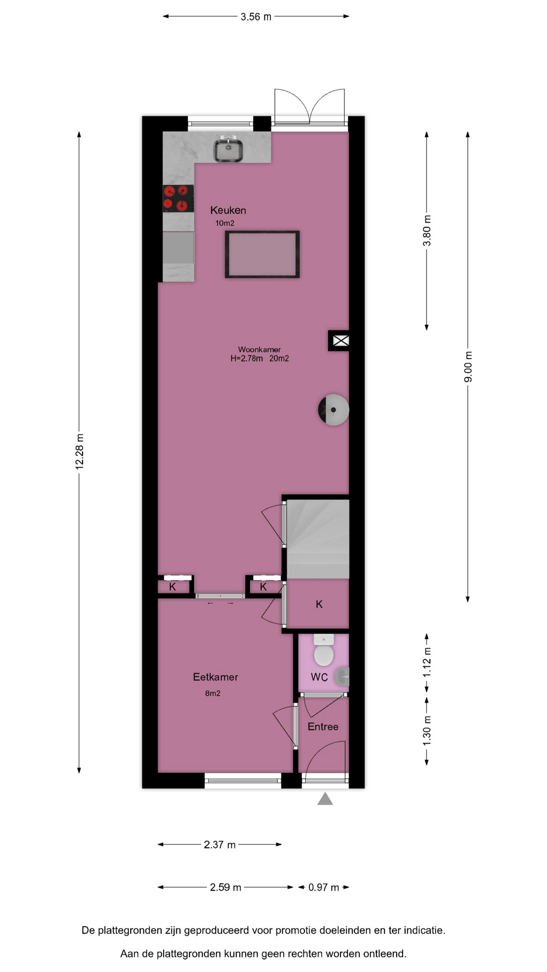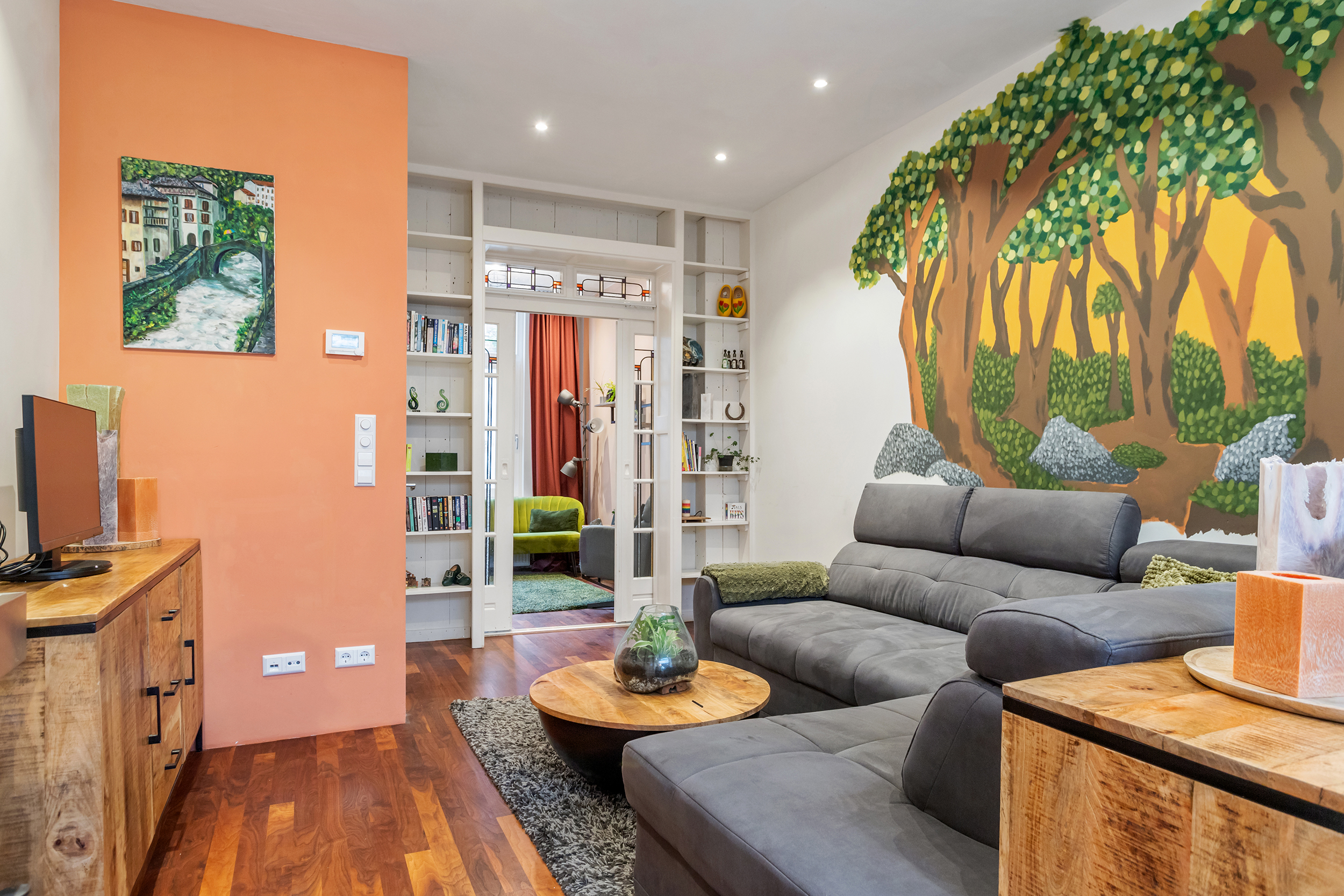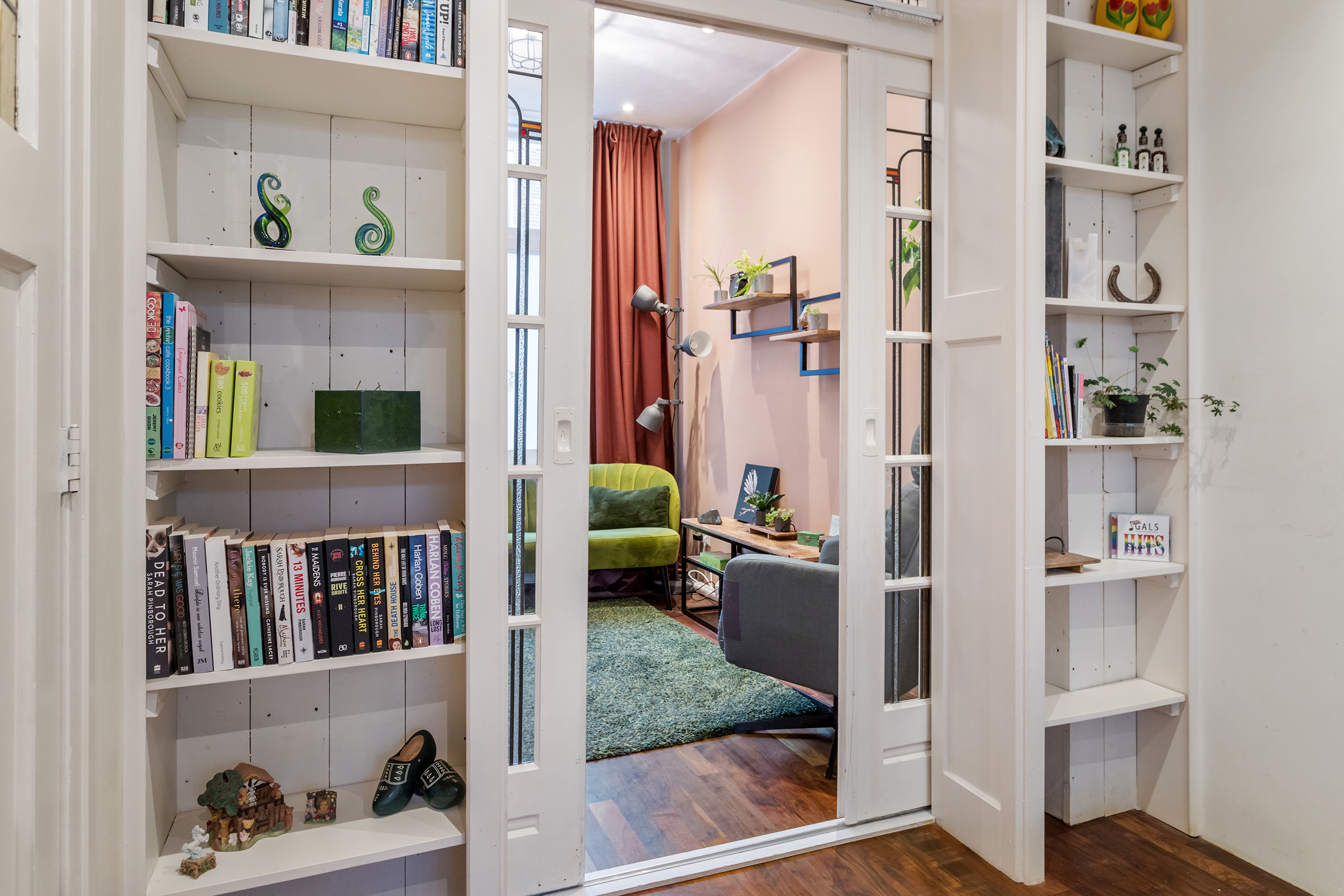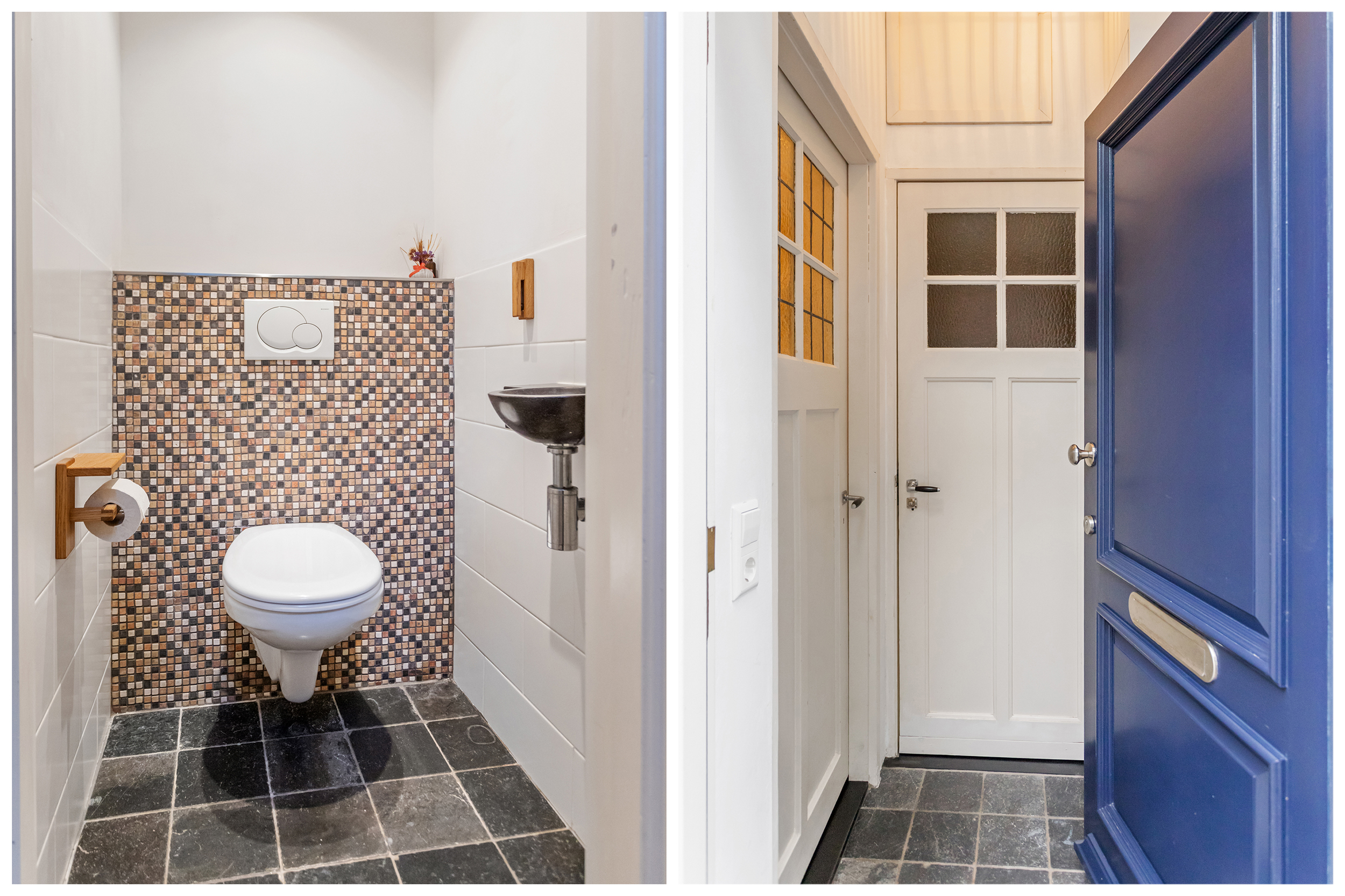 Je komt binnen in de hal, die toegang biedt tot het toilet en de royale leefruimte. Dankzij de klassieke en-suite met vaste kasten en glas-in-lood schuifdeuren is de ruimte eenvoudig op te delen in twee afzonderlijke kamers. Aan de voorzijde kun je een knusse zithoek creëren, terwijl je aan de achterzijde geniet van een open en lichte leefruimte die je helemaal naar eigen wens kunt inrichten. De voorkamer kan tevens gebruikt worden als apart kantoor, of werkruimte aan huis. Via deze voorkamer heb je ook toegang tot de diepe trappenkast waar voldoende ruimte is voor bijvoorbeeld de stofzuiger of extra voorraad. De prachtige houten vloer en de gashaard geven de kamer een warm en uitnodigend karakter. Door de grote raampartijen aan de voor- én achterzijde, én het dakraam, baadt de ruimte bovendien in het licht.
