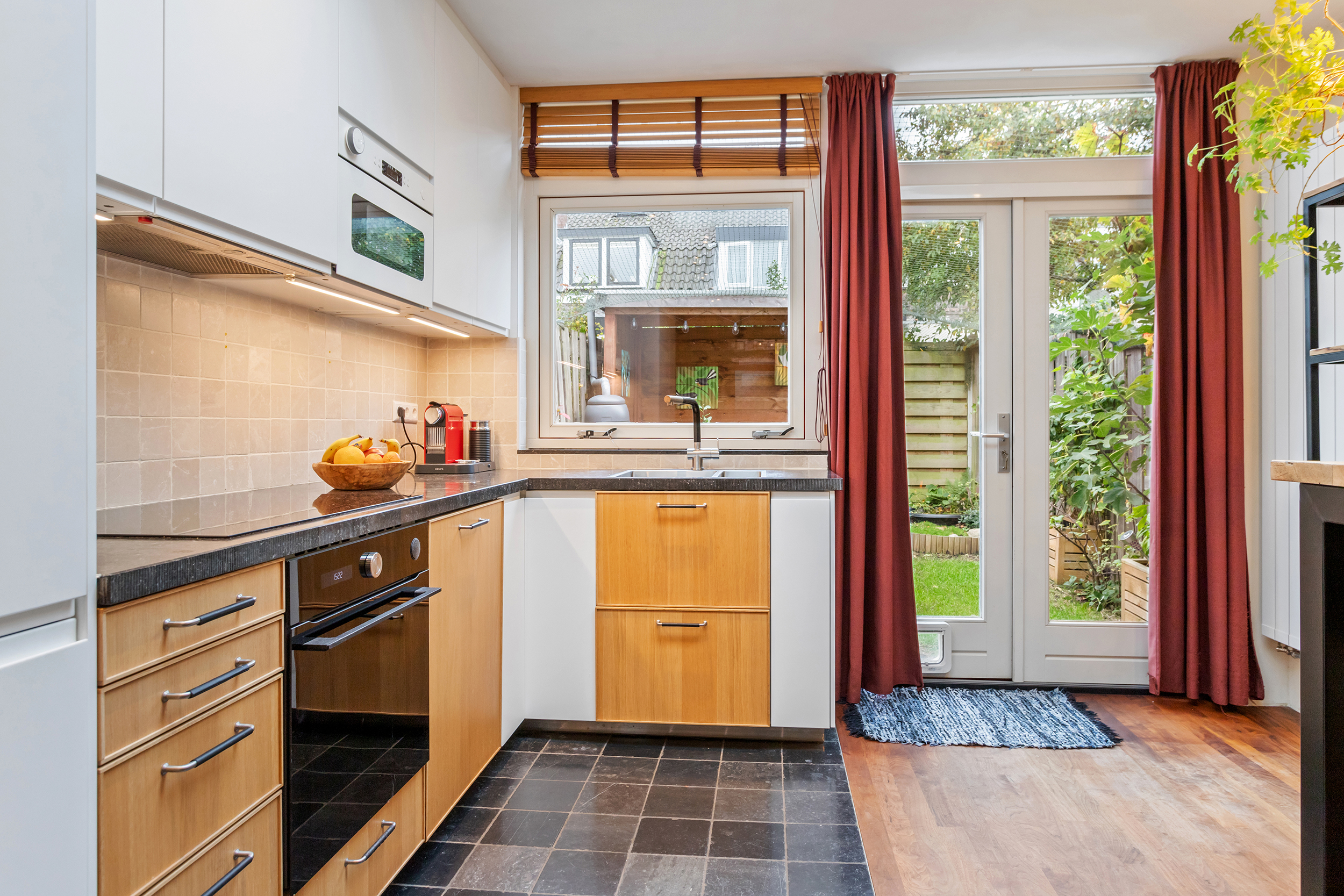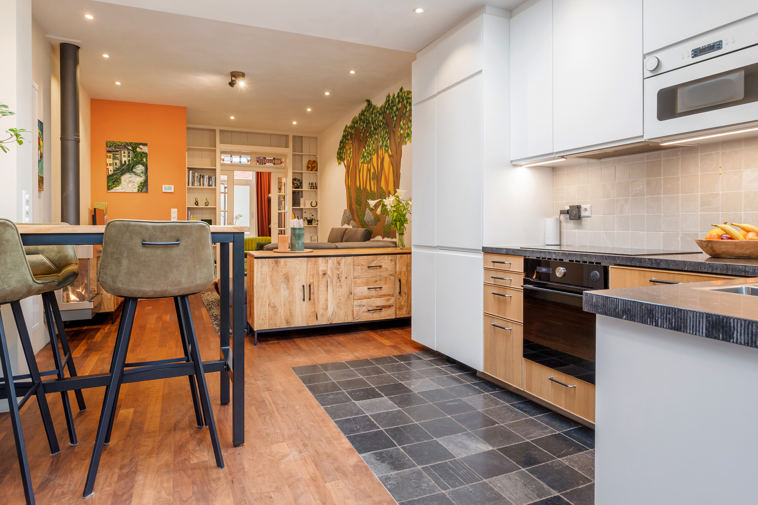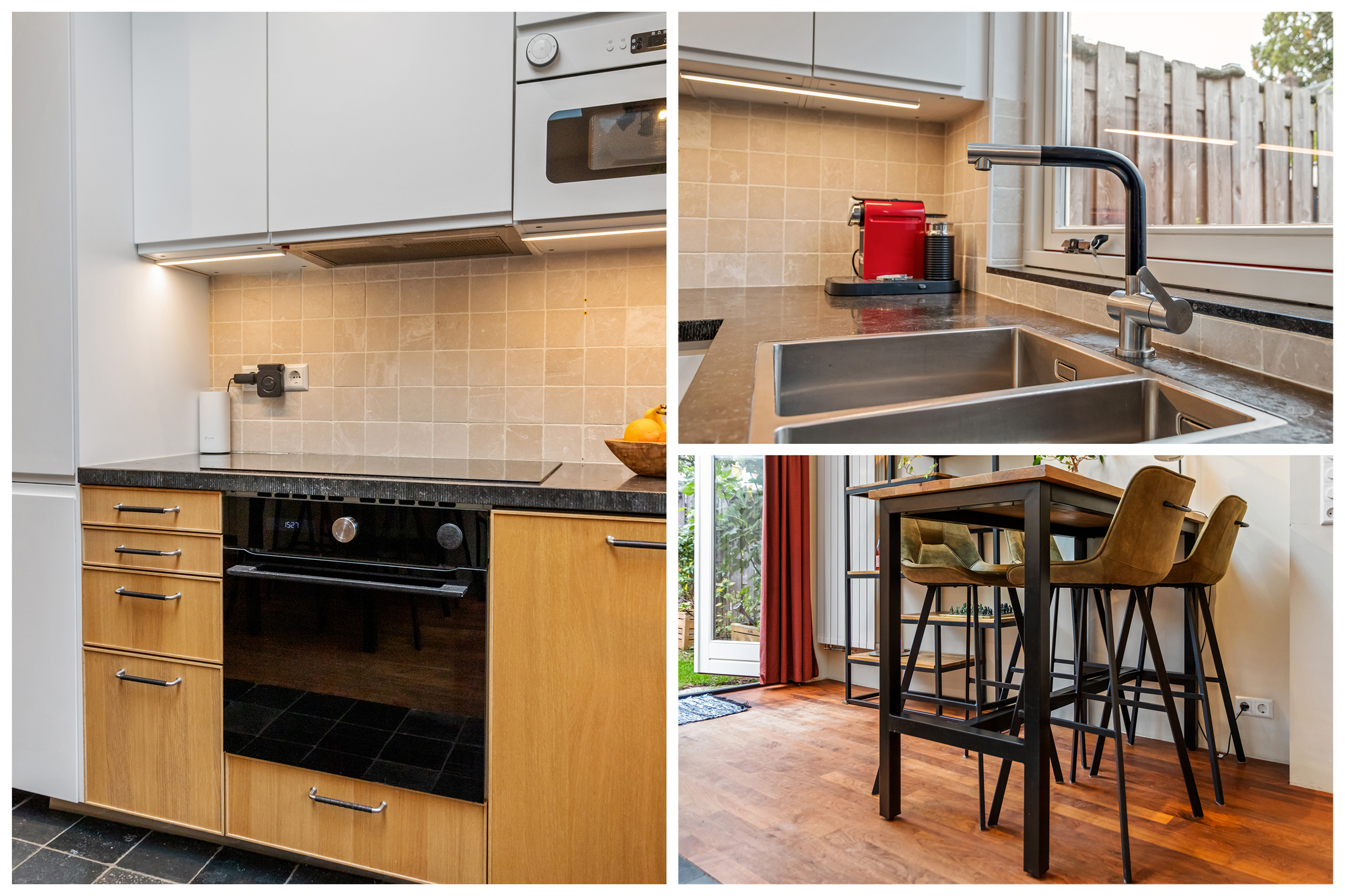 Aan de achterzijde van de woning bevindt zich de ruime open keuken, die naadloos aansluit op de leefruimte. De moderne keuken combineert warme houten fronten met strakke witte kasten en een donker natuurstenen werkblad, wat zorgt voor een stijlvolle en tijdloze uitstraling. De keuken is voorzien van diverse inbouwapparatuur, waaronder een oven, magnetron, koelkast, vriezer, kookplaat, afzuigkap en vaatwasser. Het praktische L-vormige ontwerp biedt volop werk- en opbergruimte. Op warme dagen zet je de deuren open en vloeien keuken en tuin moeiteloos in elkaar over — het ultieme binnen-buiten gevoel.