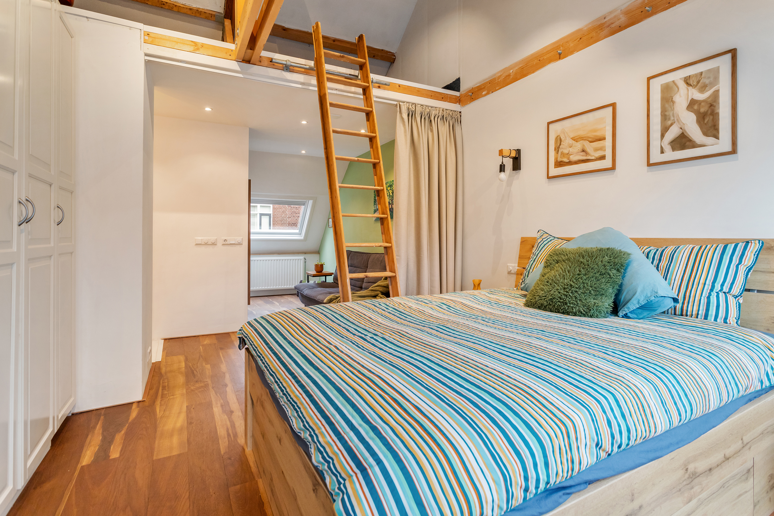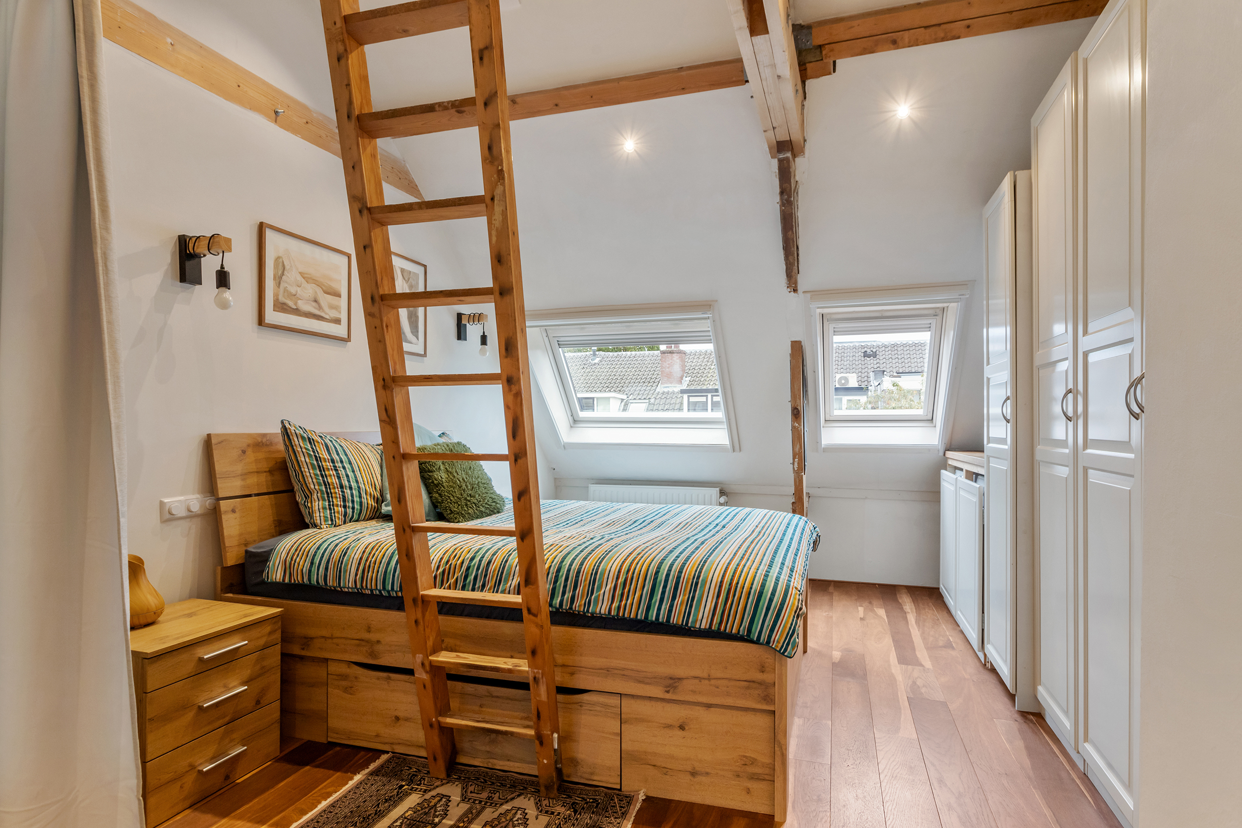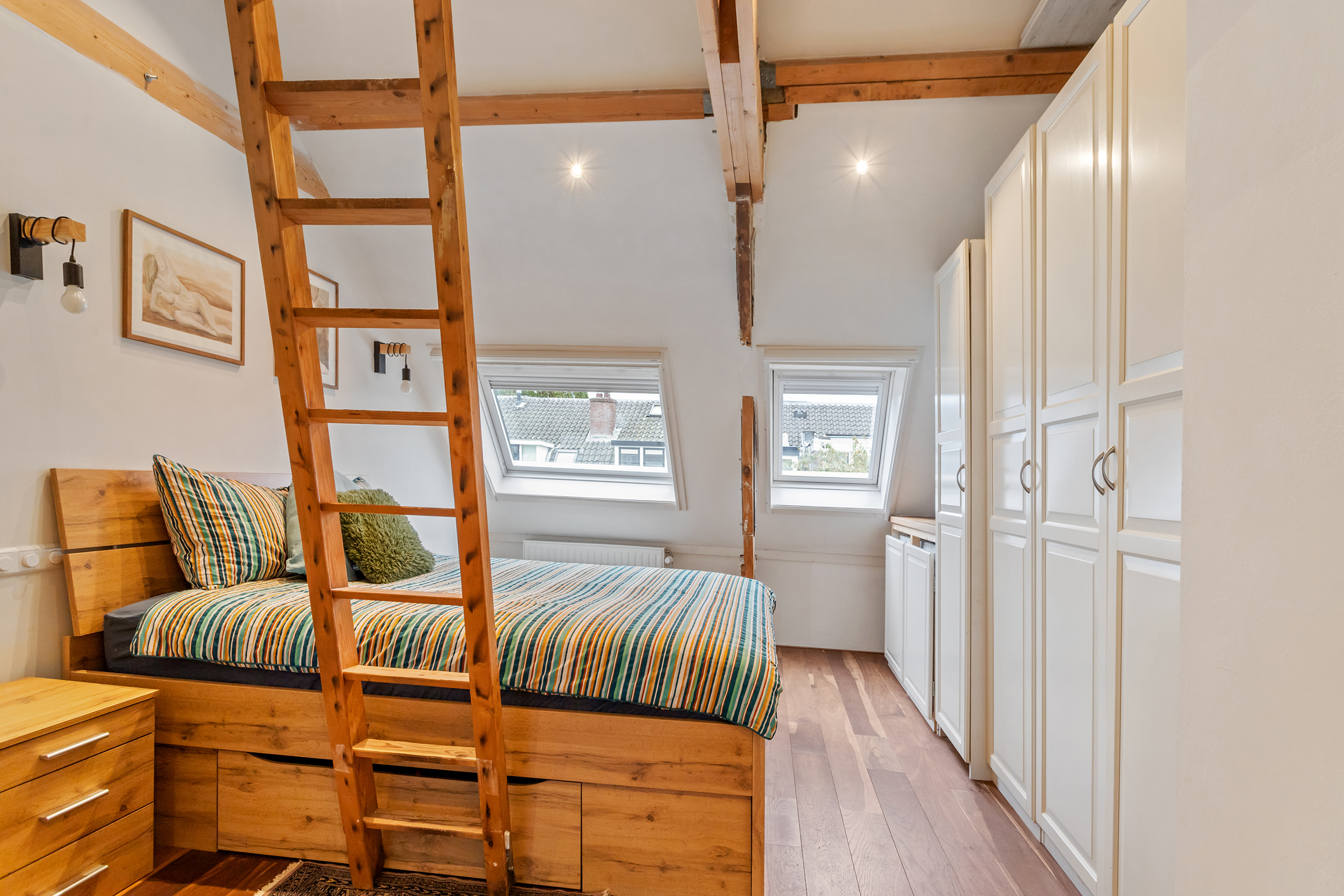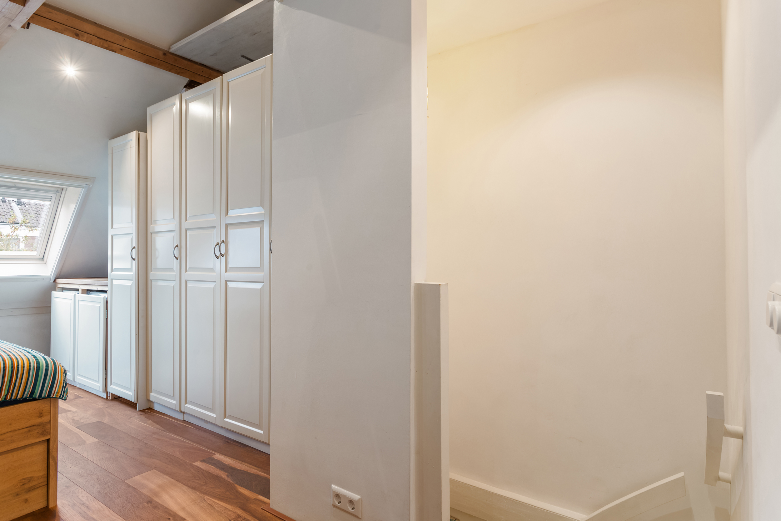 Op dit moment vind je hier een royale, heerlijk lichte kamer dankzij de grote Velux-dakramen. De warme houten vloer zorgt voor een fijne sfeer, en met een kleine aanpassing creëer je hier moeiteloos een tweede kamer. Aan de achterzijde is een entresol toegevoegd – ideaal voor extra bergruimte. Tevens zit hier de aansluiting voor de wasmachine en de droger netjes weggewerkt in de inbouwkasten, deze blijven achter in de woning.