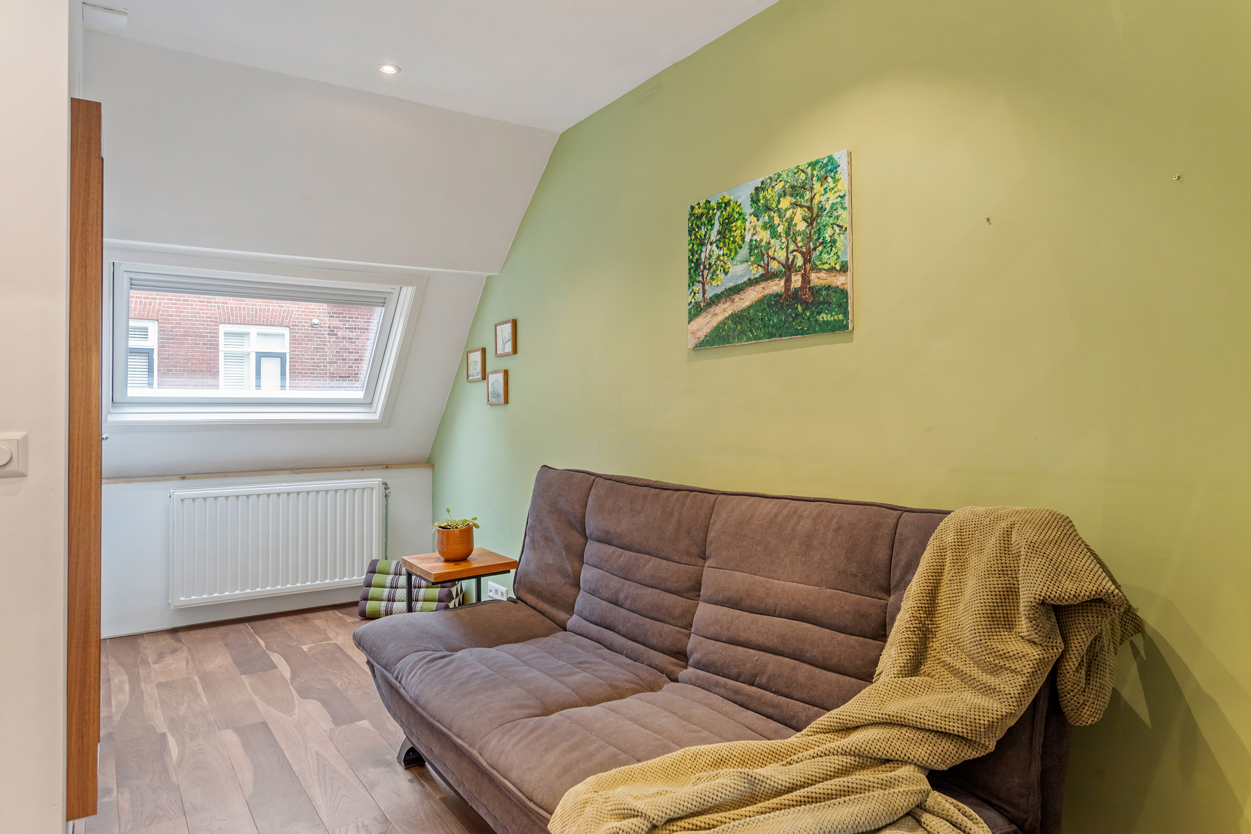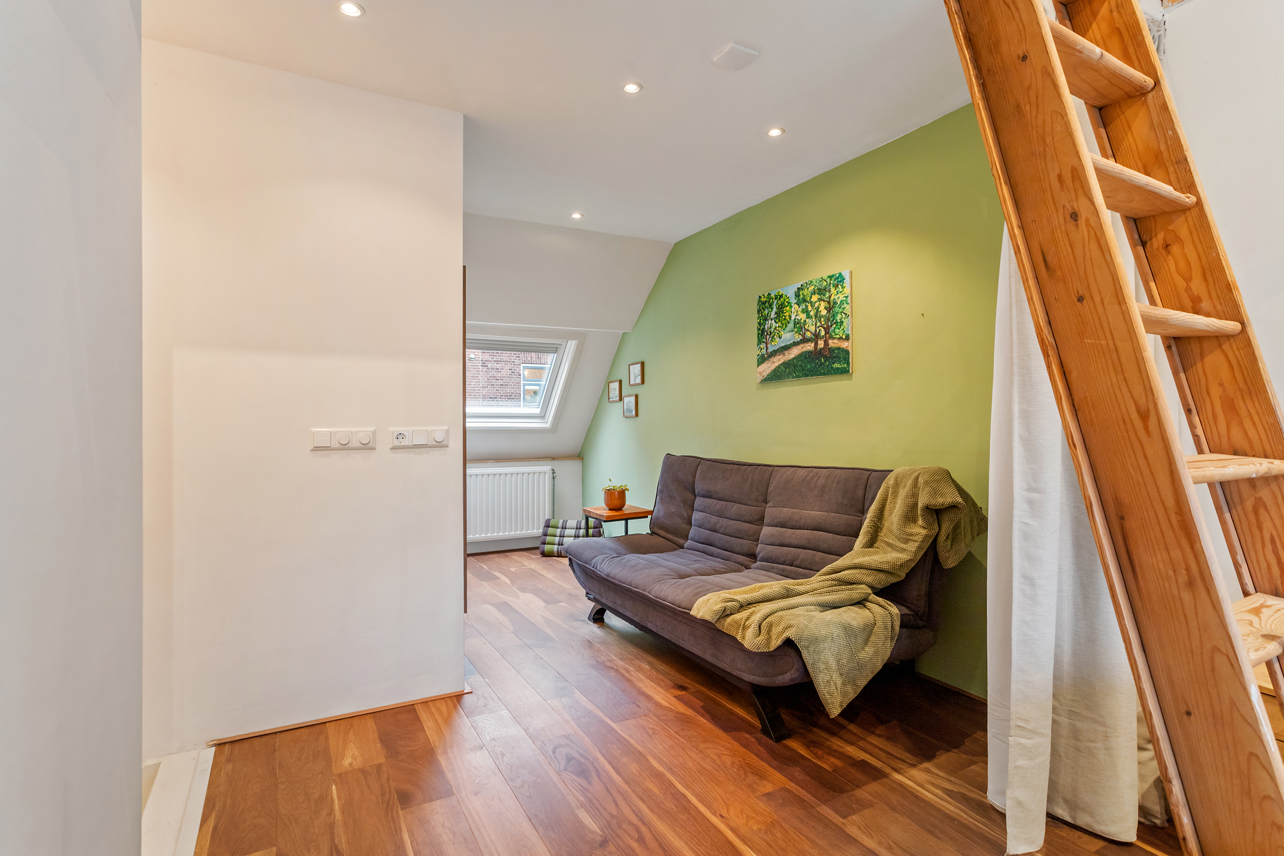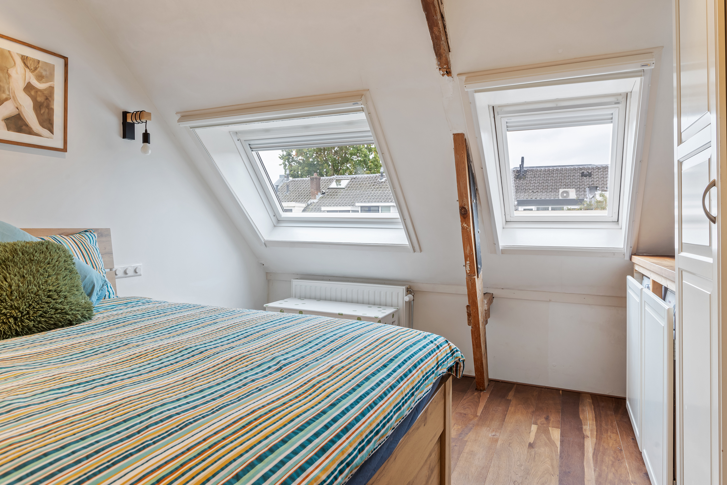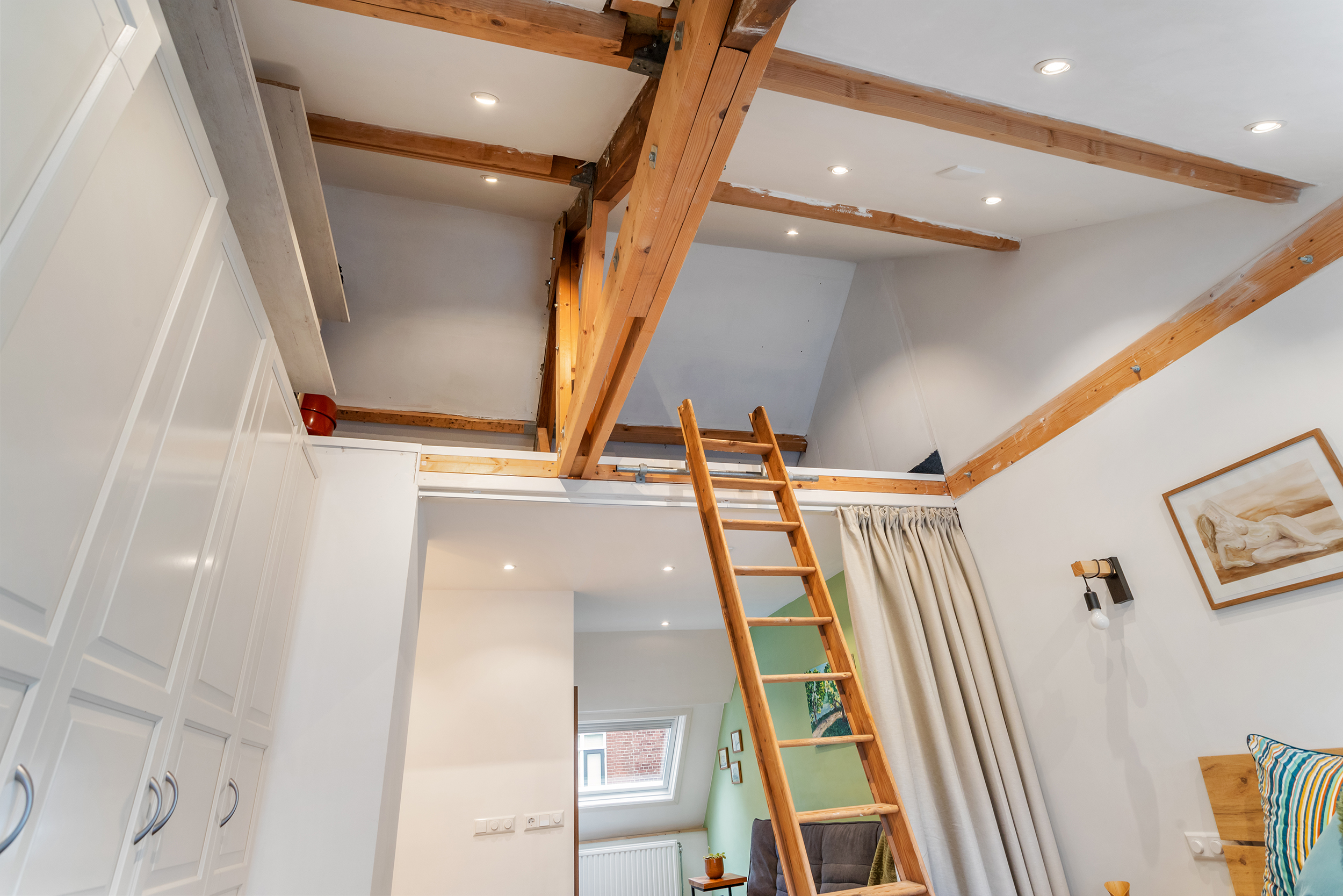 Op dit moment vind je hier een royale, heerlijk lichte kamer dankzij de grote Velux-dakramen. De warme houten vloer zorgt voor een fijne sfeer, en met een kleine aanpassing creëer je hier moeiteloos een tweede kamer. Aan de achterzijde is een entresol toegevoegd – ideaal voor extra bergruimte. Tevens zit hier de aansluiting voor de wasmachine en de droger netjes weggewerkt in de inbouwkasten, deze blijven achter in de woning.