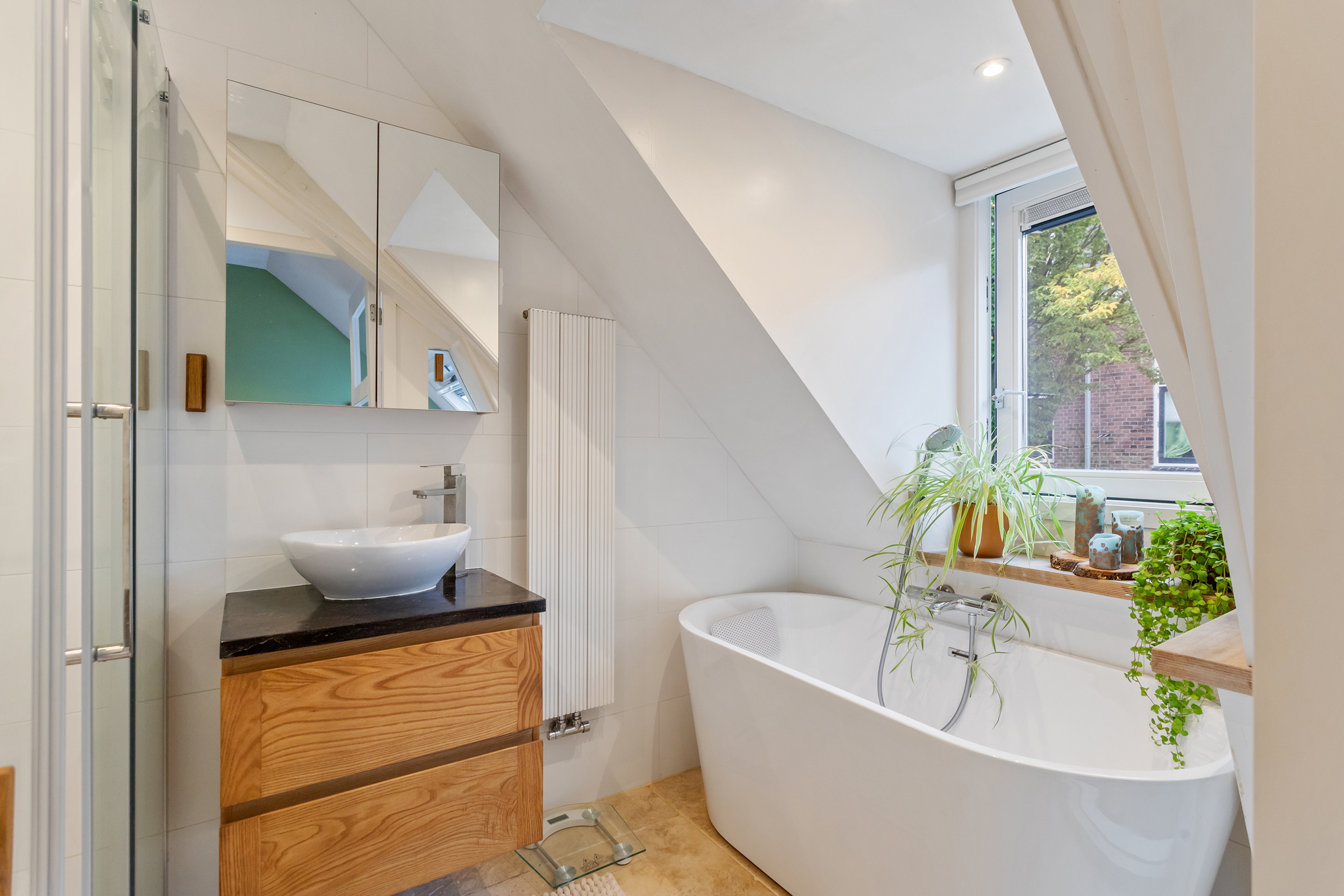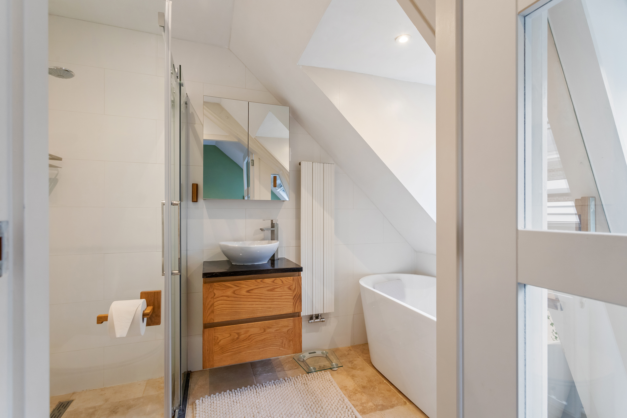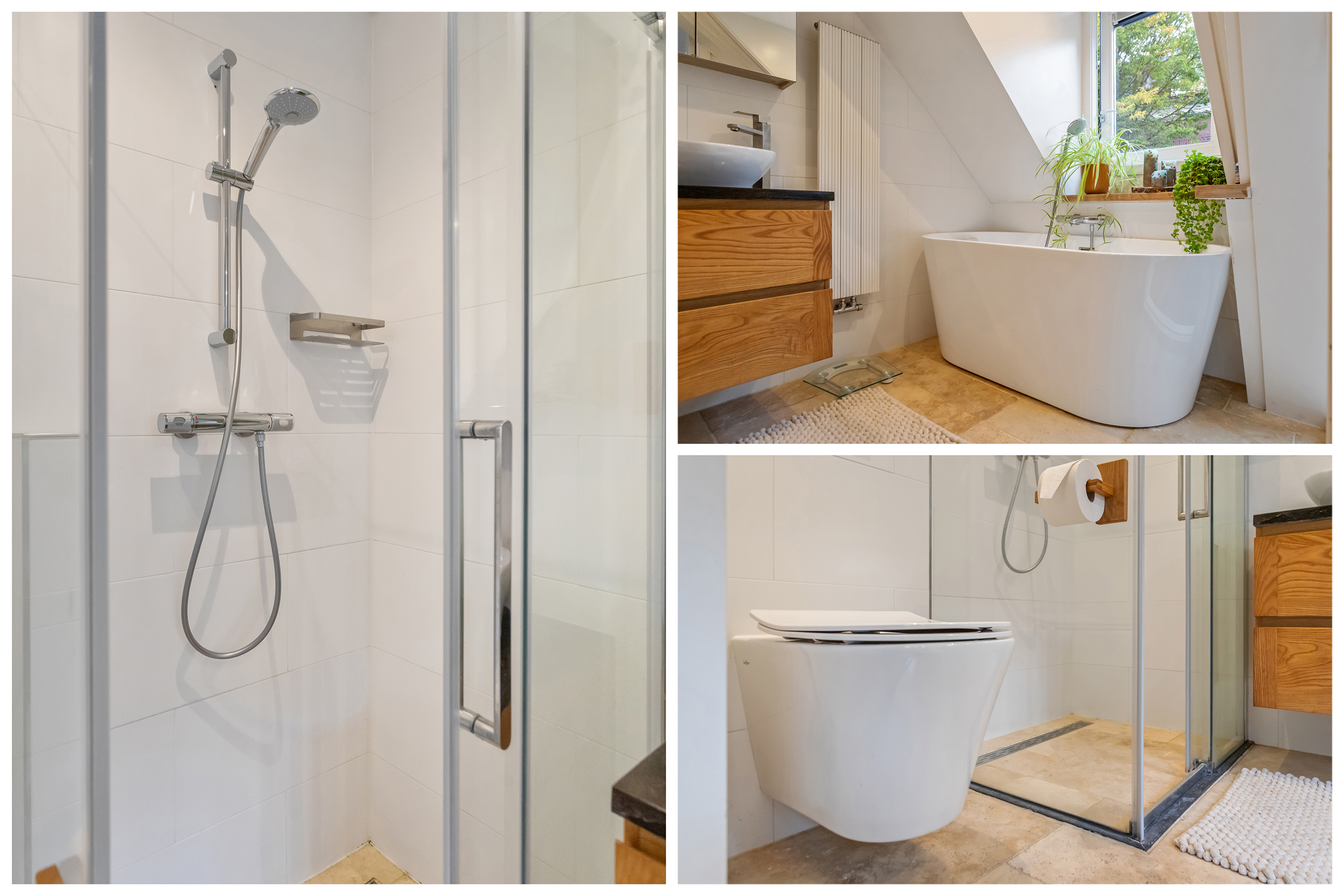 De moderne badkamer is uitgerust met een heerlijk ligbad, een douche, een wastafel met stijlvol meubel en een zwevend toilet. Hierbij is er gebruik gemaakt van mooie materialen waaronder hout en natuursteen.