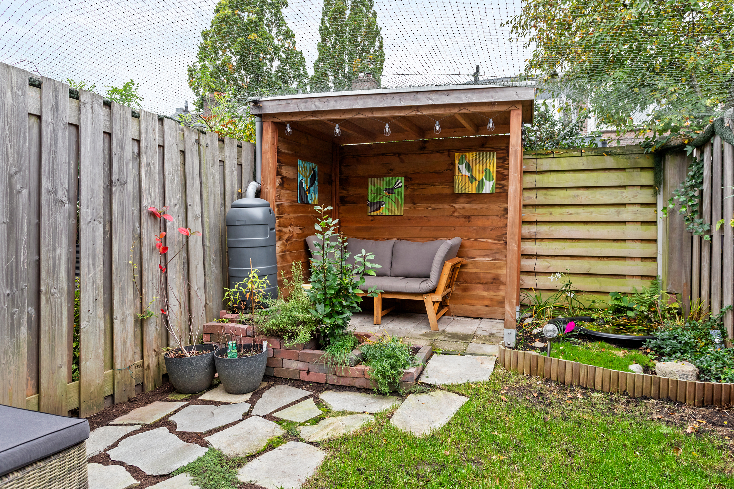 Een van de hoogtepunten van de woning is de zonnige tuin op het zuidwesten. Dankzij de royale oppervlakte is er volop ruimte voor een grote eettafel én een fijne loungehoek. De sfeervolle overkapping maakt het bovendien mogelijk om ook op druilerige dagen heerlijk buiten te zitten naast de visvijver met echte vissen.
