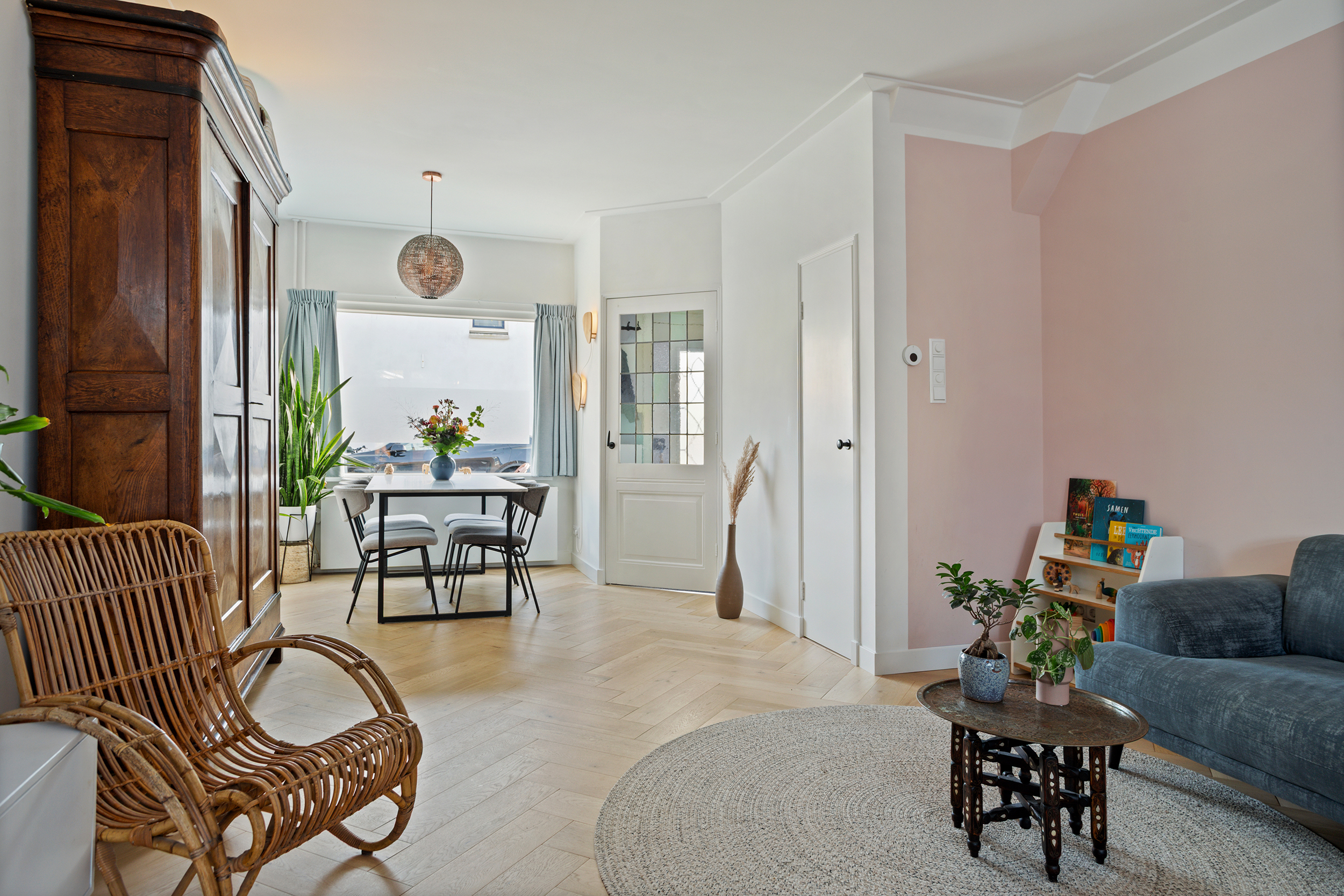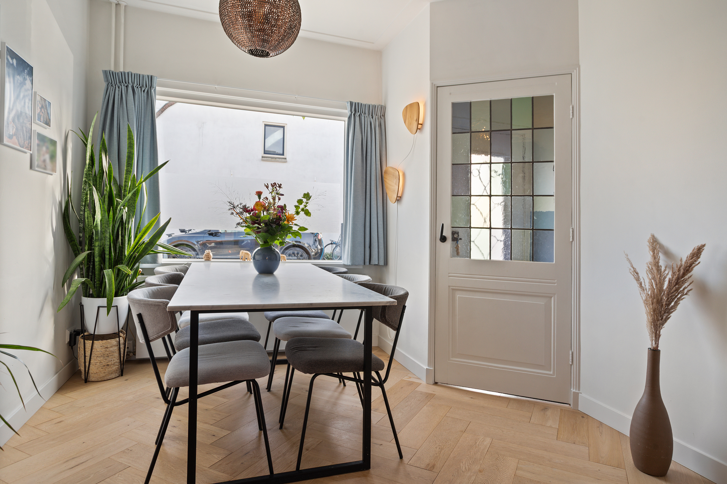 De begane grond heeft een fijne, open indeling waarin licht en rust de hoofdrol spelen. Aan de voorzijde zorgt de grote raampartij voor een overvloed aan licht en in de keuken versterkt de lichtstraat dit ruime en lichte gevoel nog verder. Hier is meer dan genoeg ruimte voor een gezellige zithoek en een grote eettafel om te genieten van gezellige avonden met vrienden en familie. De visgraatvloer loopt door over de gehele verdieping en zorgt direct voor een warme, serene basis. De glas-in-looddeur richting de hal vormt een stijlvol detail dat perfect past bij de sfeer van de woning.