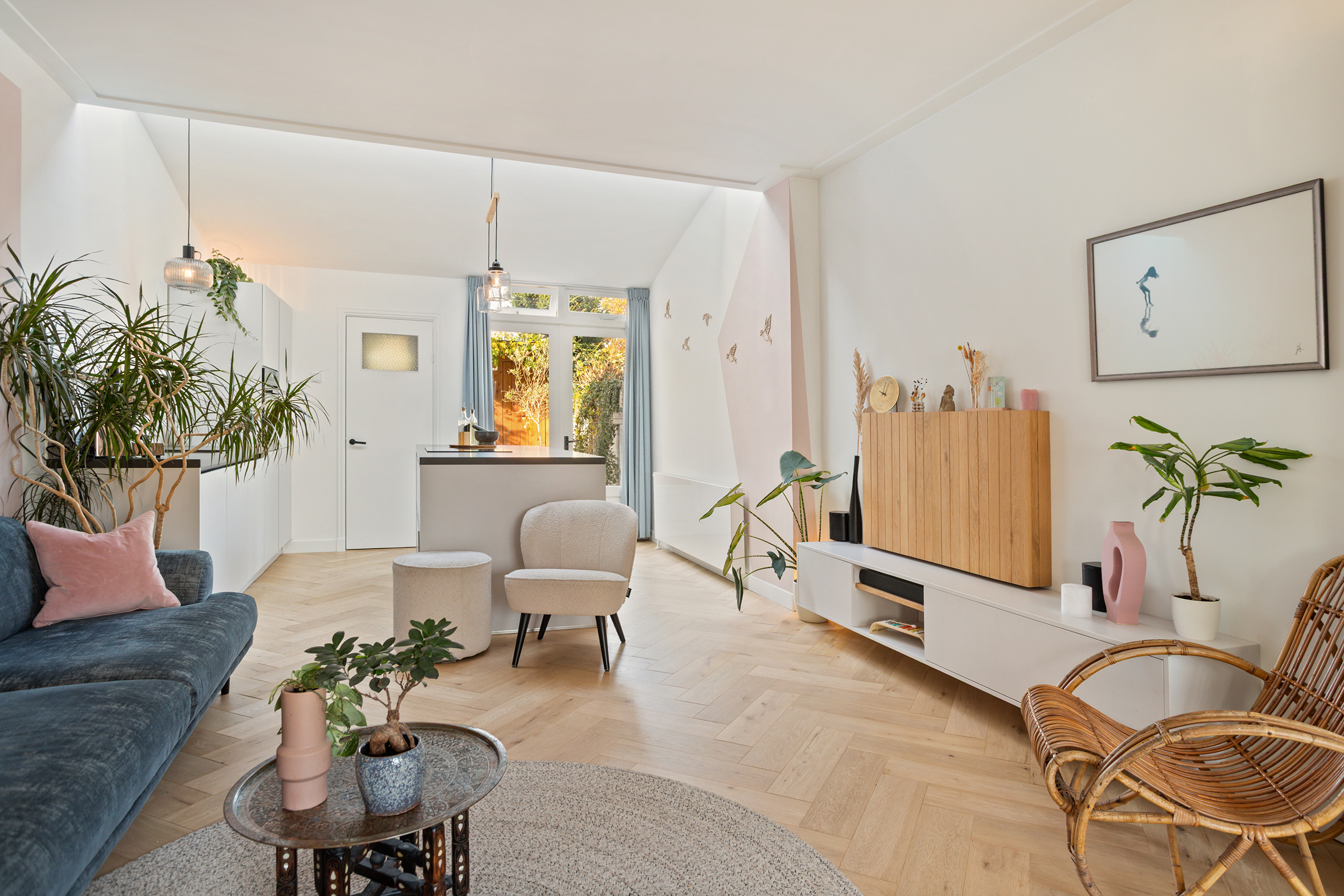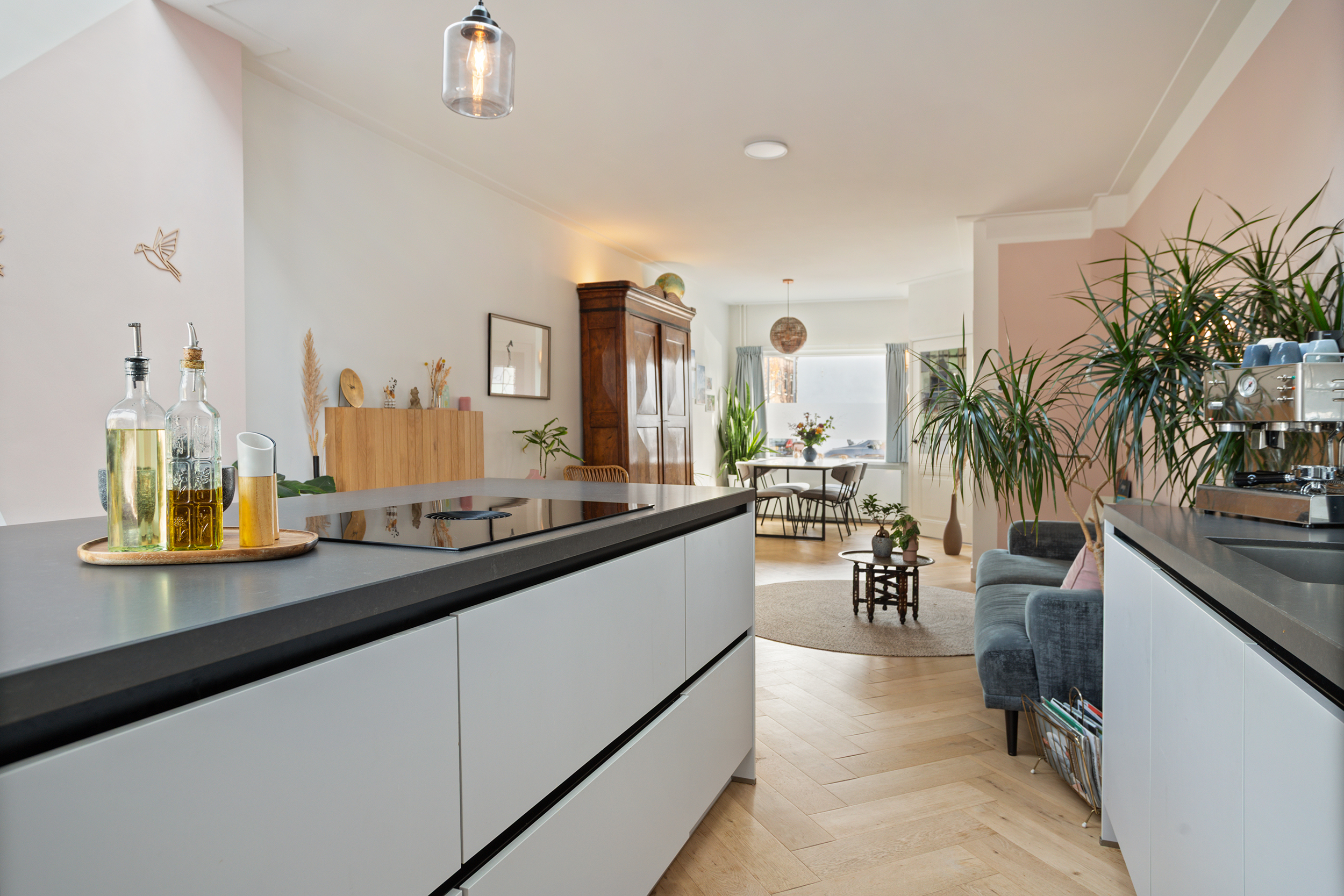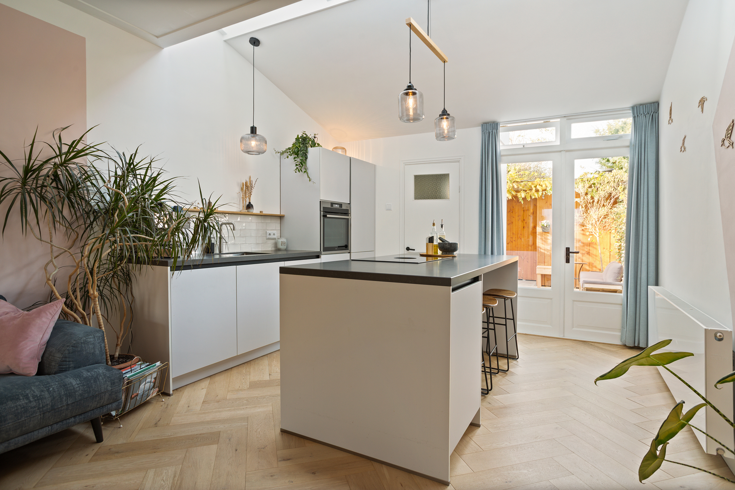 Verder naar achteren opent de ruimte zich richting de moderne keuken, met een eigentijdse uitstraling dankzij de verbouwing van 2021. De strakke fronten, het donkere werkblad en het kookeiland met bar (met ruimte voor drie krukken) vormen samen een elegant geheel waar koken en samenkomen centraal staan. Dankzij de achtergevel met dubbele deuren staat de keuken fijn in verbinding met de zonnige tuin, waardoor binnen en buiten moeiteloos in elkaar overlopen. Achter de keuken bevinden zich het toilet en een handige extra bergruimte met wasmachineaansluiting.