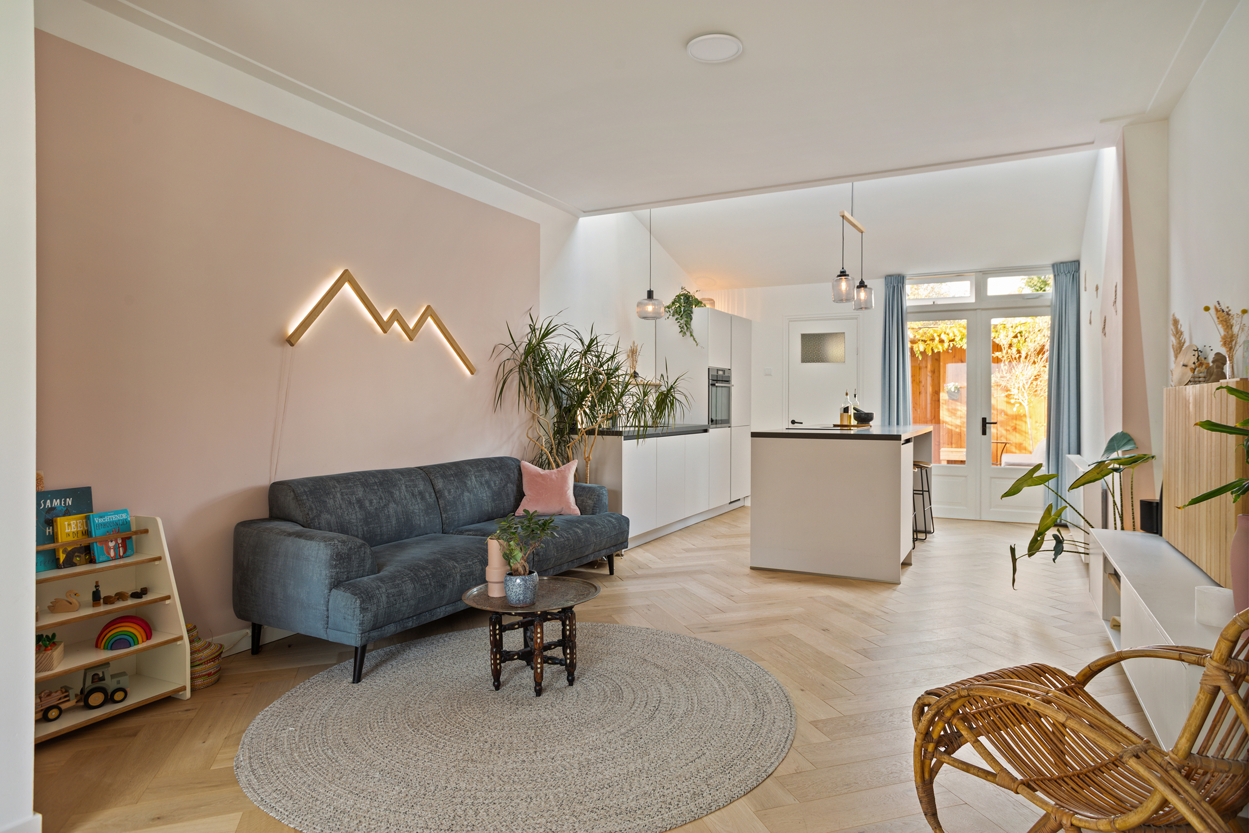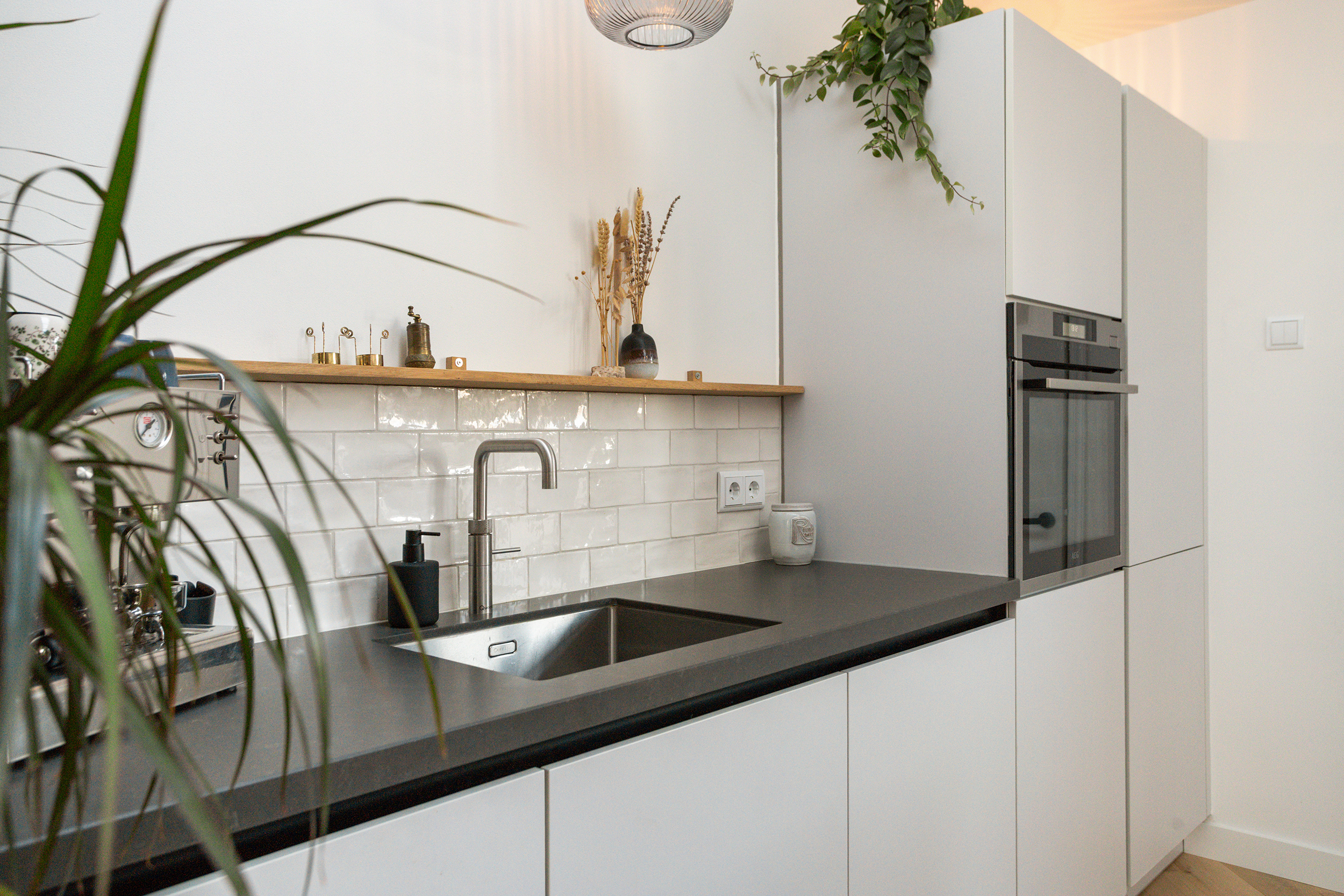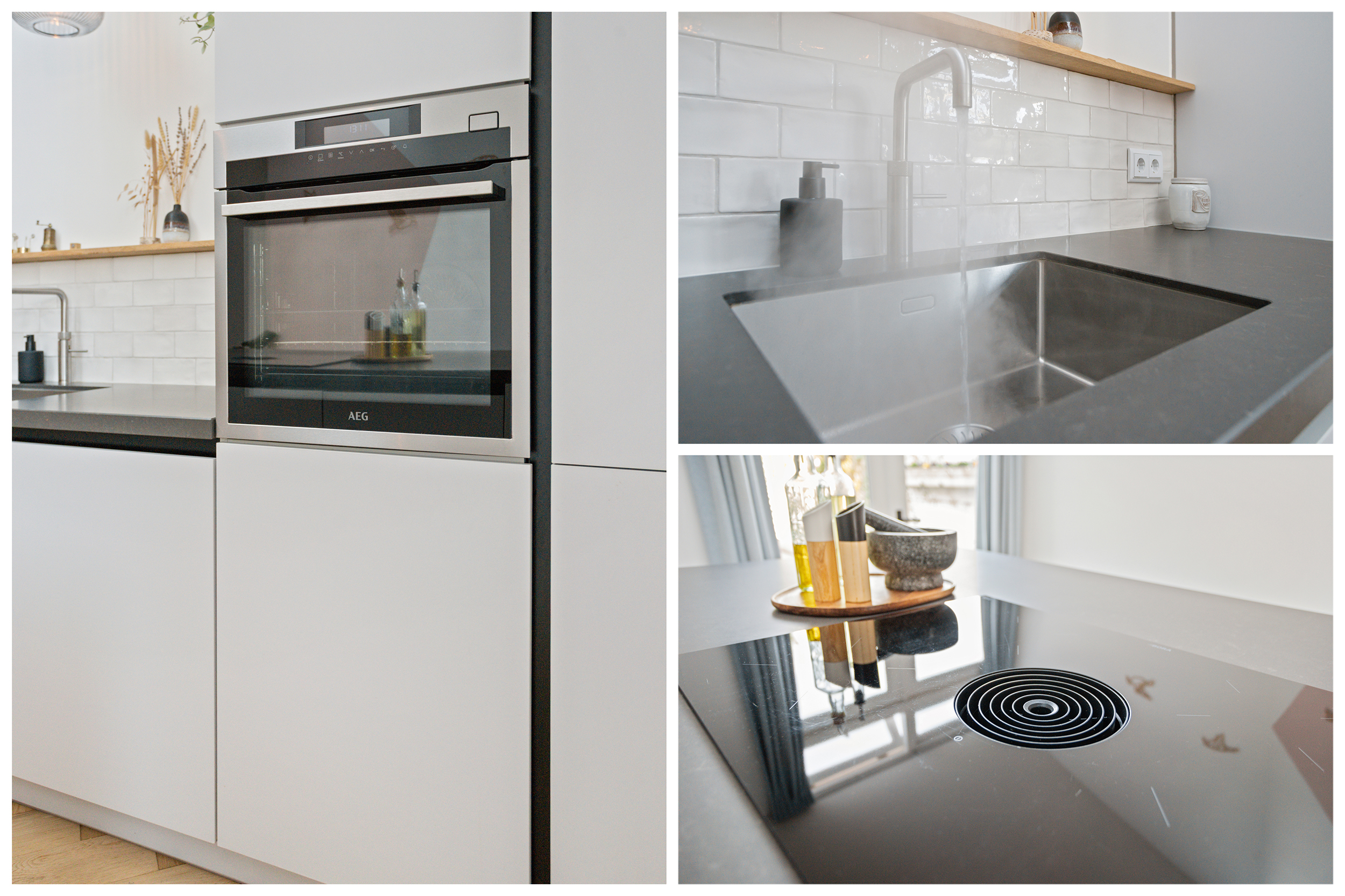 Verder naar achteren opent de ruimte zich richting de moderne keuken, met een eigentijdse uitstraling dankzij de verbouwing van 2021. De strakke fronten, het donkere werkblad en het kookeiland met bar (met ruimte voor drie krukken) vormen samen een elegant geheel waar koken en samenkomen centraal staan. Dankzij de achtergevel met dubbele deuren staat de keuken fijn in verbinding met de zonnige tuin, waardoor binnen en buiten moeiteloos in elkaar overlopen. Achter de keuken bevinden zich het toilet en een handige extra bergruimte met wasmachineaansluiting.