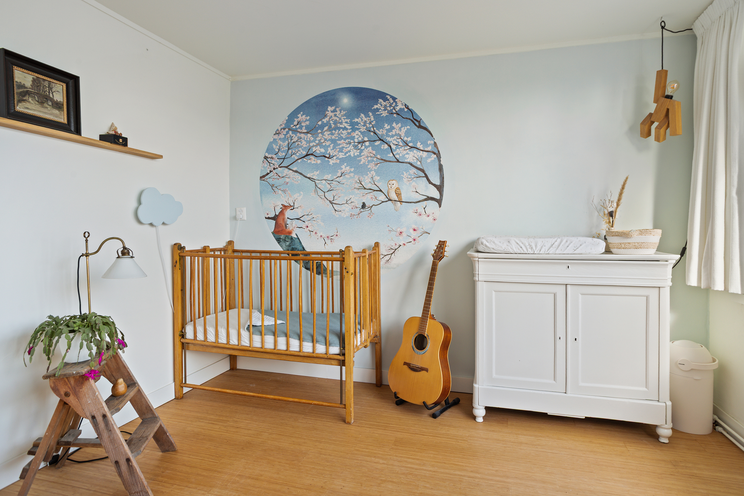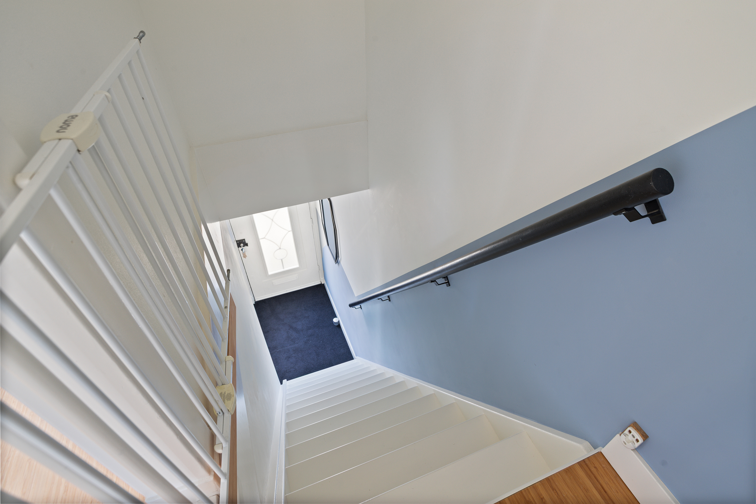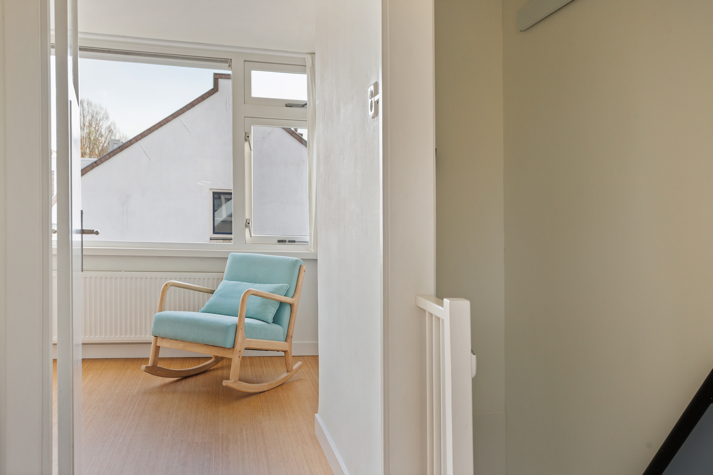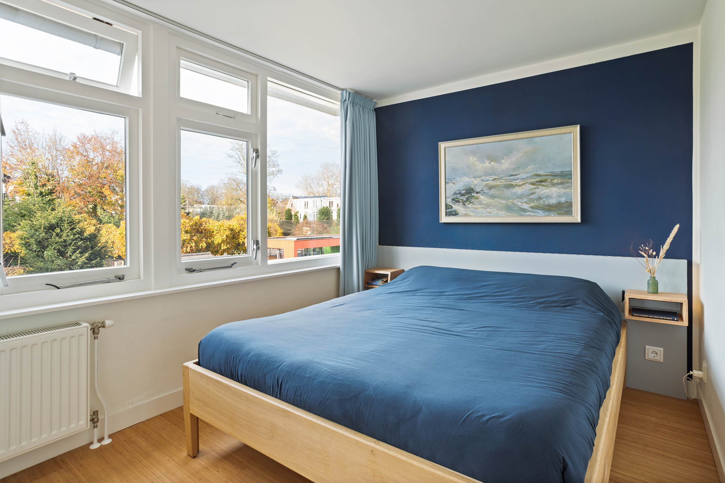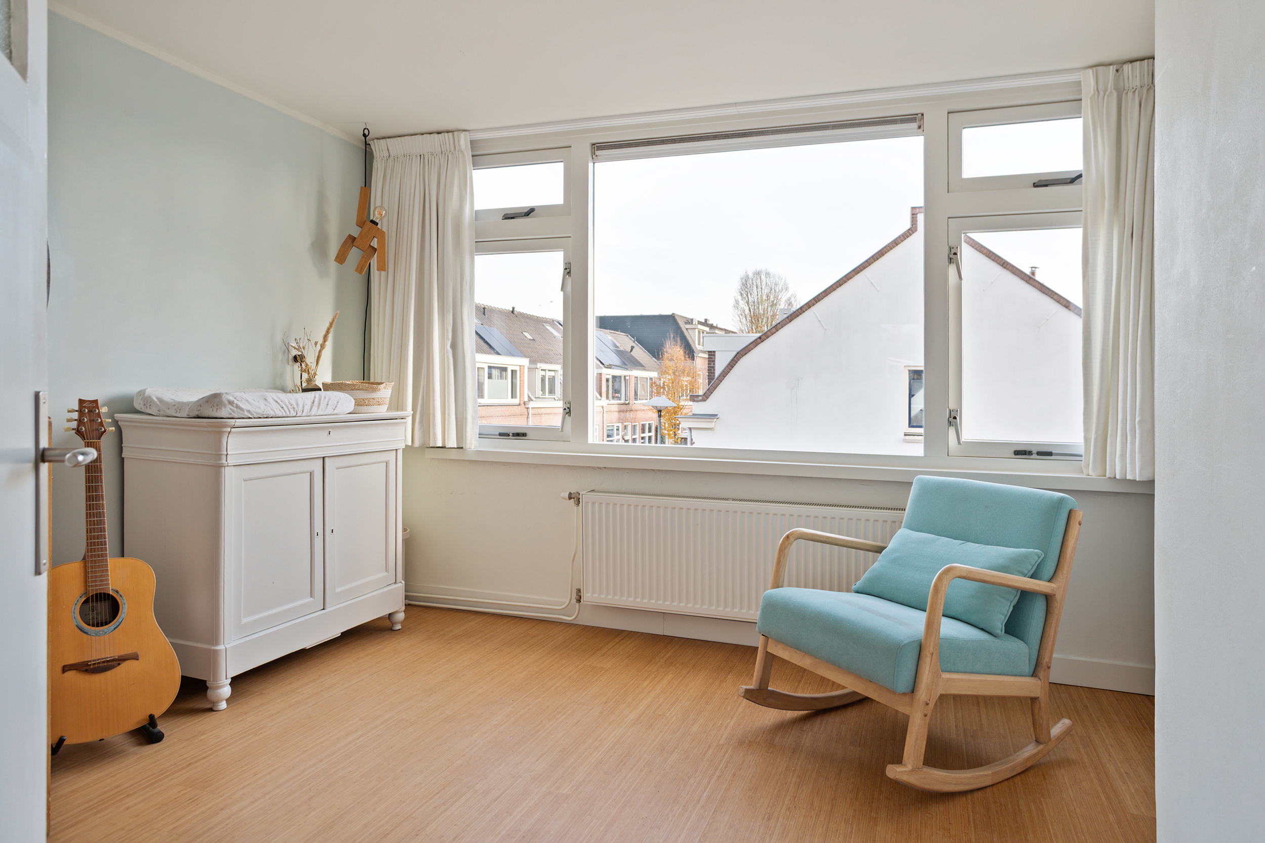 Op de eerste verdieping kom je op een lichte overloop die toegang geeft tot twee slaapkamers en de badkamer. De kamer aan de achterzijde is ruim en heeft een prettig uitzicht op de groene achtertuinen. Aan de voorzijde ligt een tweede lichte kamer die veelzijdig in te richten is.