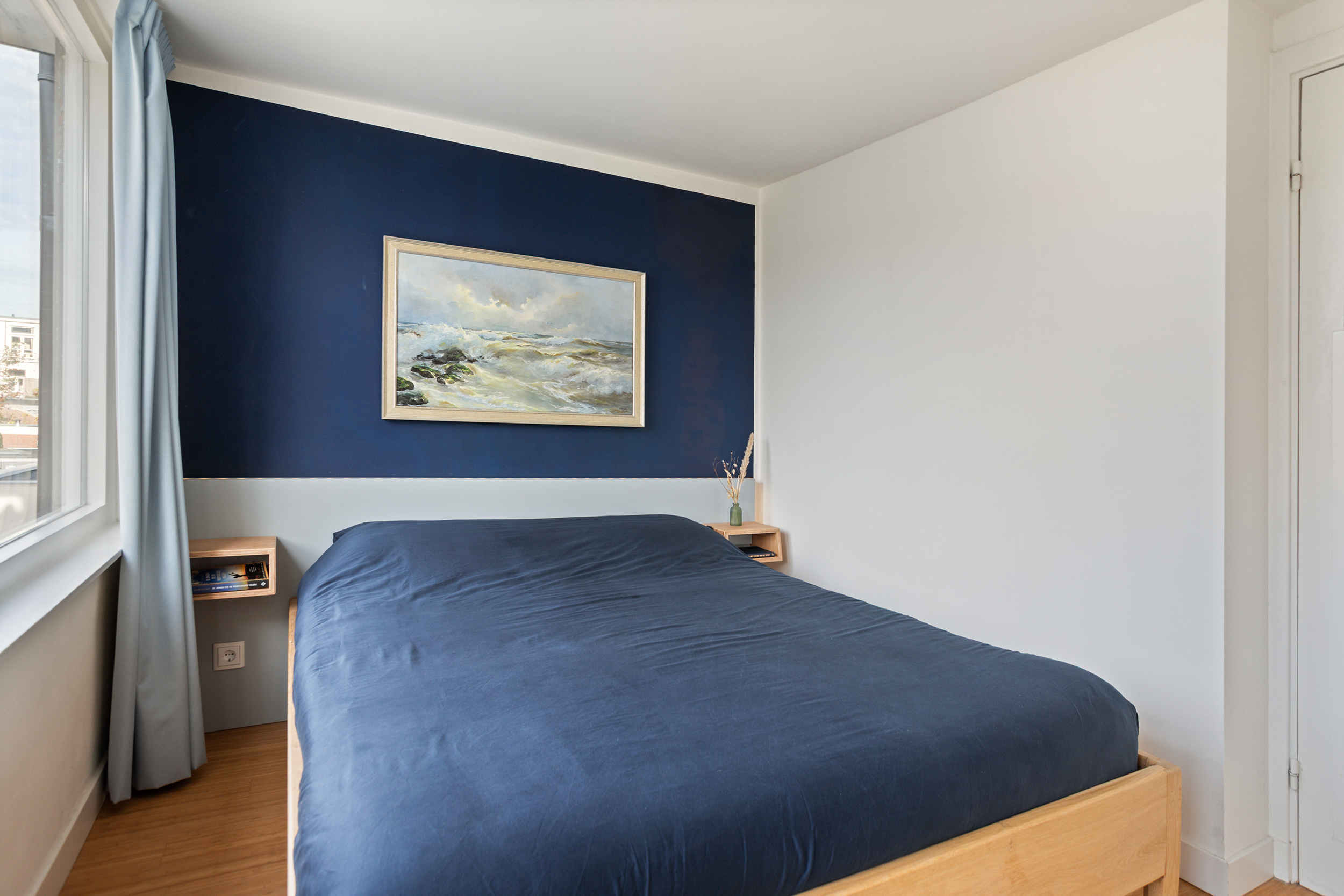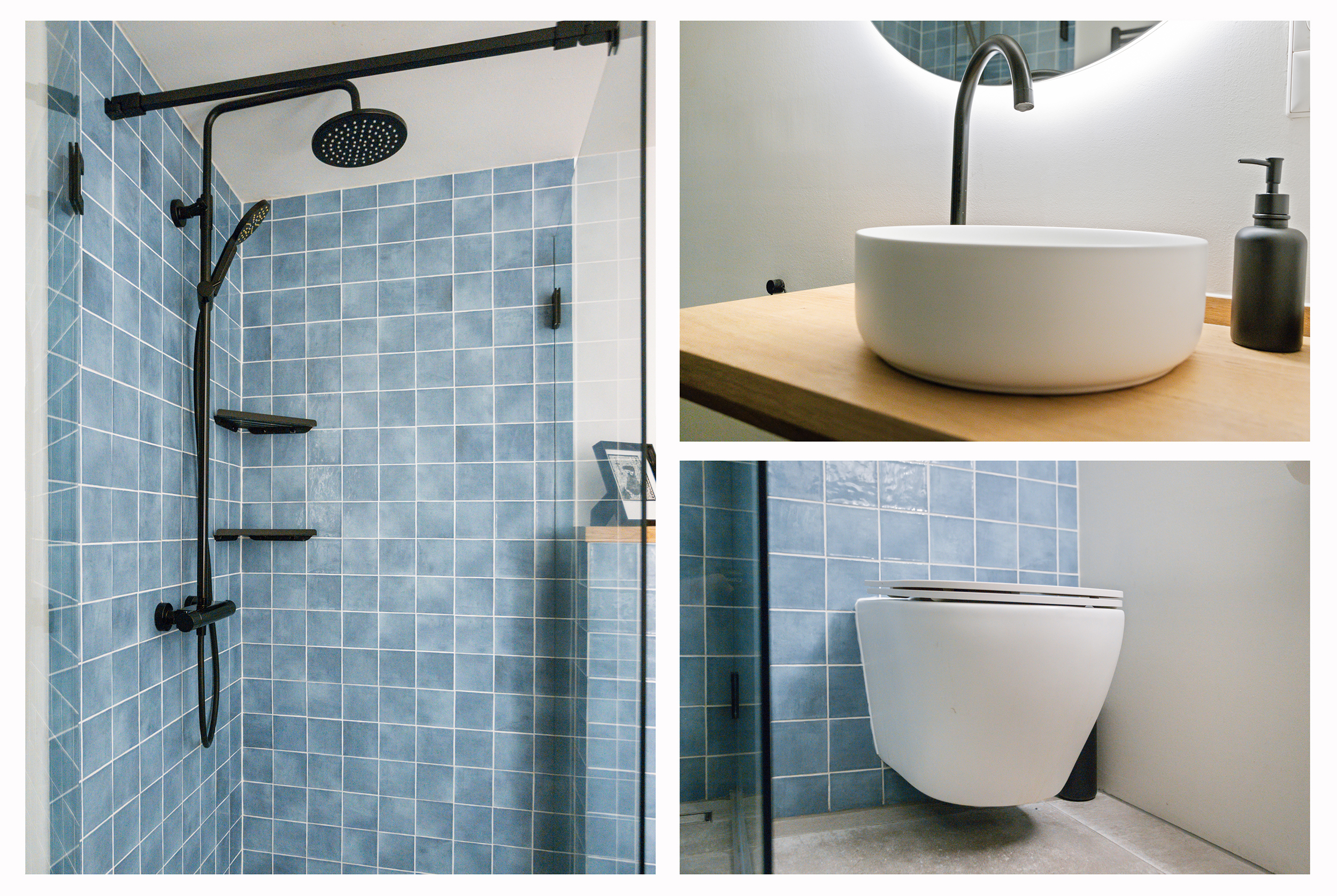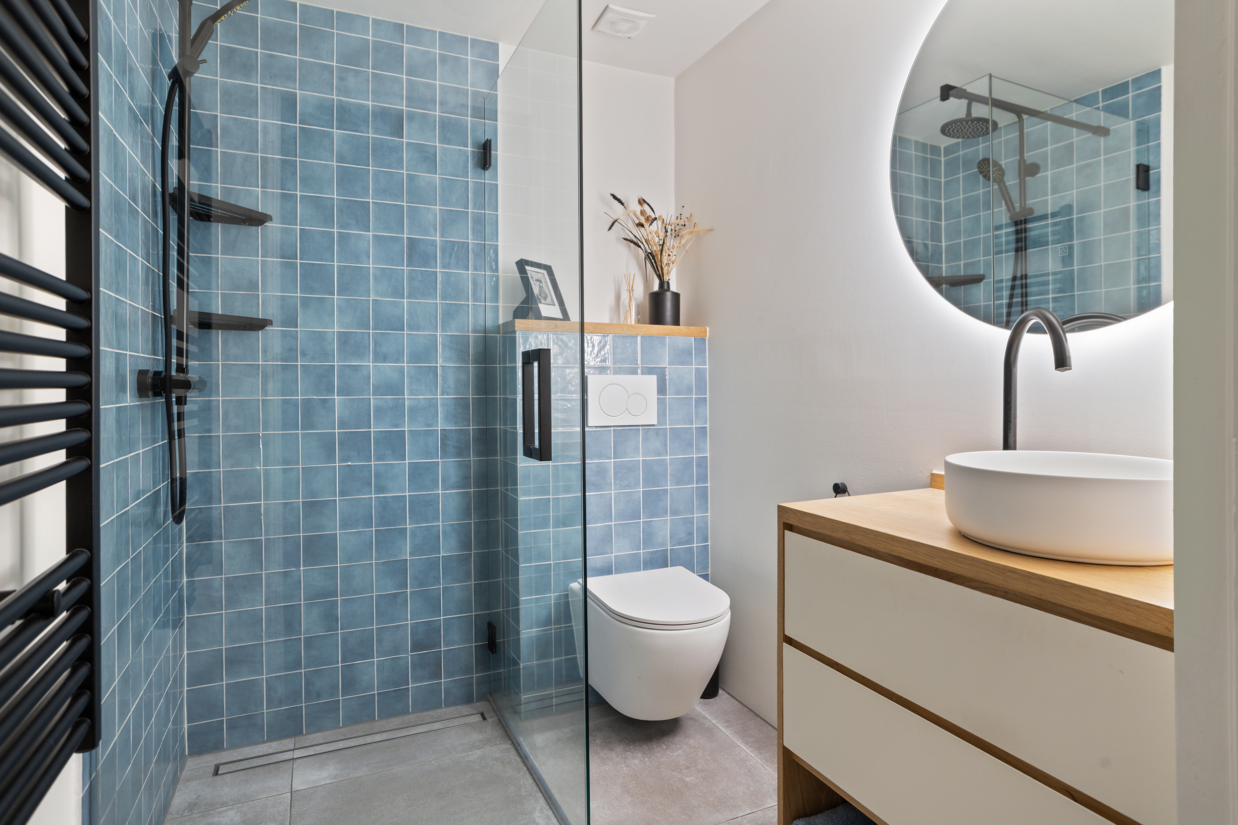 Tussen beide kamers in ligt de badkamer, die met oog voor stijl is ingericht. De combinatie van zachte blauwtinten, modern sanitair en een inloopdouche zorgt voor een frisse en luxe uitstraling. Alles voelt verzorgd en eigentijds, waardoor deze verdieping een prettige en rustige privéruimte vormt.