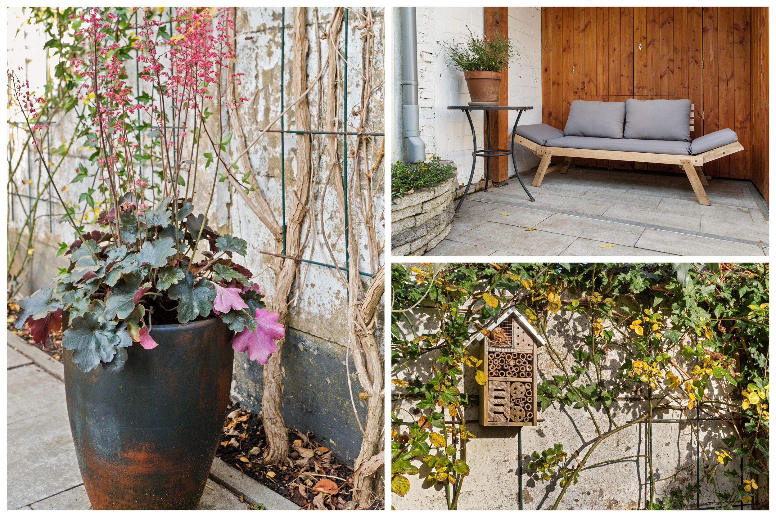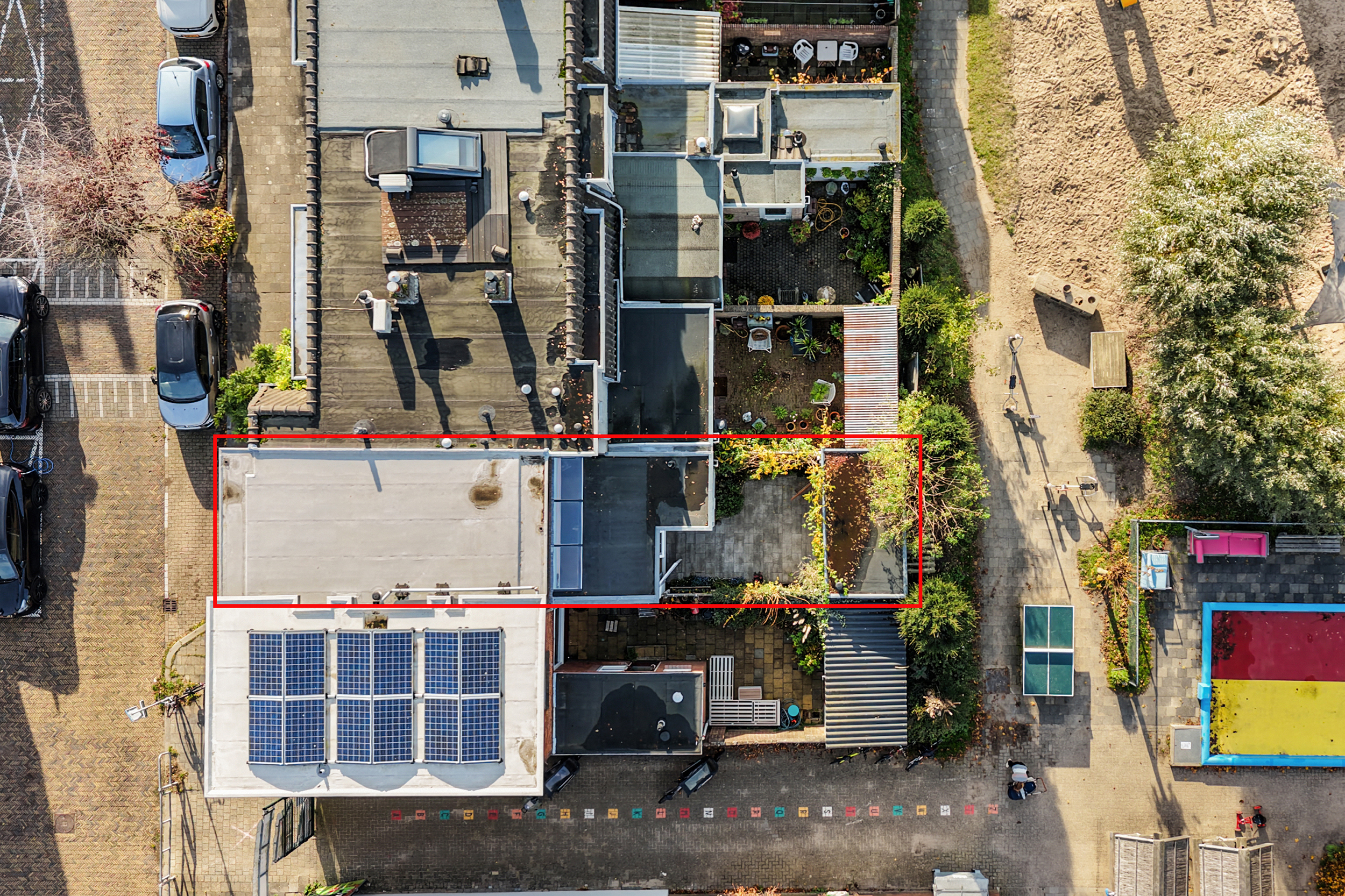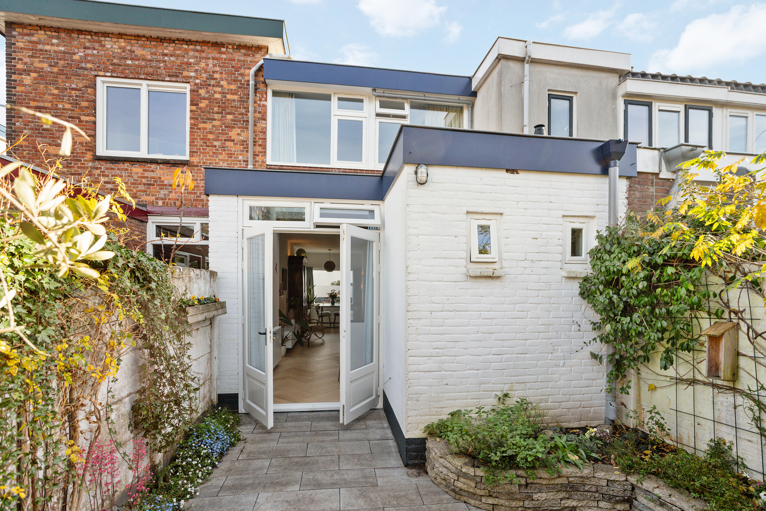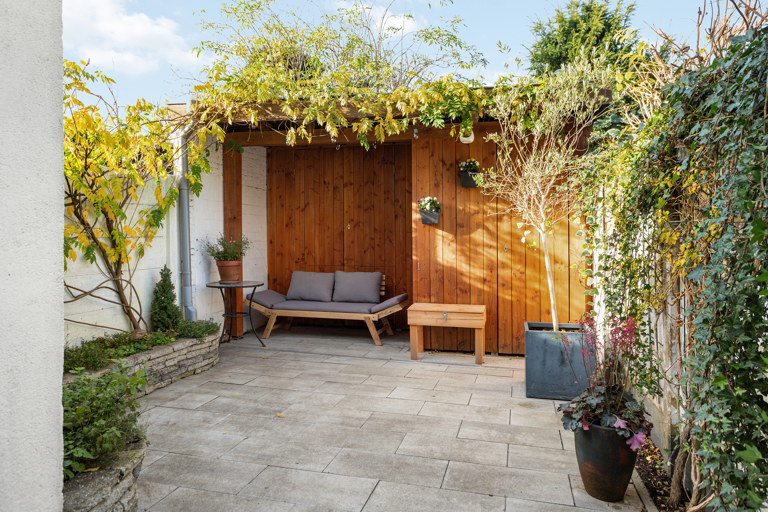 De tuin achter de woning is een rustige, groene plek midden in de stad. Via de openslaande deuren stap je het terras op, waar je heerlijk kunt genieten van middag- en avondzon. De borders met klimplanten en vaste beplanting geven de tuin een natuurlijke, sfeervolle uitstraling. Achterin staat een houten schuur met daarnaast een overdekte zitplek, een knusse hoek waar je beschut kunt loungen, ook in het voor- en najaar. De tuin is onderhoudsvriendelijk aangelegd en biedt een fijne balans tussen groen en comfort, een ideale plek om te ontspannen, te borrelen of op zonnige dagen buiten te eten.