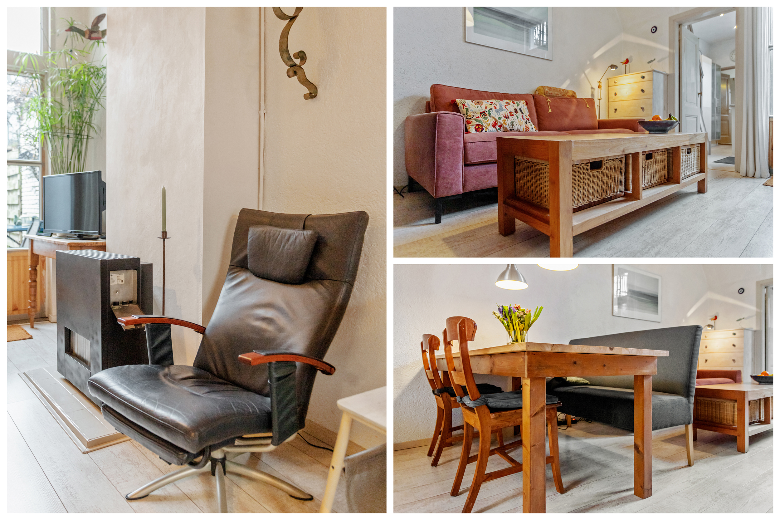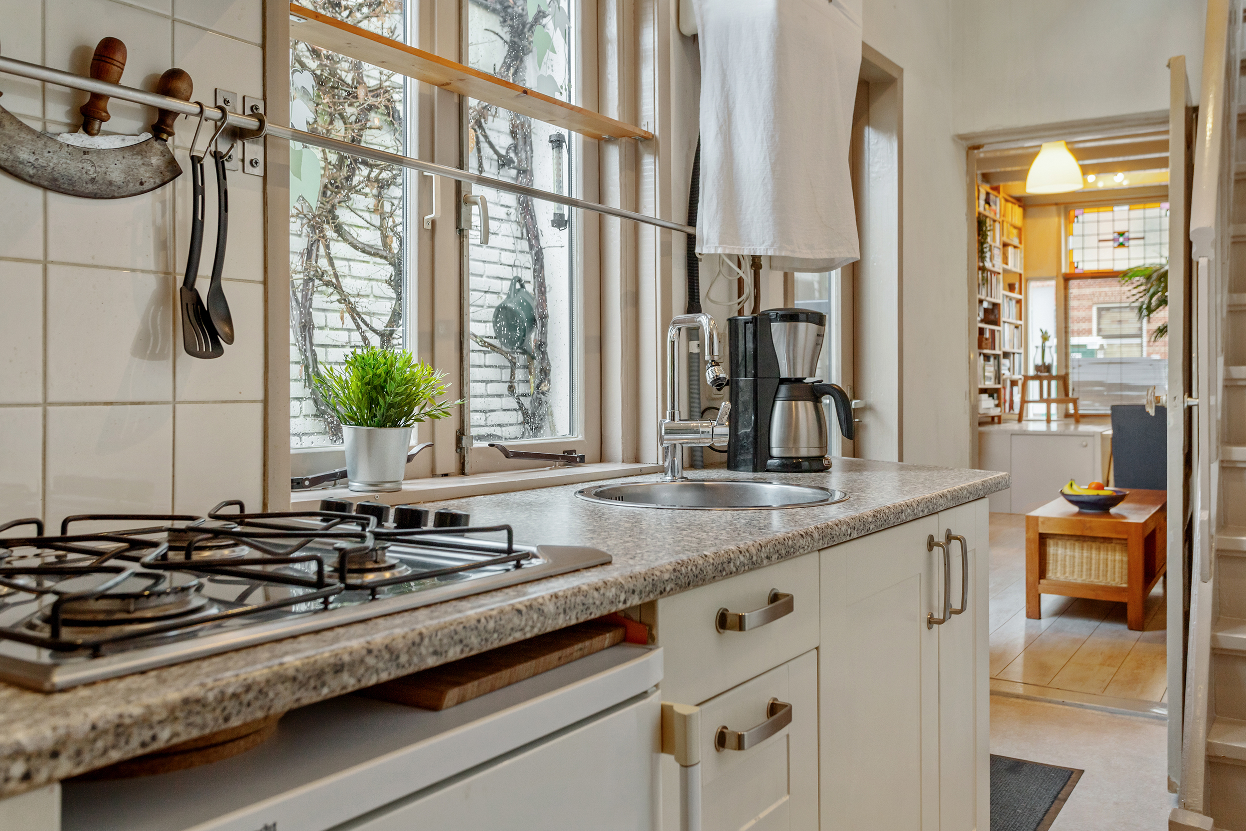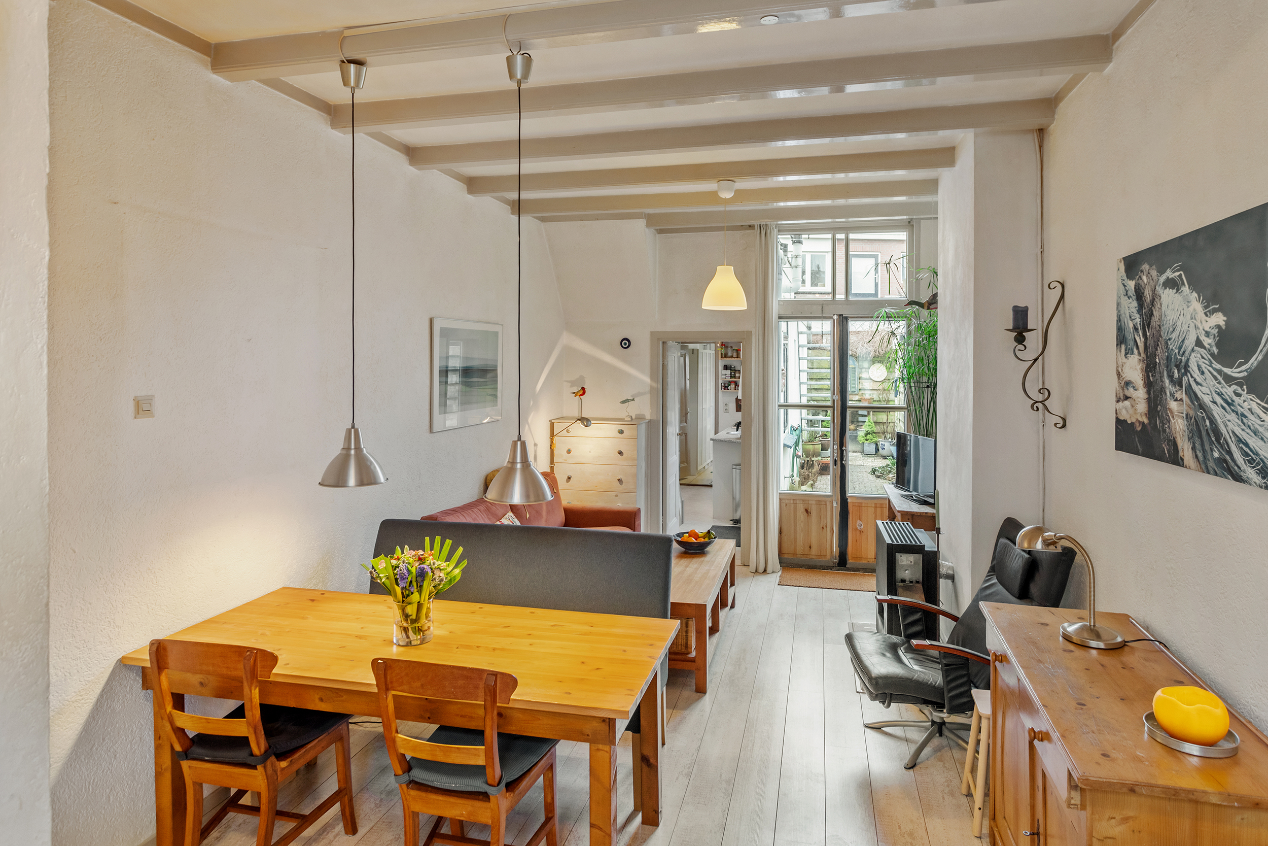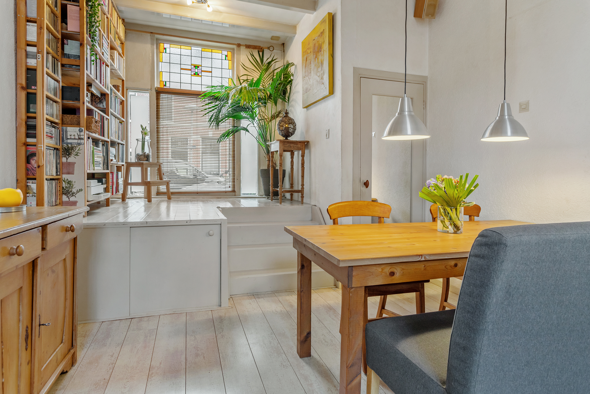 Je komt binnen in de hal met ruimte voor een garderobe, vanaf hier heb je toegang tot de woonkamer. Deze ruimte van maar liefst 24 m² met een uitzonderlijke plafondhoogte van 3 meter is het kloppende hart van de woning. De authentieke houten balkenplafonds geven de kamer een warme, tijdloze uitstraling, terwijl het prachtige originele glas-in-loodraam aan de voorzijde een spel van warm gekleurd licht door de ruimte verspreidt. Een van de meest opvallende details is de verhoogde vloer aan de straatzijde: slim ontworpen, met eronder de toegang naar de kelder. Het geeft de woonkamer een speelse, gelaagde sfeer die je in weinig woningen tegenkomt. De openslaande deuren aan de achterzijde verbinden de woonkamer prettig met de tuin en zorgen voor een fijne lichtinval.