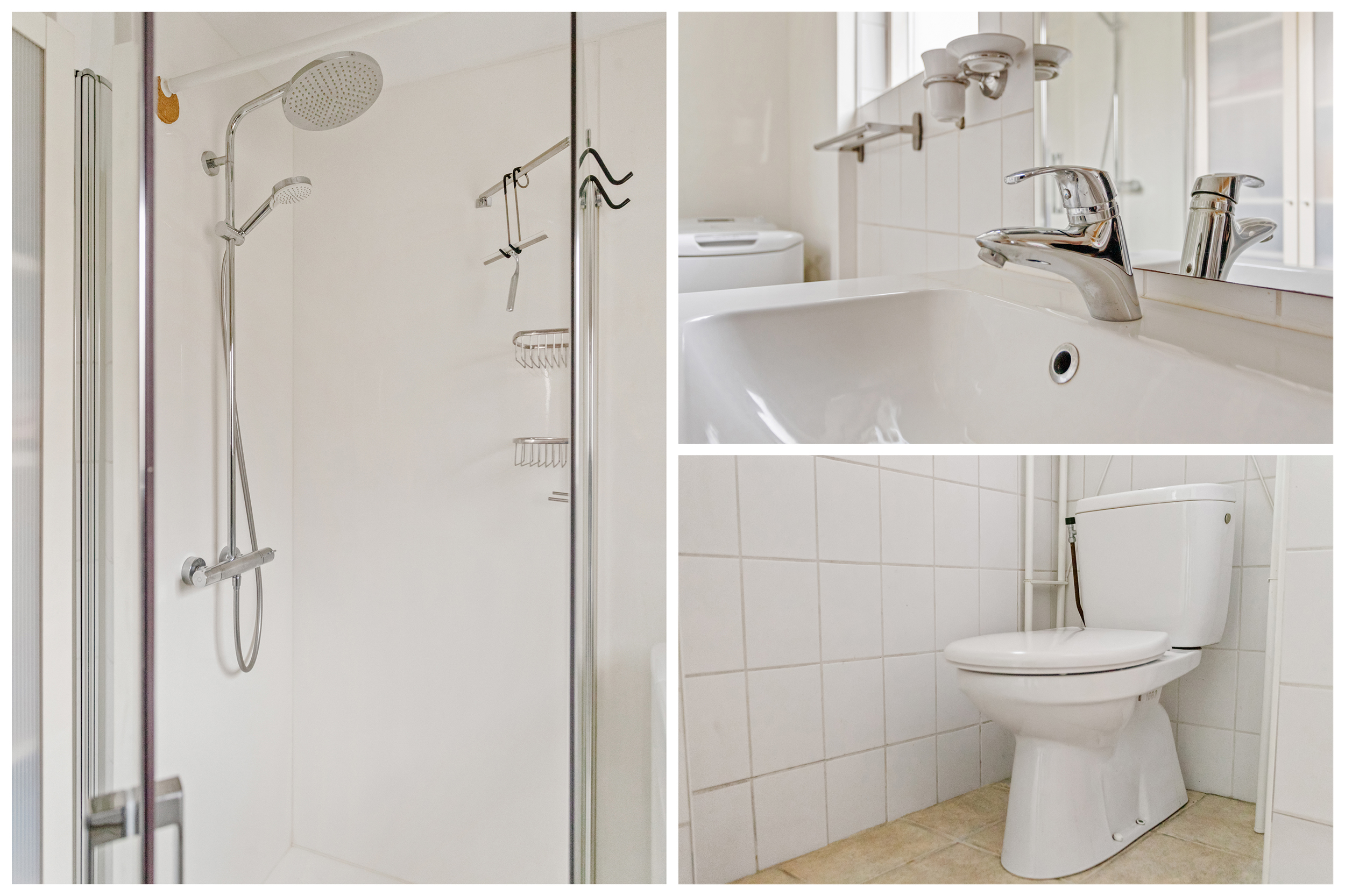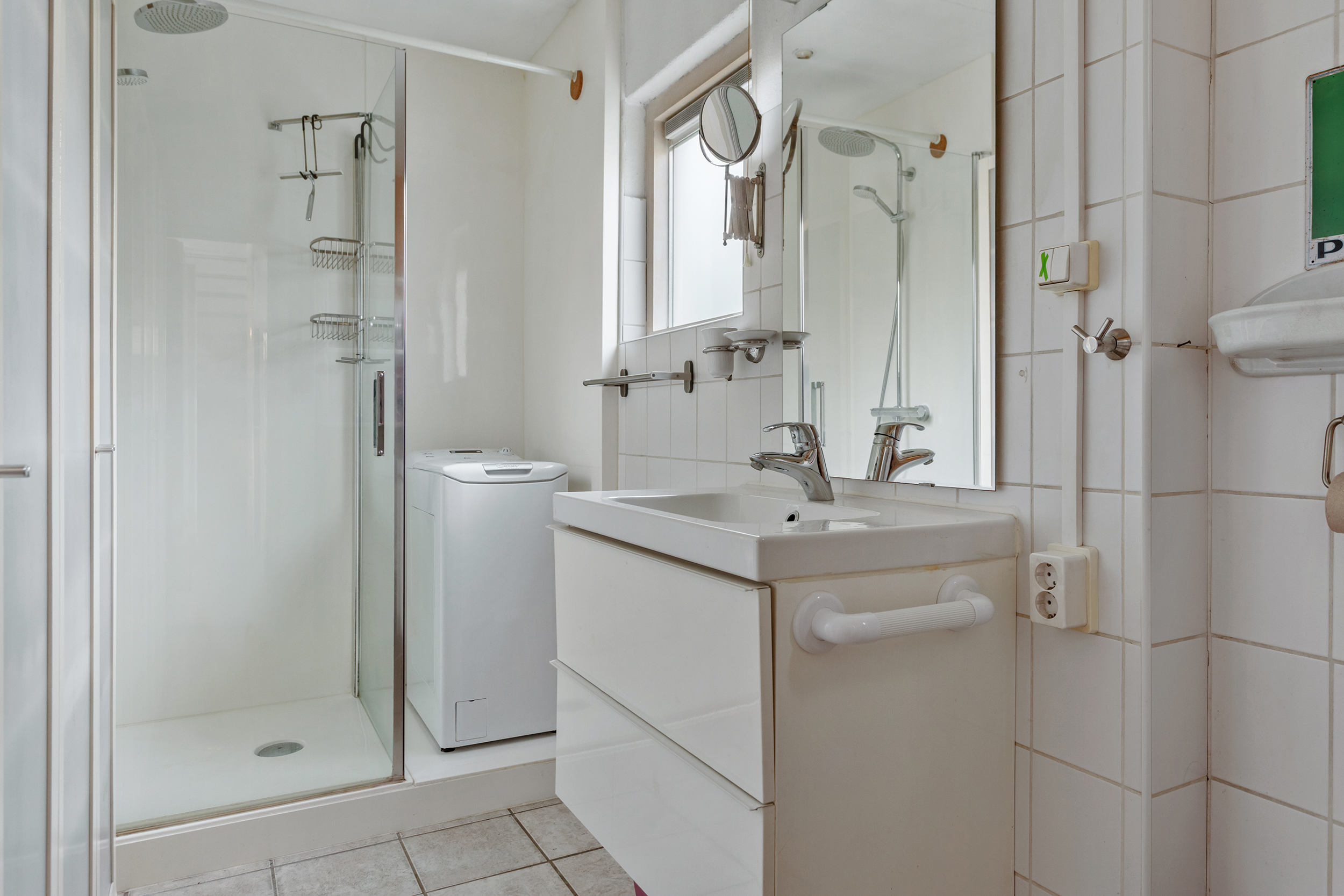 De badkamer is verzorgd en functioneel, voorzien van een douche (vernieuwd in 2021), wastafelmeubel en toilet.