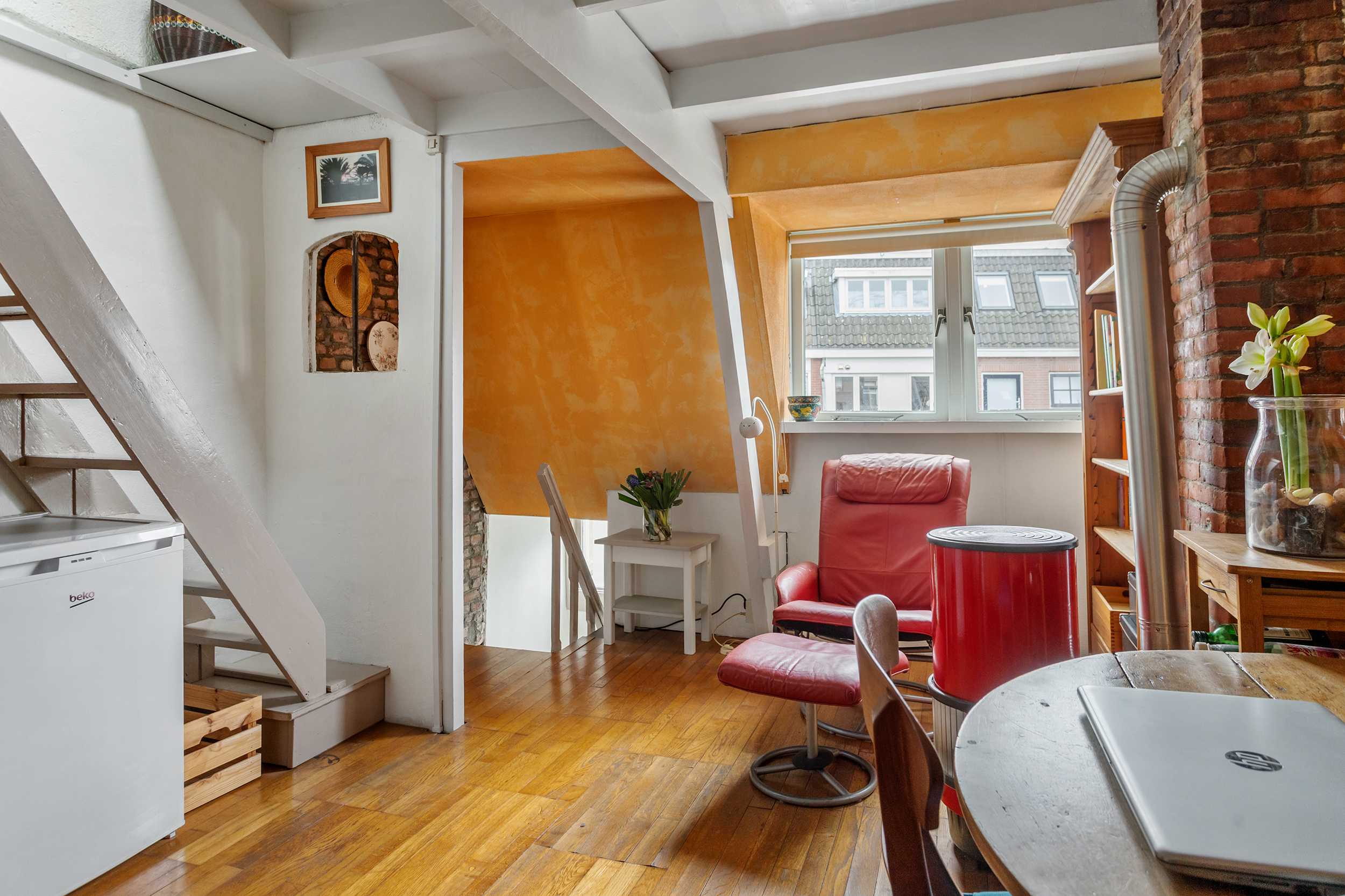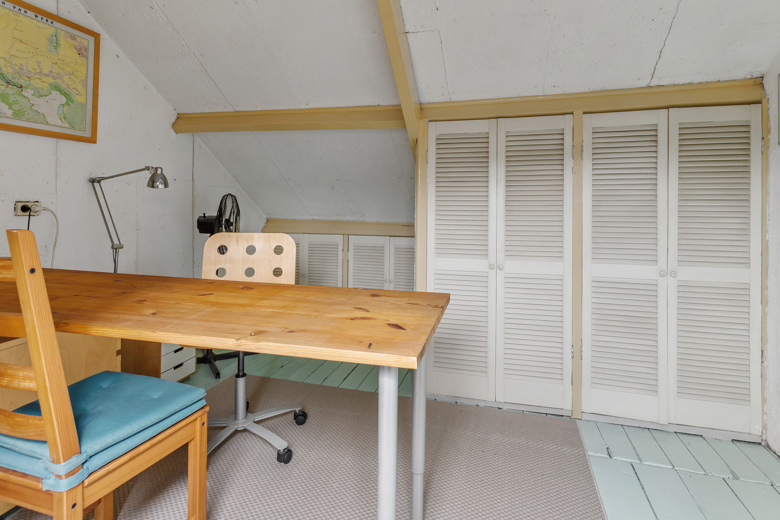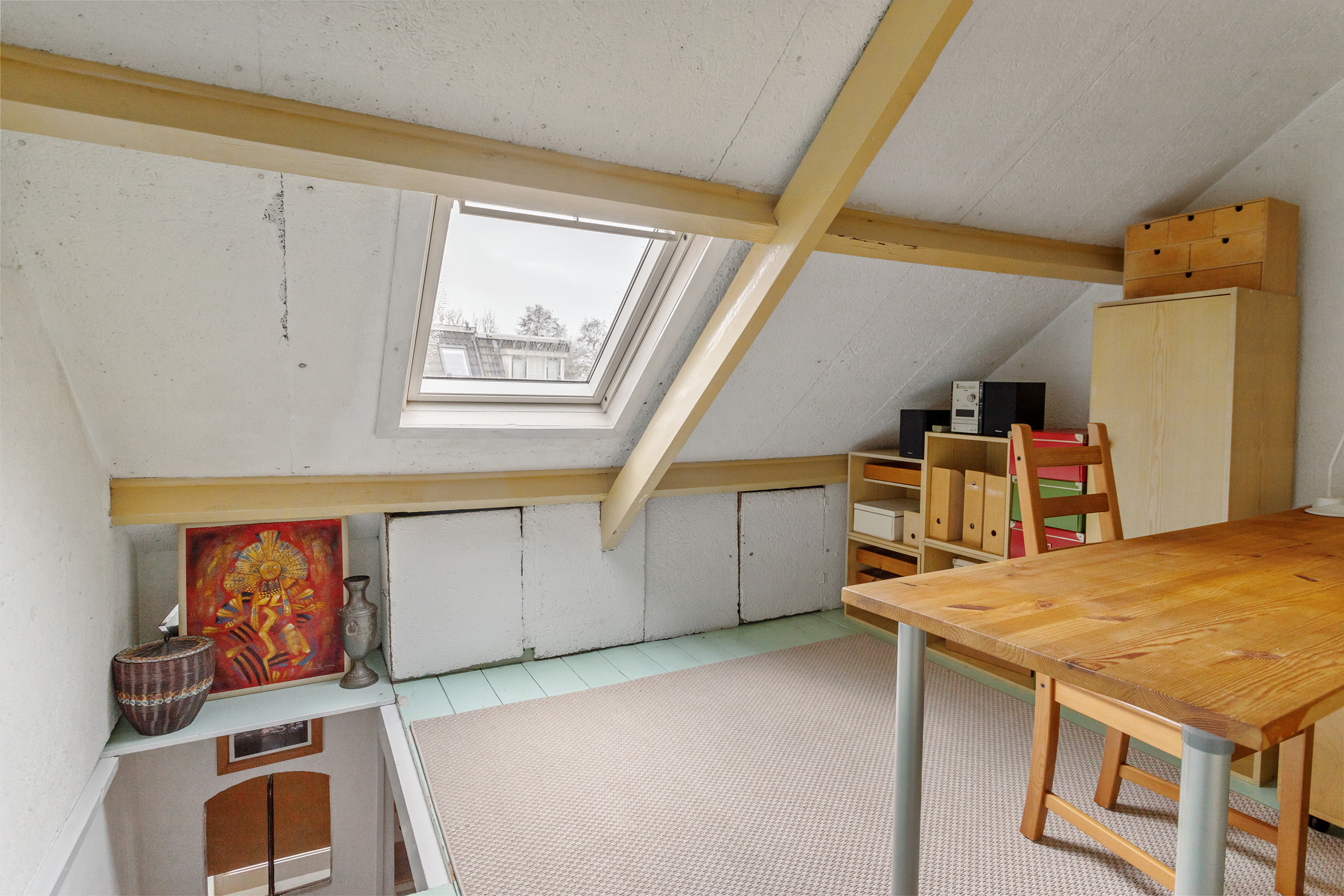 De zolderverdieping van circa 10 m² met dakraam biedt een fijne extra ruimte. Perfect als werkplek, logeerkamer, atelier of als praktische bergruimte dankzij de ingebouwde kasten onder de schuine kap.
