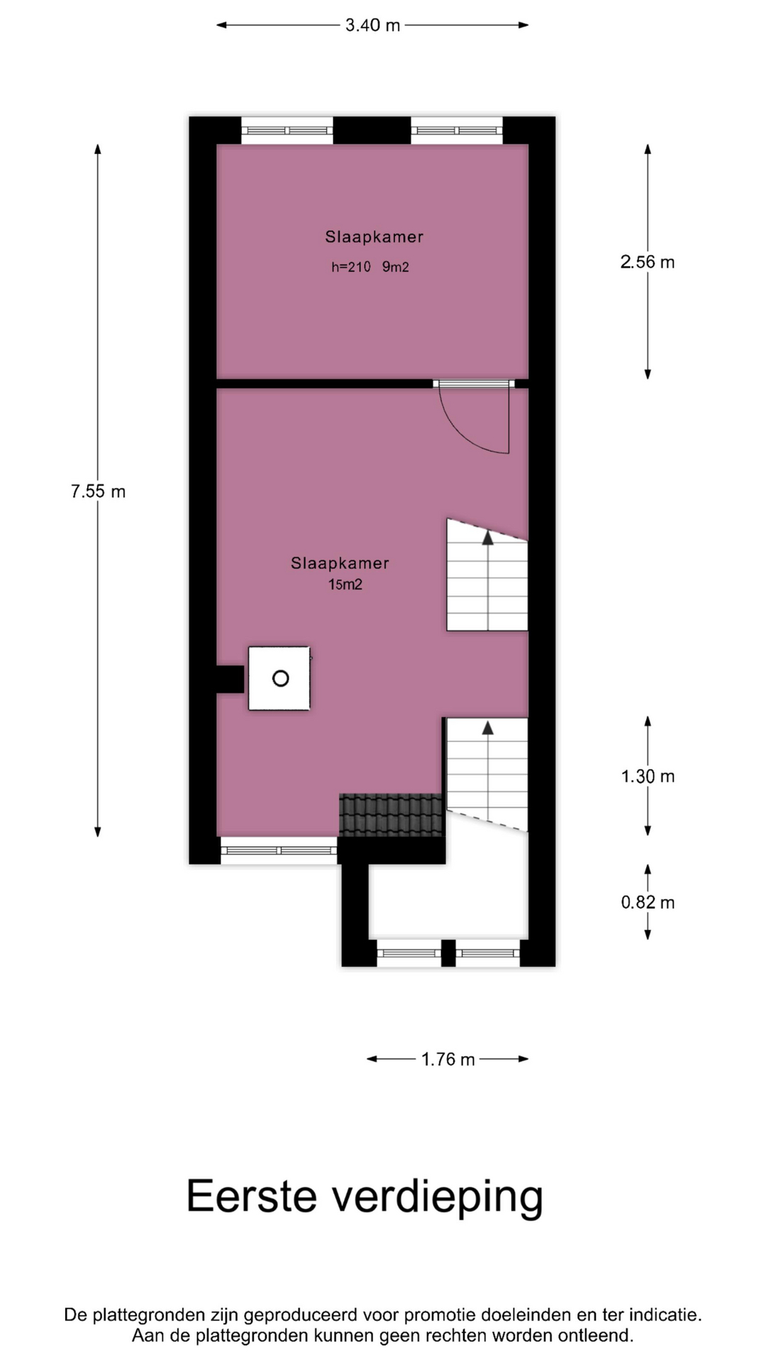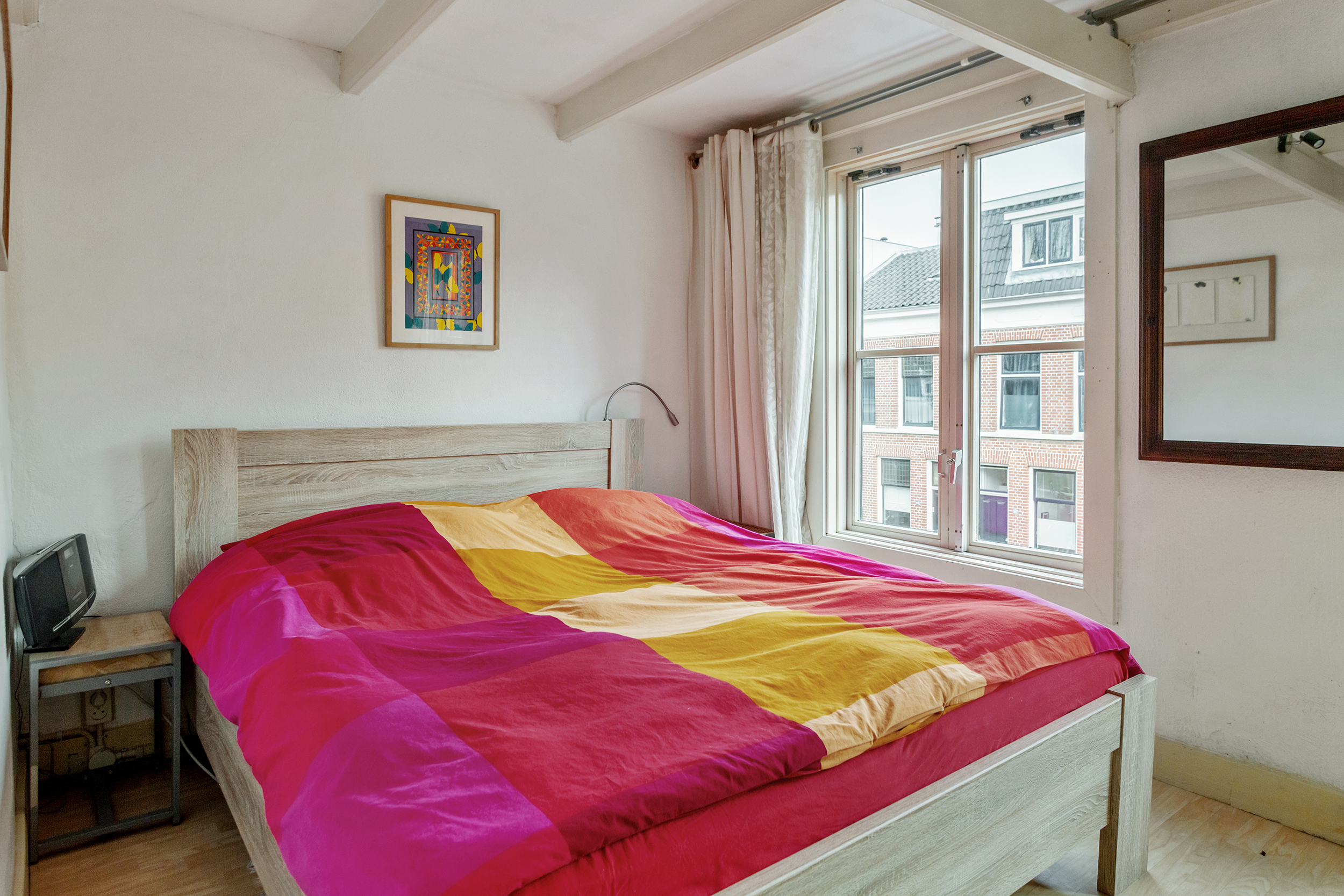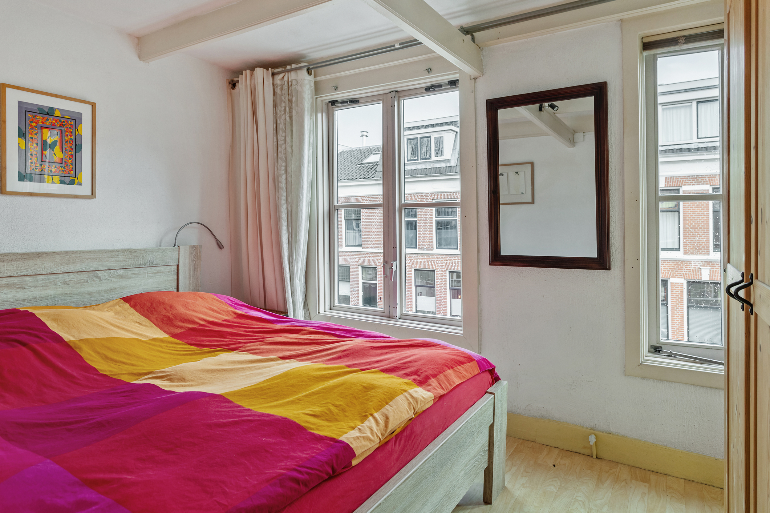 Op de eerste verdieping vind je twee ruime en lichte kamers. De kamer aan de achterzijde (circa 15 m²) is een prettige hoofdslaapkamer met voldoende ruimte voor een comfortabel slaapgedeelte en kastruimte.