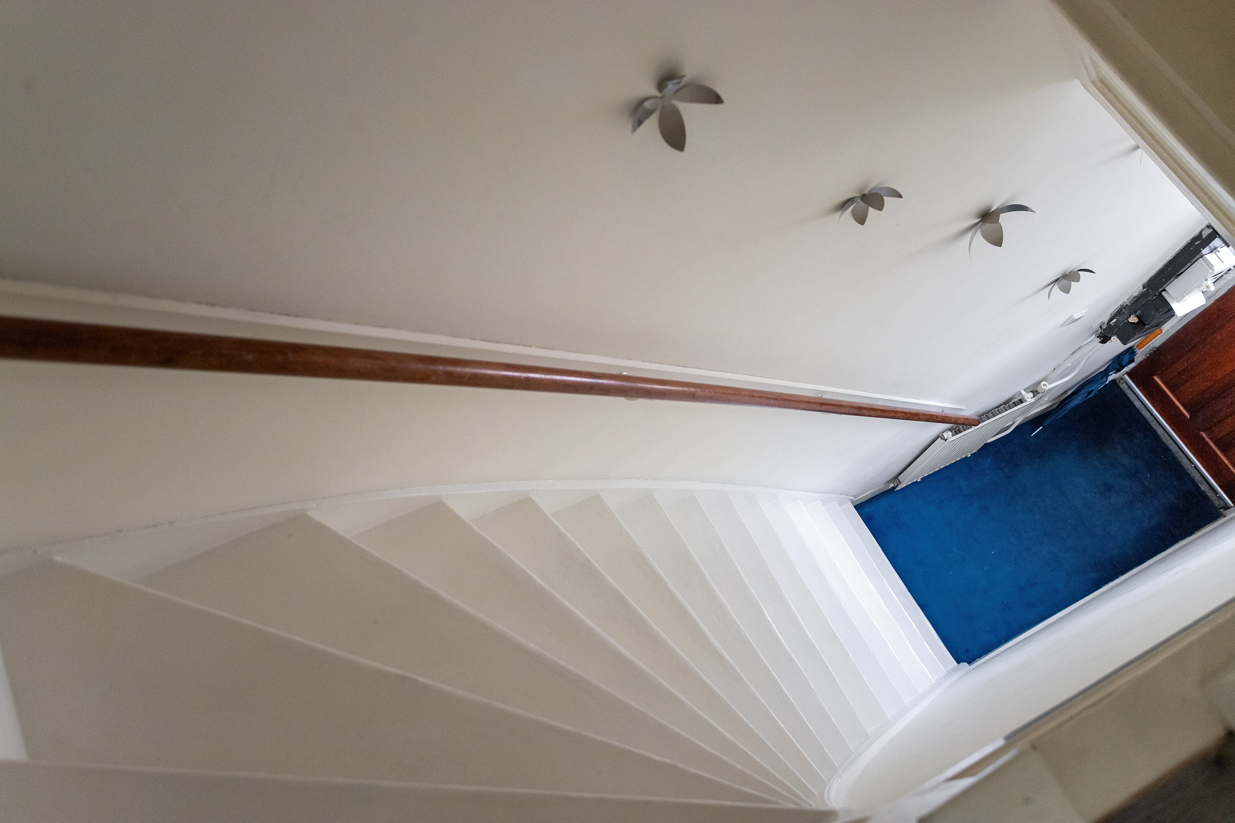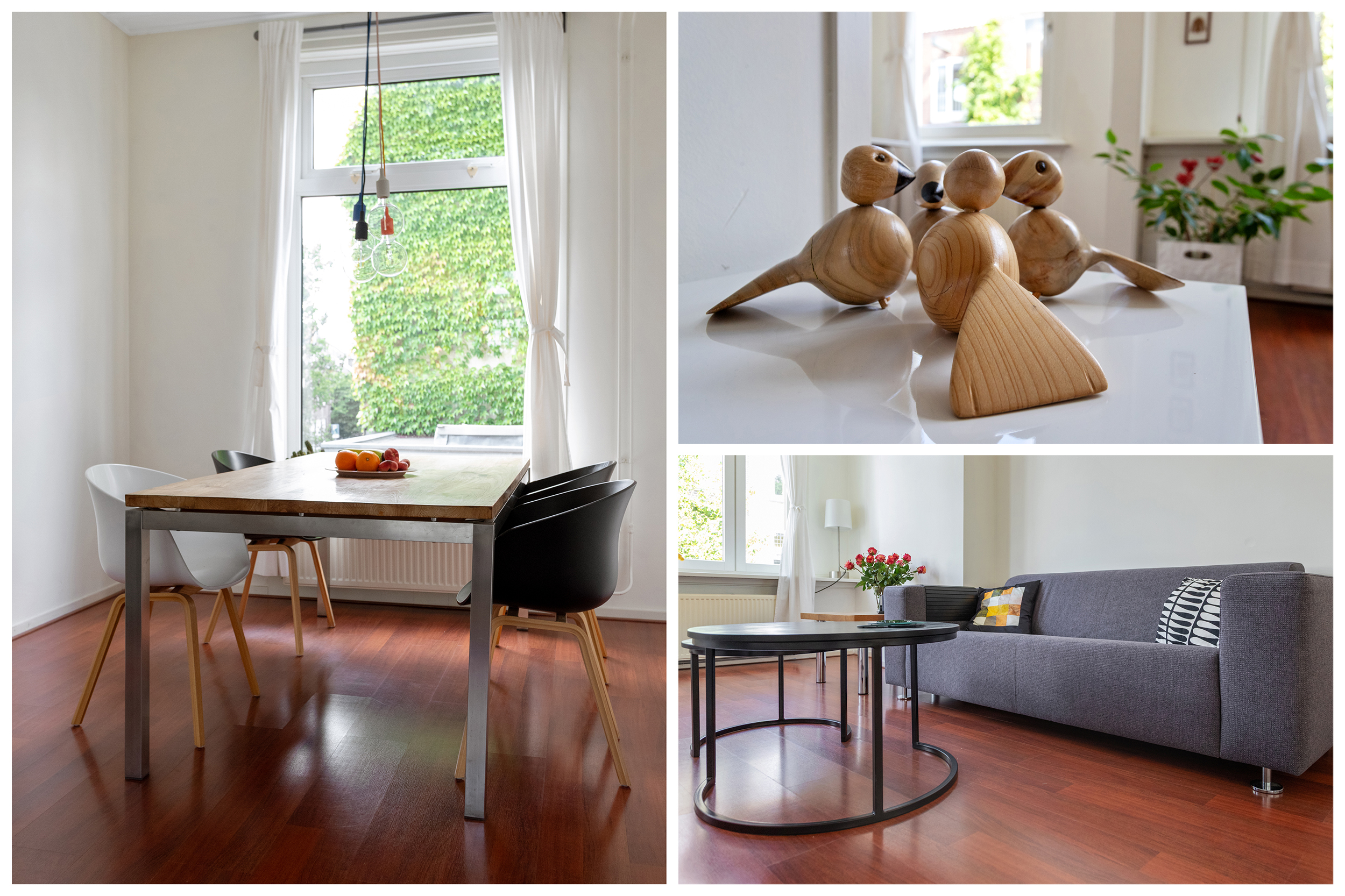 De overloop met trapopgang naar de tweede verdieping geeft toegang tot alle vertrekken op deze etage. De woonkamer strekt zich uit over de volledige lengte van de woning en is aan zowel de voor- als achterzijde voorzien van grote raampartijen. Hierdoor geniet je de hele dag van een overvloed aan natuurlijk licht en ontstaat er een sfeervolle doorzonkamer die royaal en uitnodigend aanvoelt. De plafonds reiken hier tot bijna drie meter hoogte, wat het ruimtelijke karakter nog verder versterkt. Er is meer dan genoeg plaats voor zowel een royale eettafel als een comfortabele zithoek. Bovendien is er een aangename plek aan het raam die zich perfect leent voor een werkruimte – ideaal voor thuiswerken of studeren.