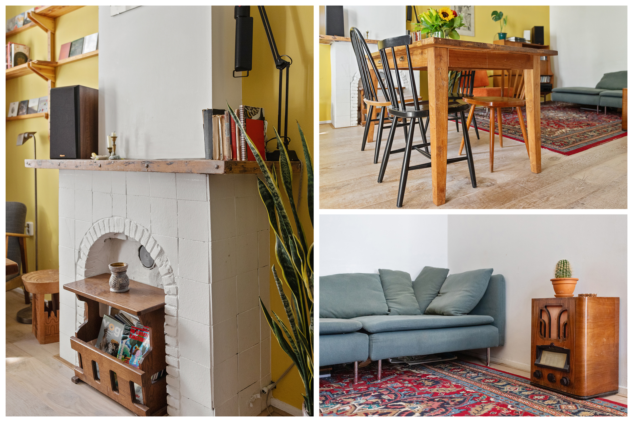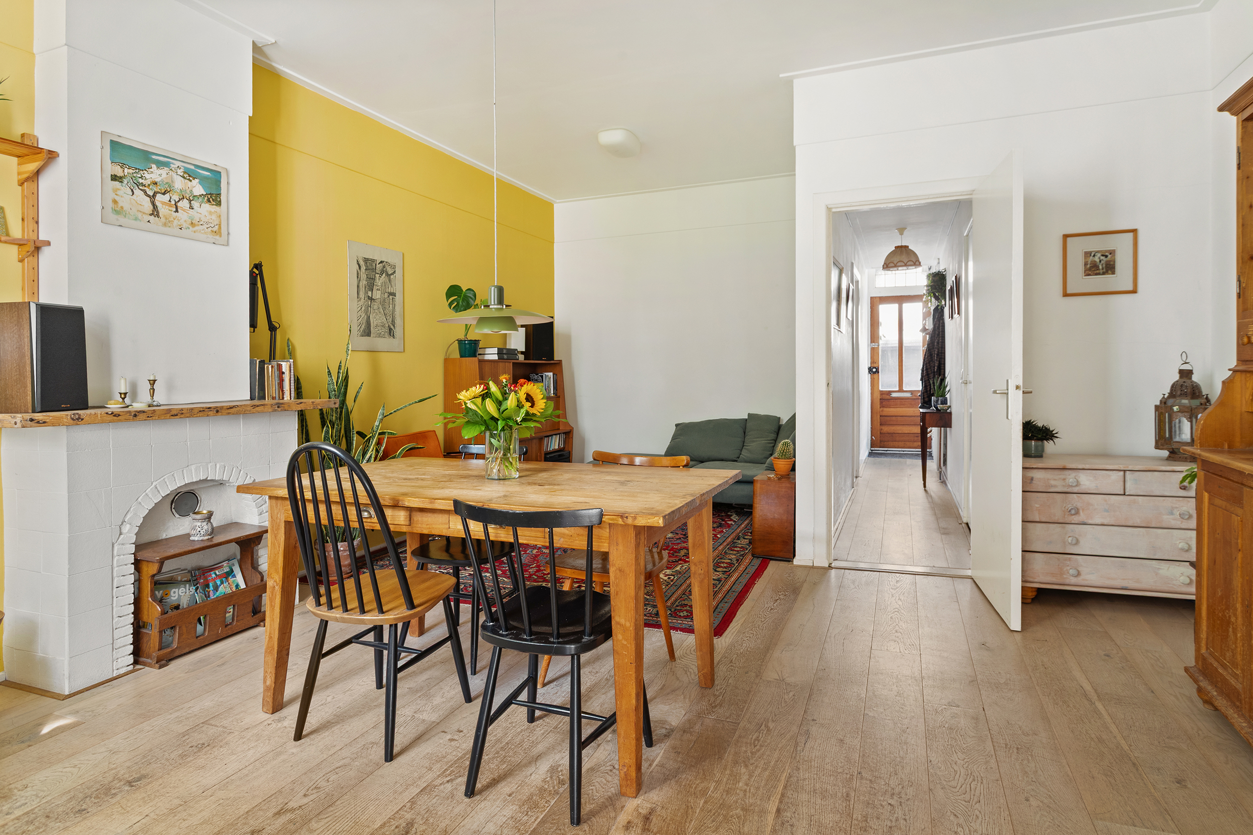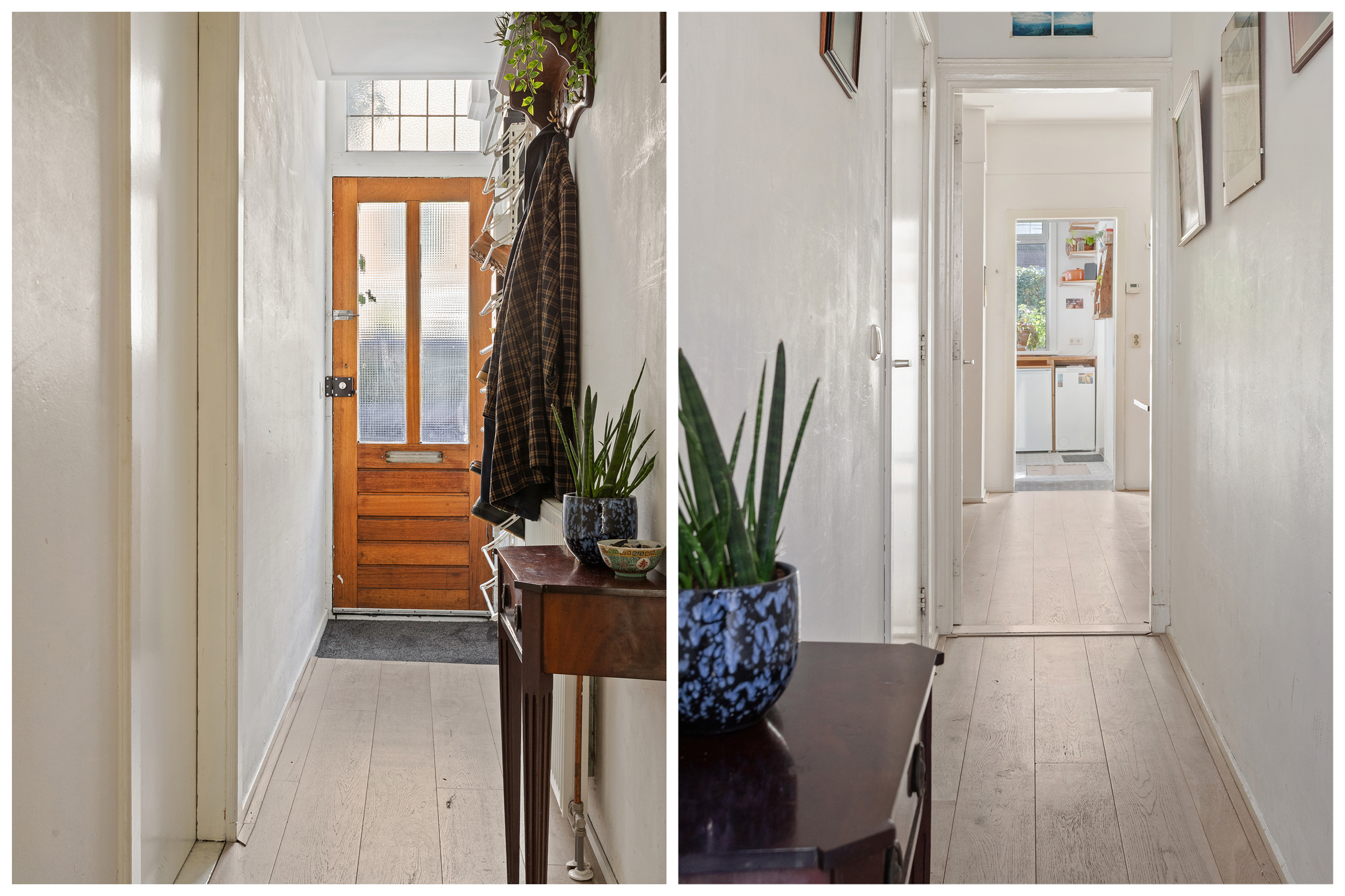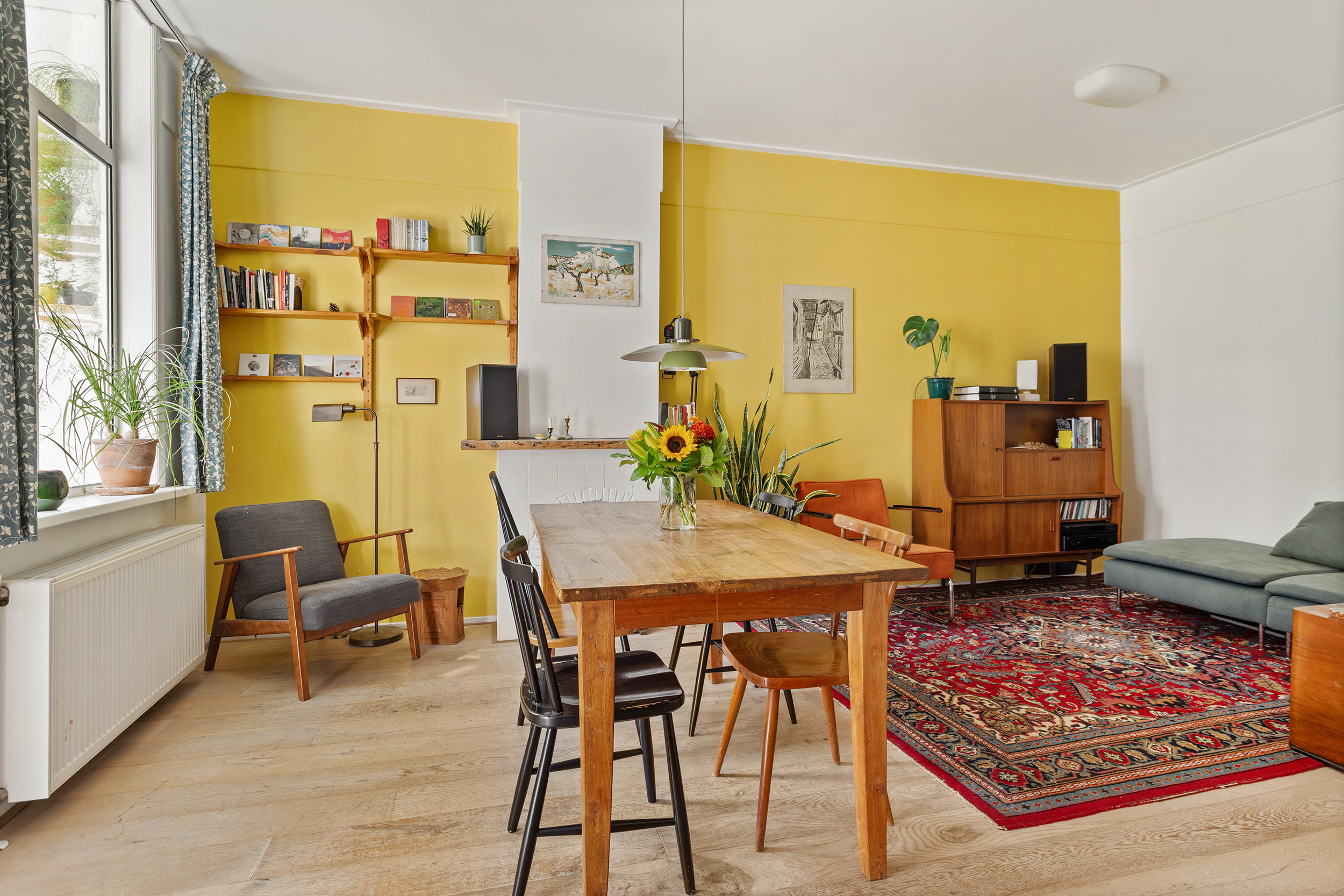 Je komt binnen in de hal met ruimte voor een garderobe, die toegang biedt tot de slaapkamer, badkamer en de ruime woonkamer. Dankzij de grote raampartijen stroomt het daglicht rijkelijk naar binnen, wat samen met het hoge plafond van 2,91 meter zorgt voor een heerlijk ruimtelijk gevoel. De kamer wordt verfraaid door een houten vloer en een originele schouw, en biedt meer dan genoeg ruimte voor een gezellige zithoek en een grote eettafel – perfect voor borrels en diners met vrienden en familie.