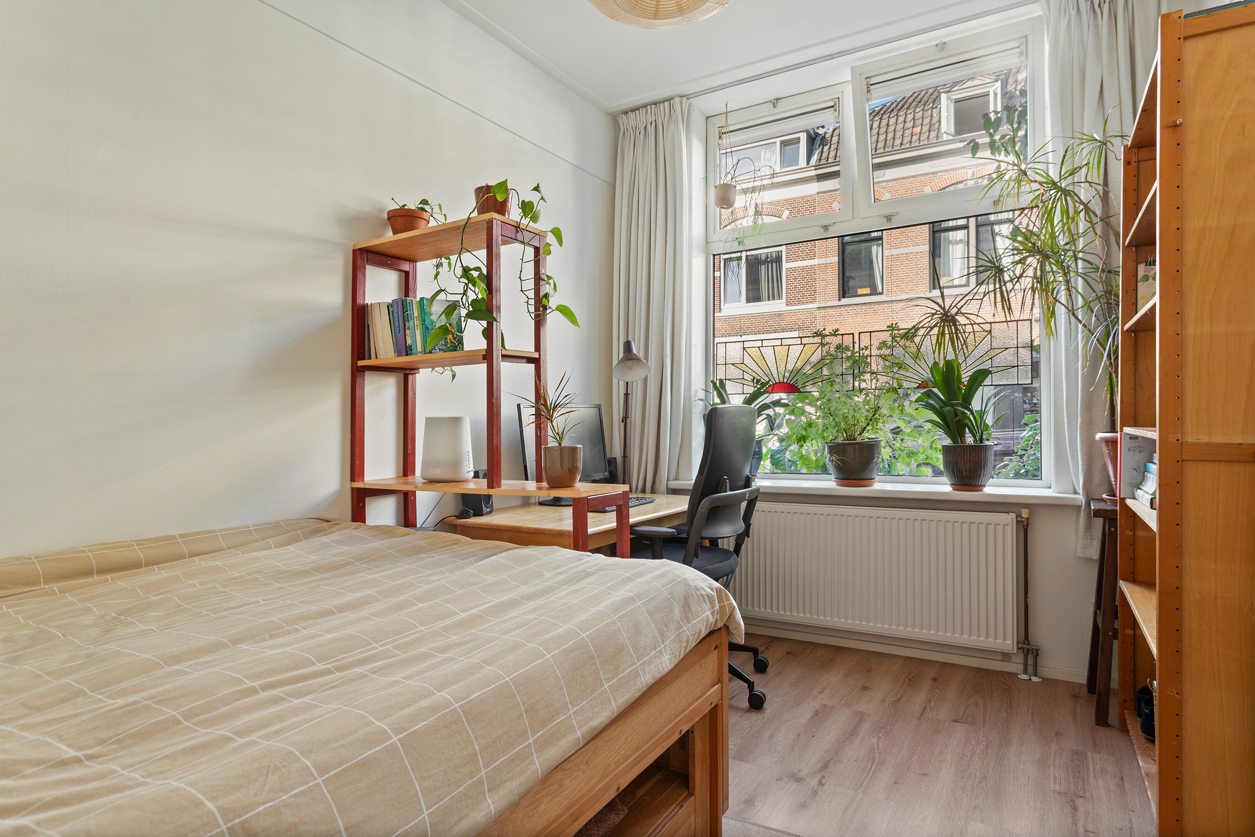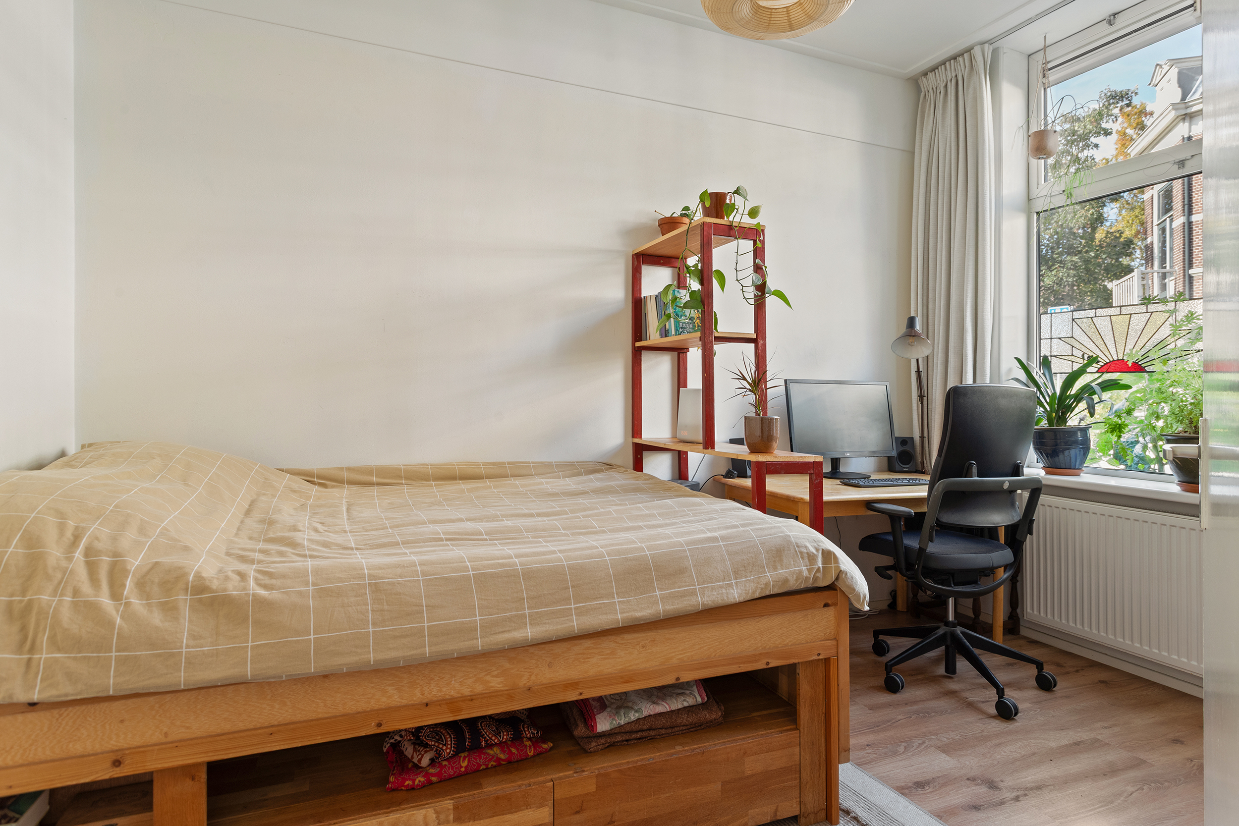 De slaapkamer bevindt zich aan de voorzijde van de woning en is eveneens heerlijk licht. Er is hier genoeg ruimte voor een comfortabel tweepersoonsbed en een ruime kastenwand.