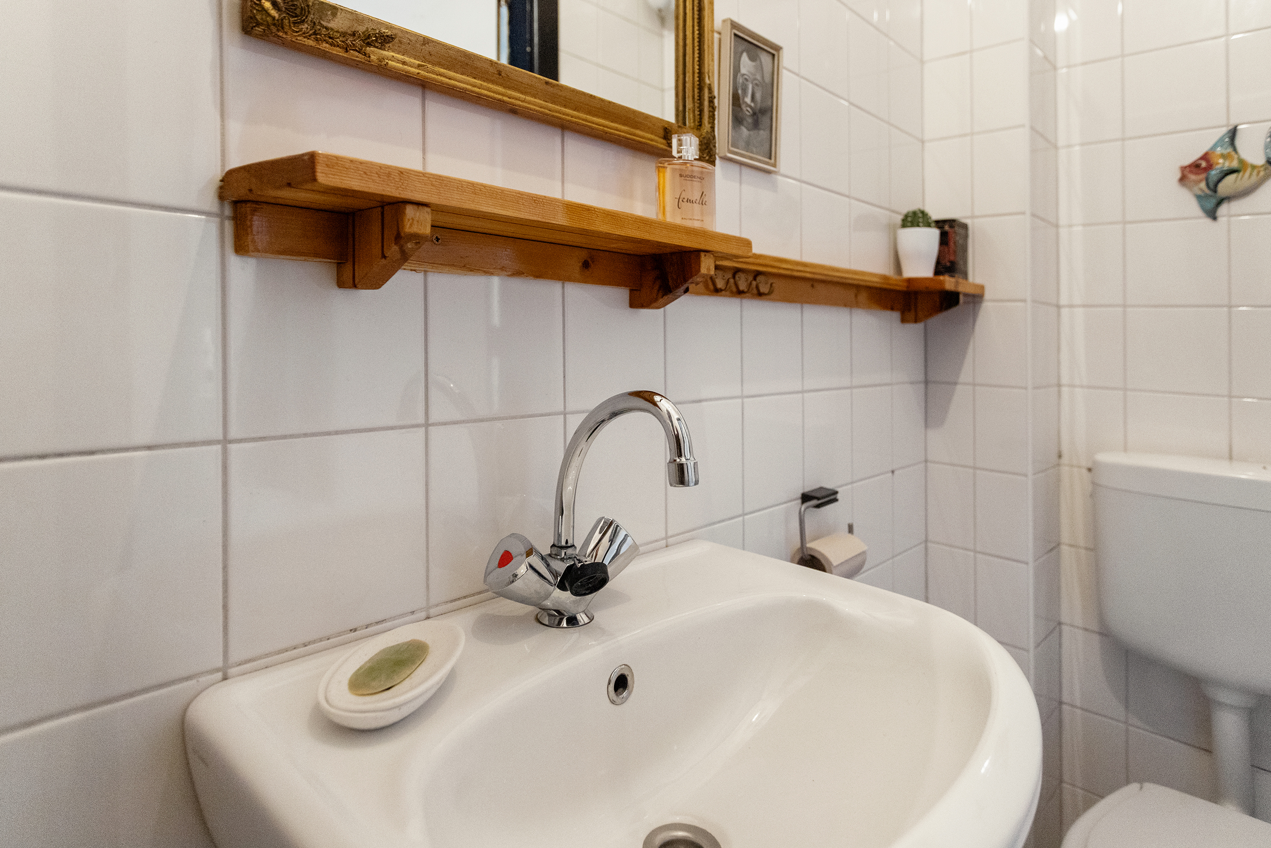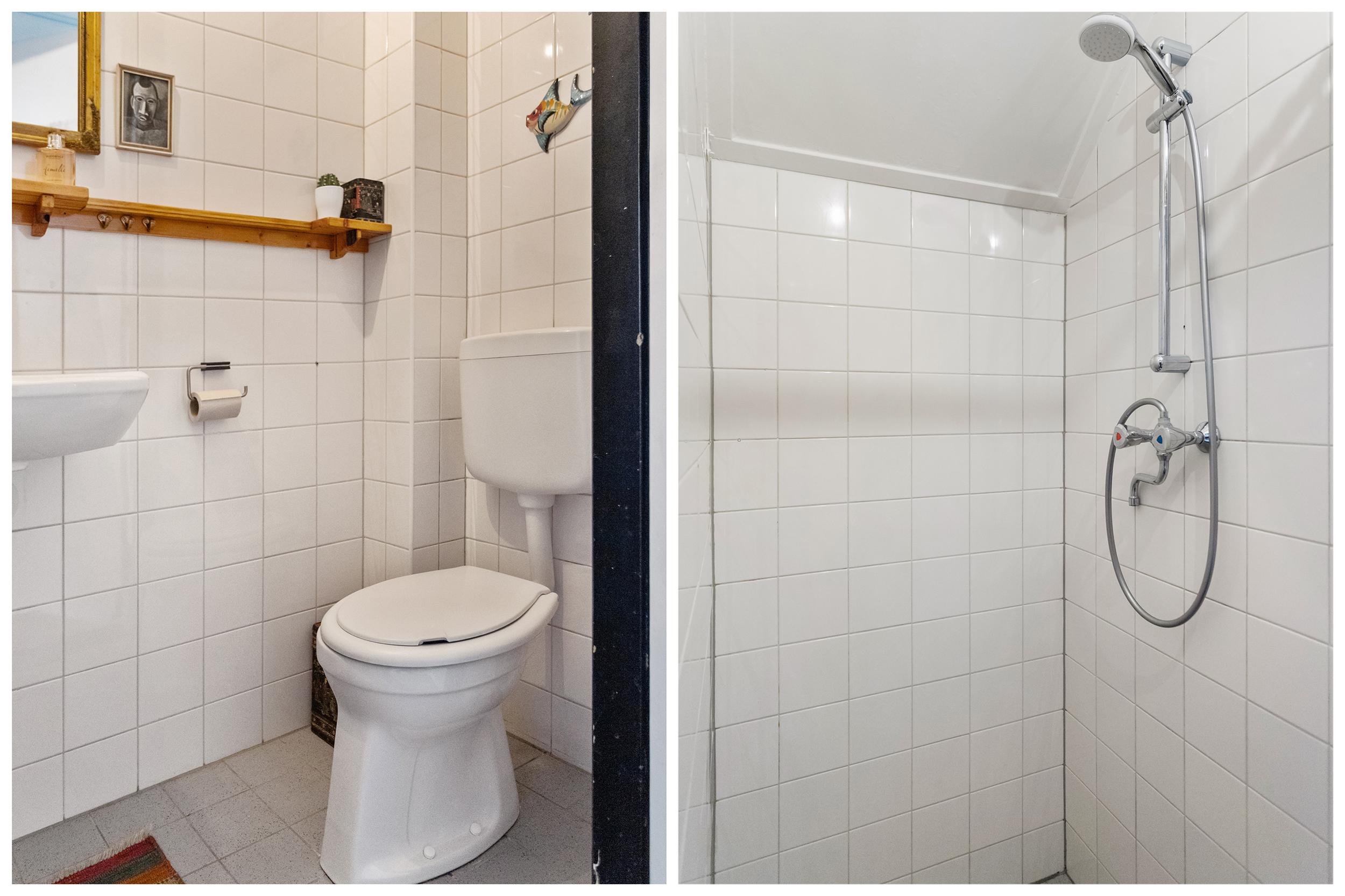 De badkamer is eenvoudig ingericht en beschikt over een douche, wastafel en toilet.
