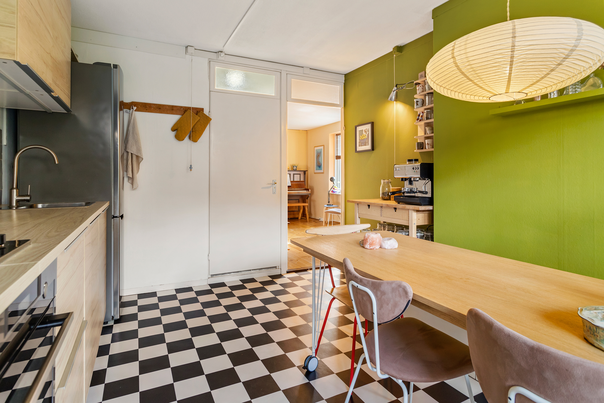 Aan de achterzijde ligt de keuken, een fijne en ruime leefkeuken van circa 13 m². Hier is voldoende plaats voor een grote eettafel, waardoor dit echt een tweede leefruimte wordt. De keuken is voorzien van alle benodigde inbouwapparatuur en heeft direct toegang tot de tuin, wat zorgt voor een prettige verbinding tussen binnen en buiten.