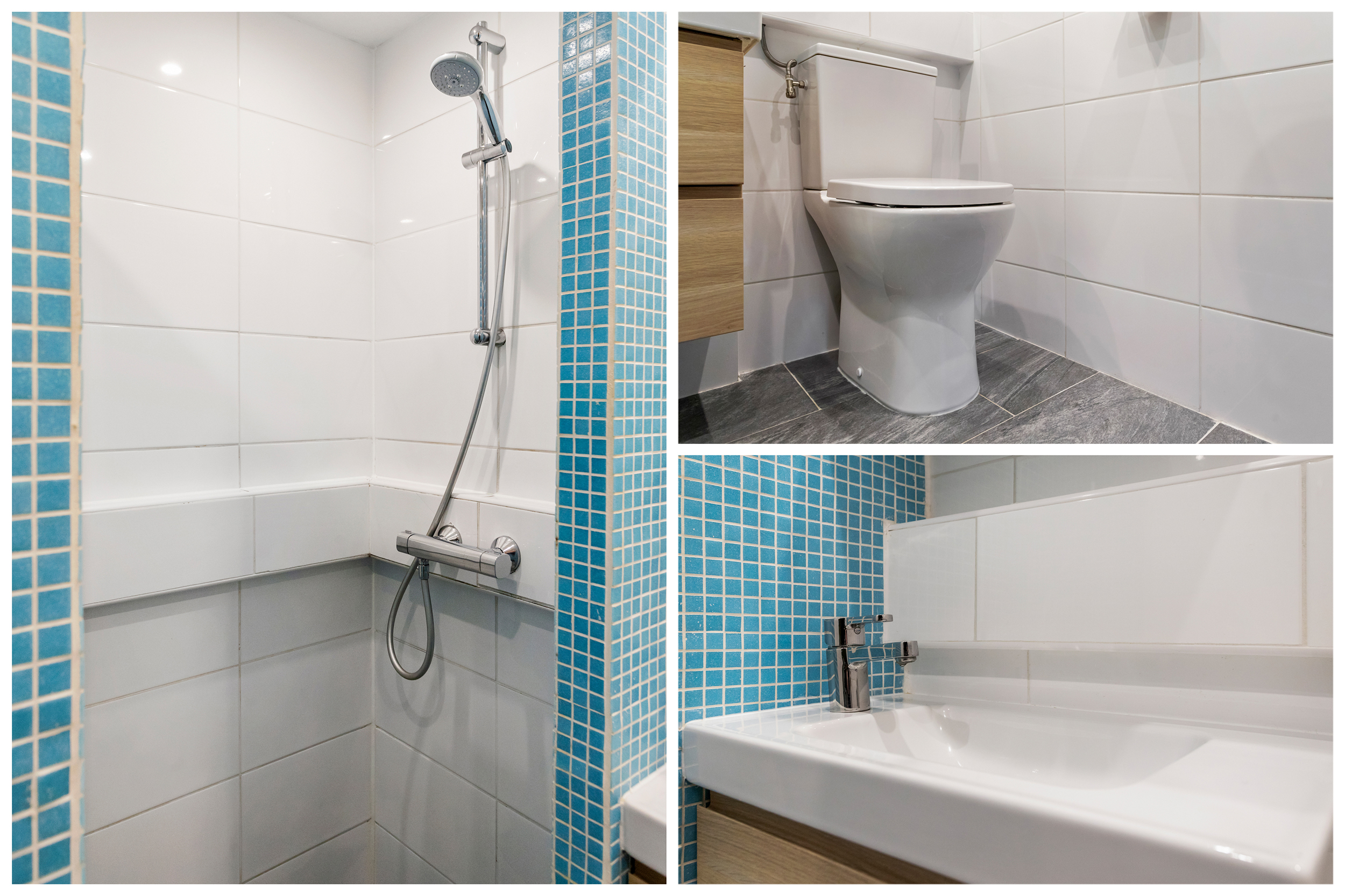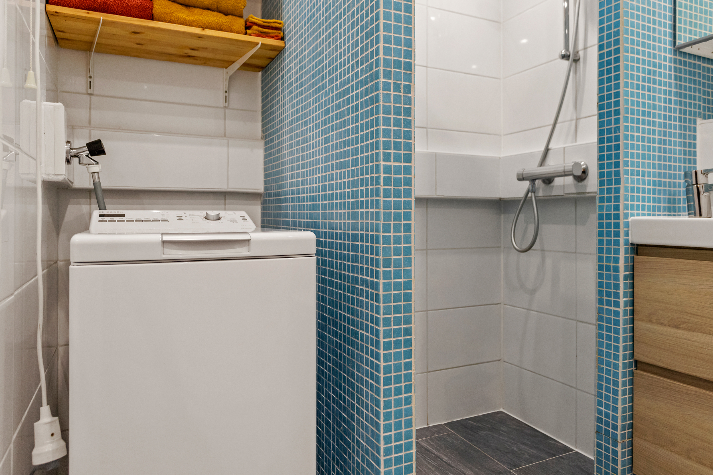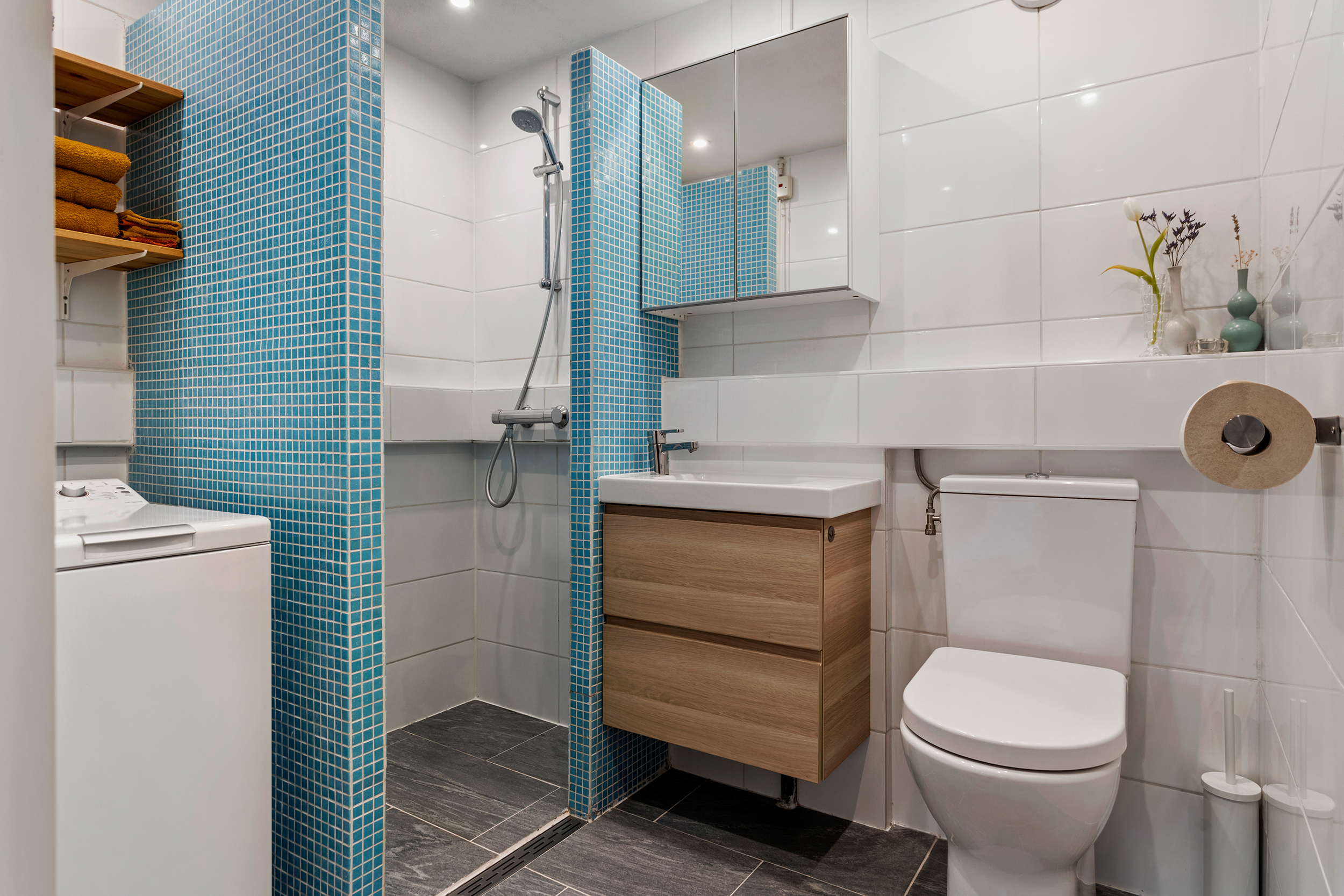 – Badkamer met douche, toilet, wastafelmeubel en wasmachineaansluiting