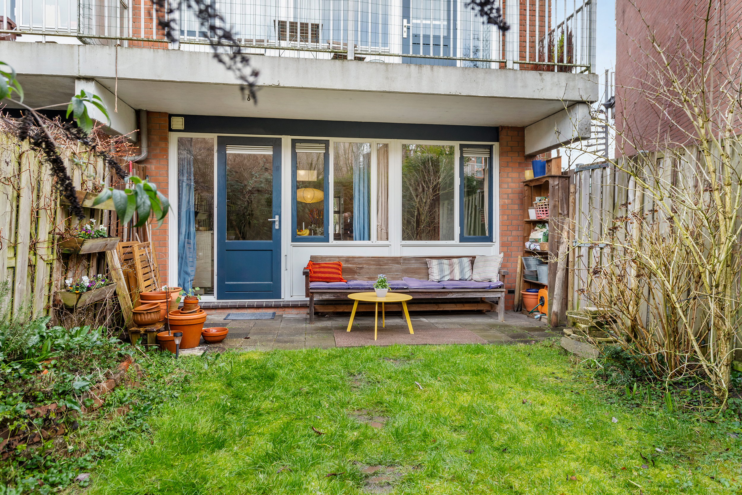Dit appartement beschikt over een uitzonderlijk diepe en groene achtertuin van circa 58 m², gelegen op het zuidwesten. Dat betekent vanaf de middag tot in de avond heerlijk zon in de tuin. Een zeldzame luxe bij een appartement. Direct aan de woning bevindt zich een ruim terras, ideaal voor een borrel of diner in de zon tot de in de avond. Vanuit hier kijk je uit over de tuin die speels is ingericht met gazon, borders, fruitbomen en volwassen beplanting.