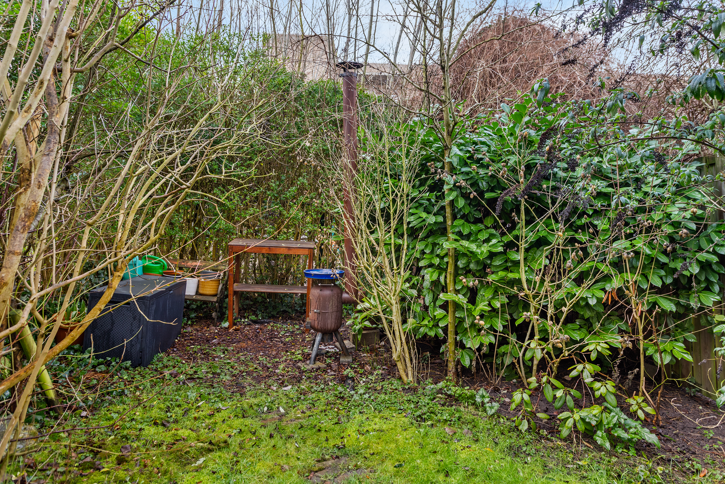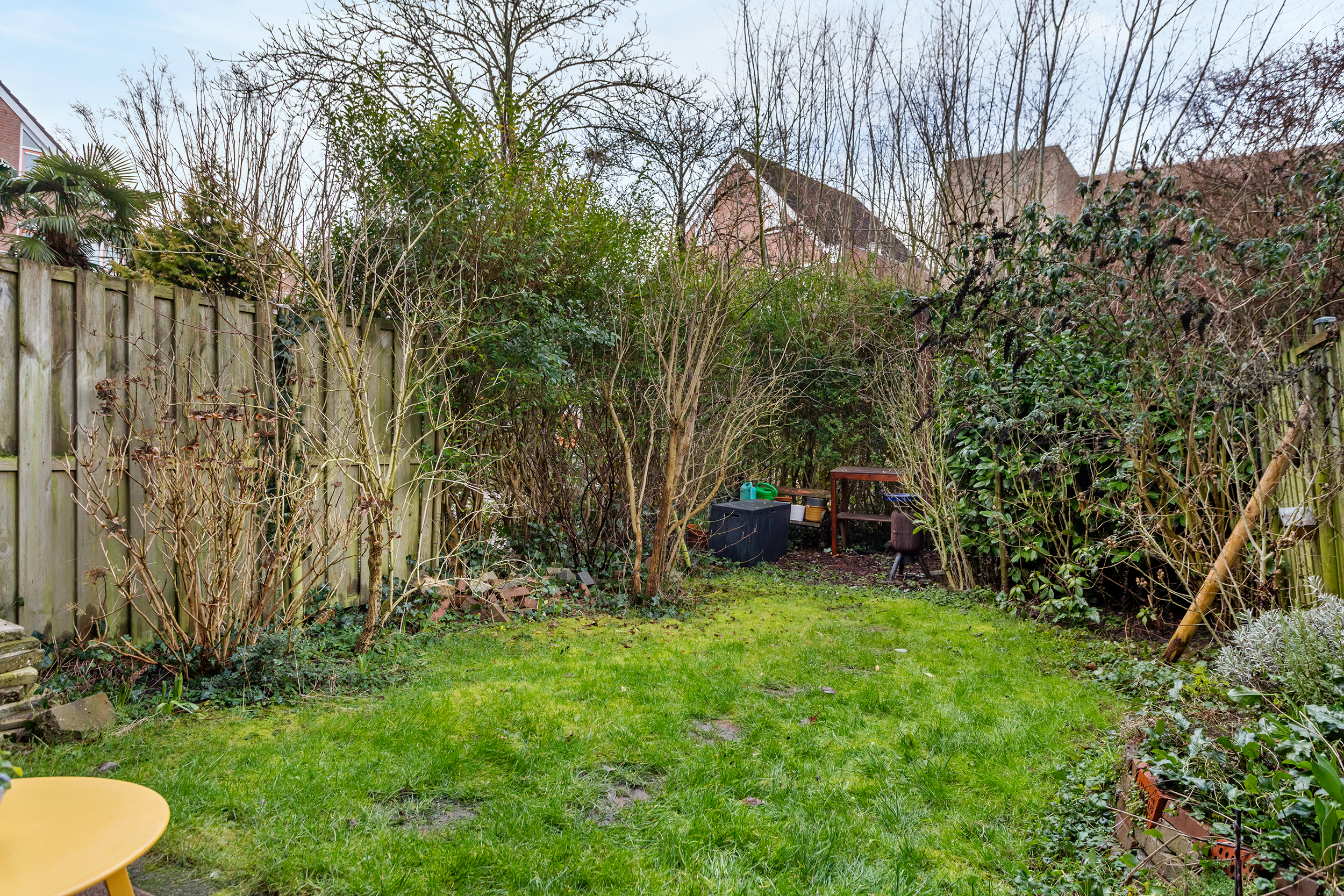 Dankzij de diepte ontstaat er een natuurlijke verdeling tussen een zonnig zitgedeelte en een meer beschutte plek achterin de tuin. Achterin vind je een sfeervolle hoek waar je in alle rust kunt zitten, tuinieren of een lange zomeravond kunt doorbrengen. De groene omzoming zorgt voor privacy en geeft de tuin een besloten karakter, waardoor je zeker in de zomer van volledige privacy geniet. Ook aan de voorzijde is een voortuin aanwezig. Een fijne plek waar je bijvoorbeeld een klein zitje kunt creëren om rustig buiten te zitten en tegelijkertijd wat reuring van de straat mee te krijgen.