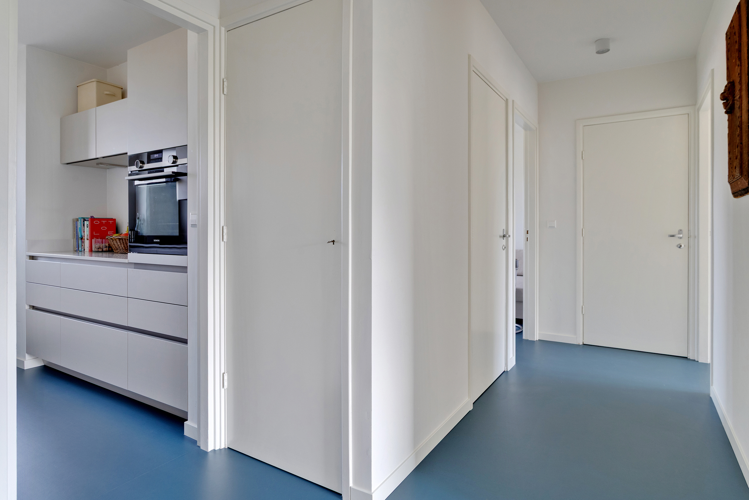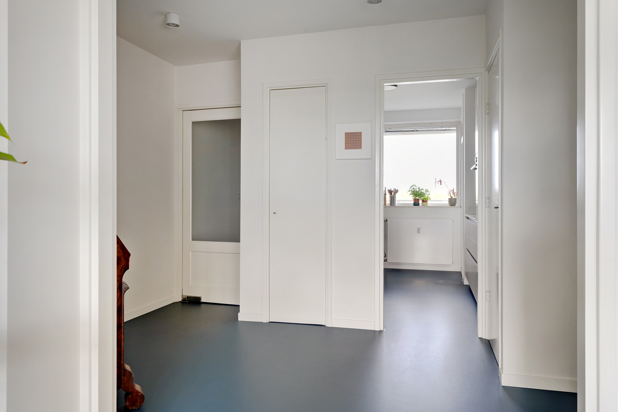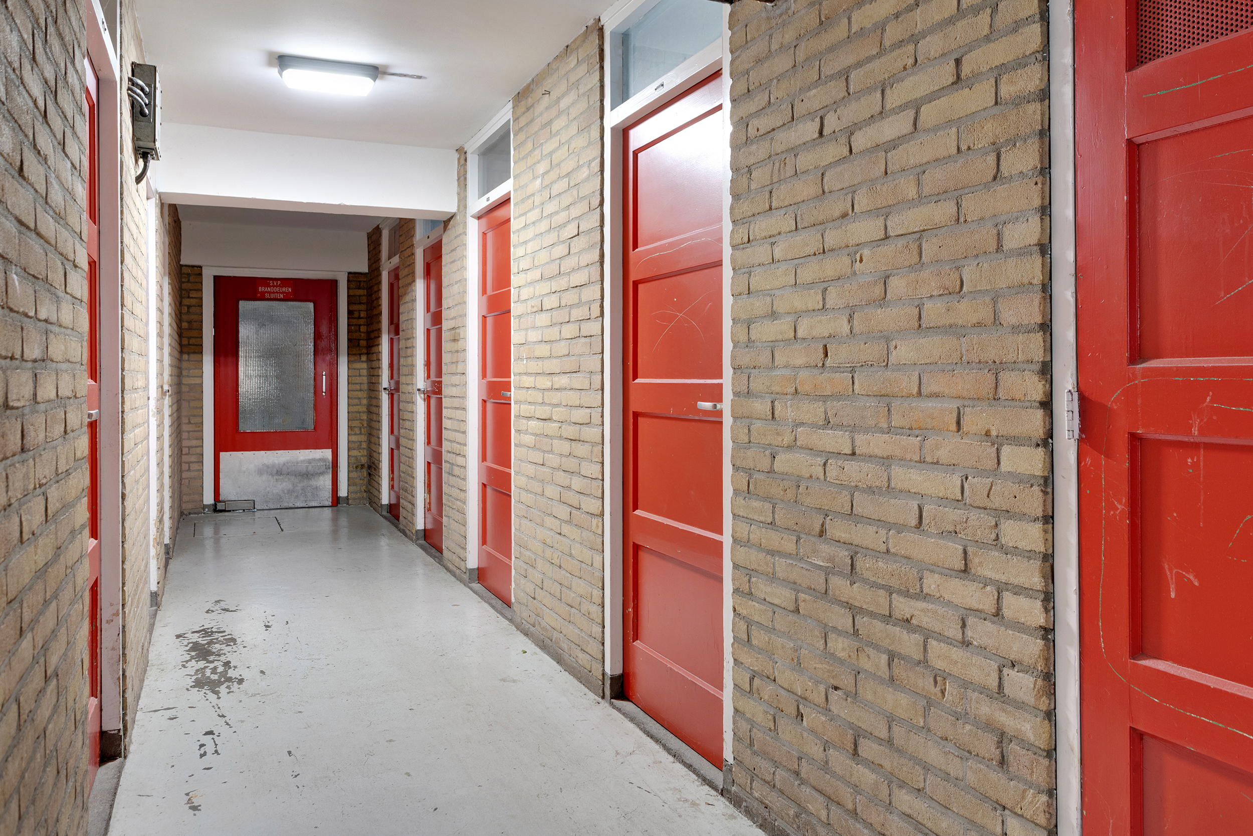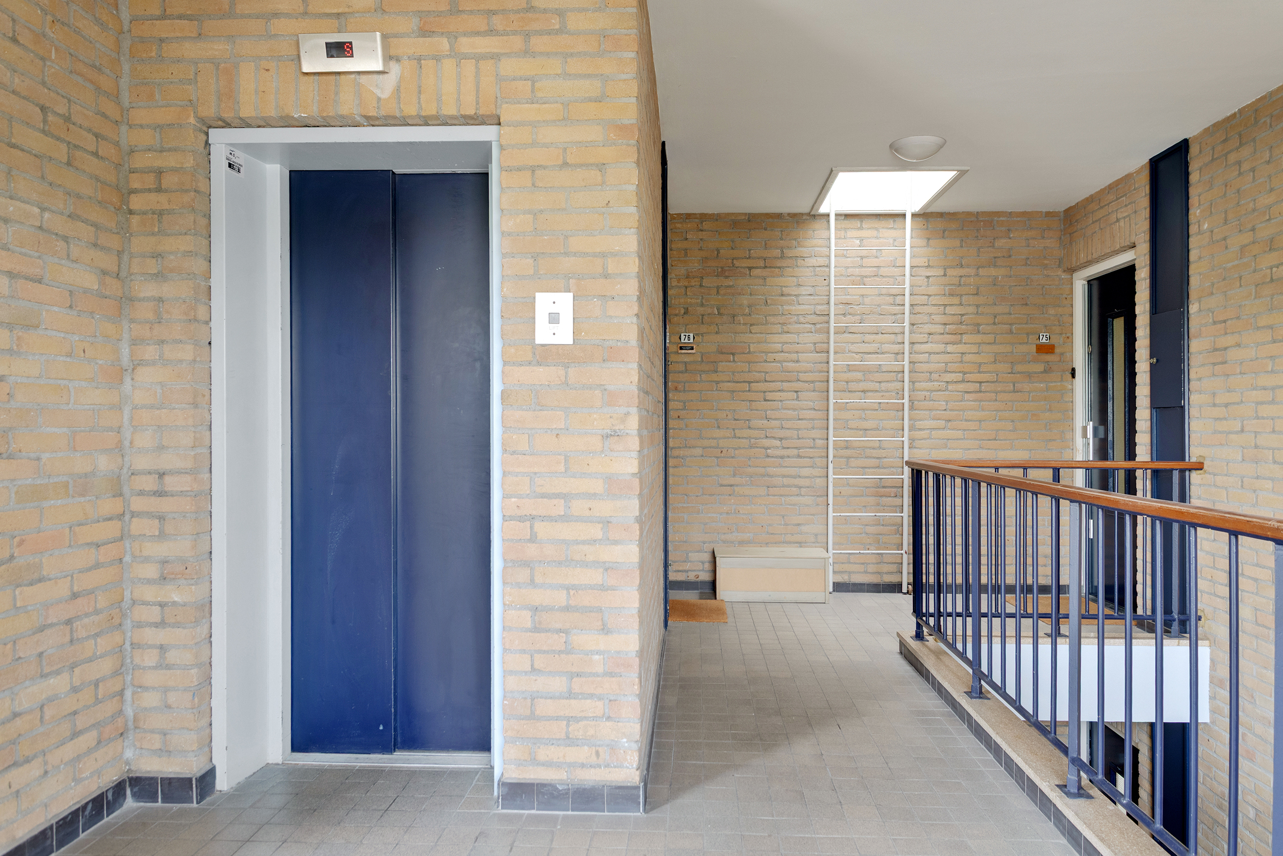 Gezamenlijk portiek met toegang, lift en trappenhuis. Vanuit de hal heb je toegang tot je berging en de gemeenschappelijke binnentuin.