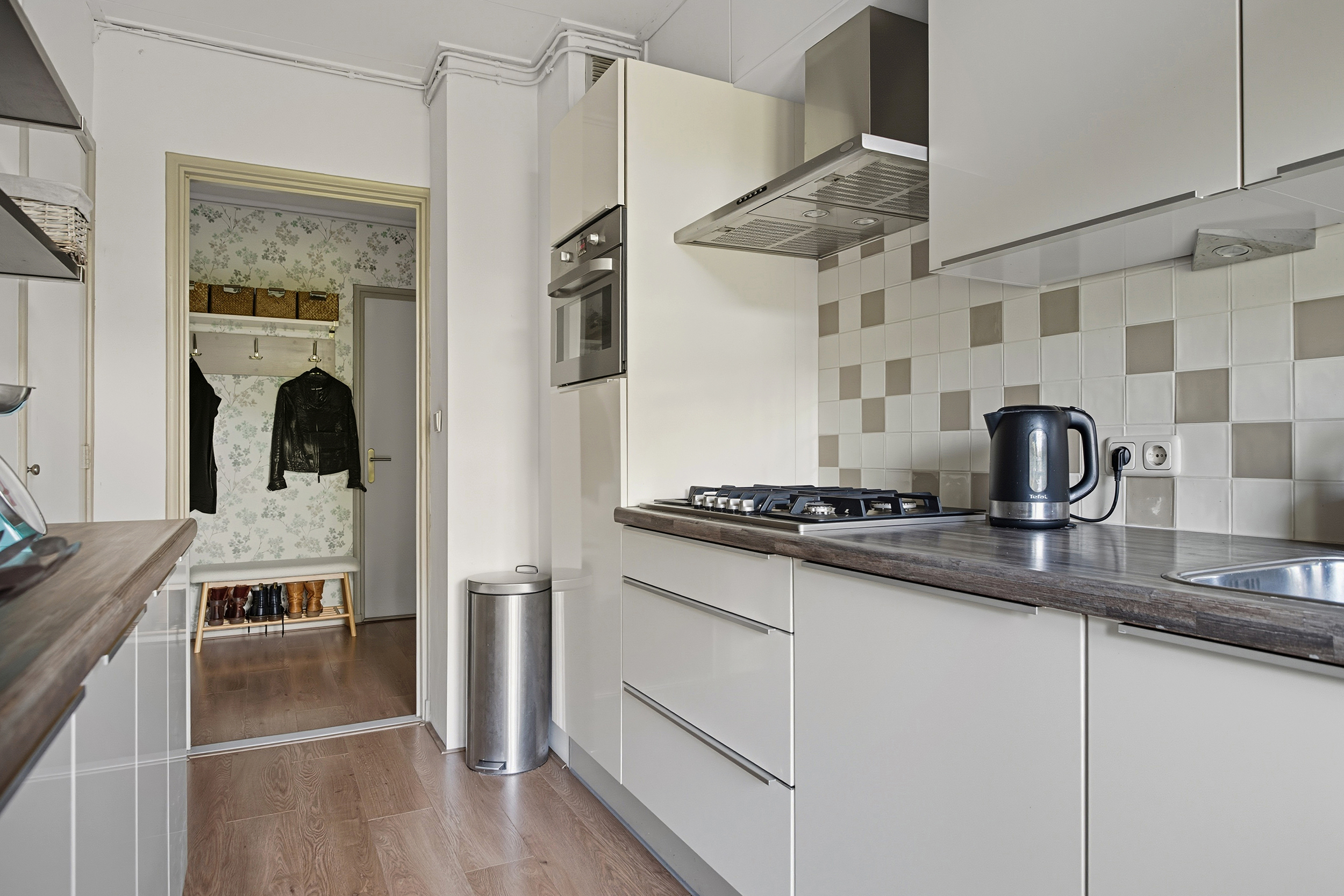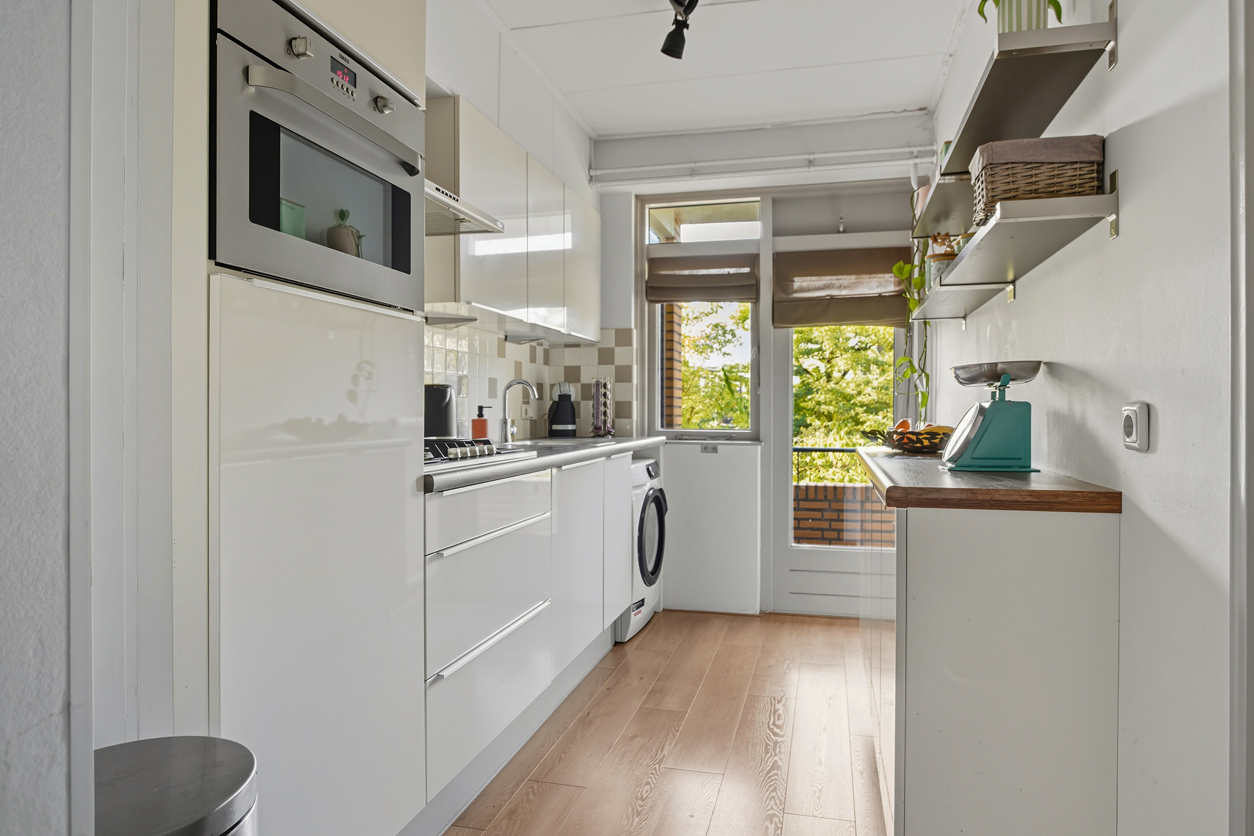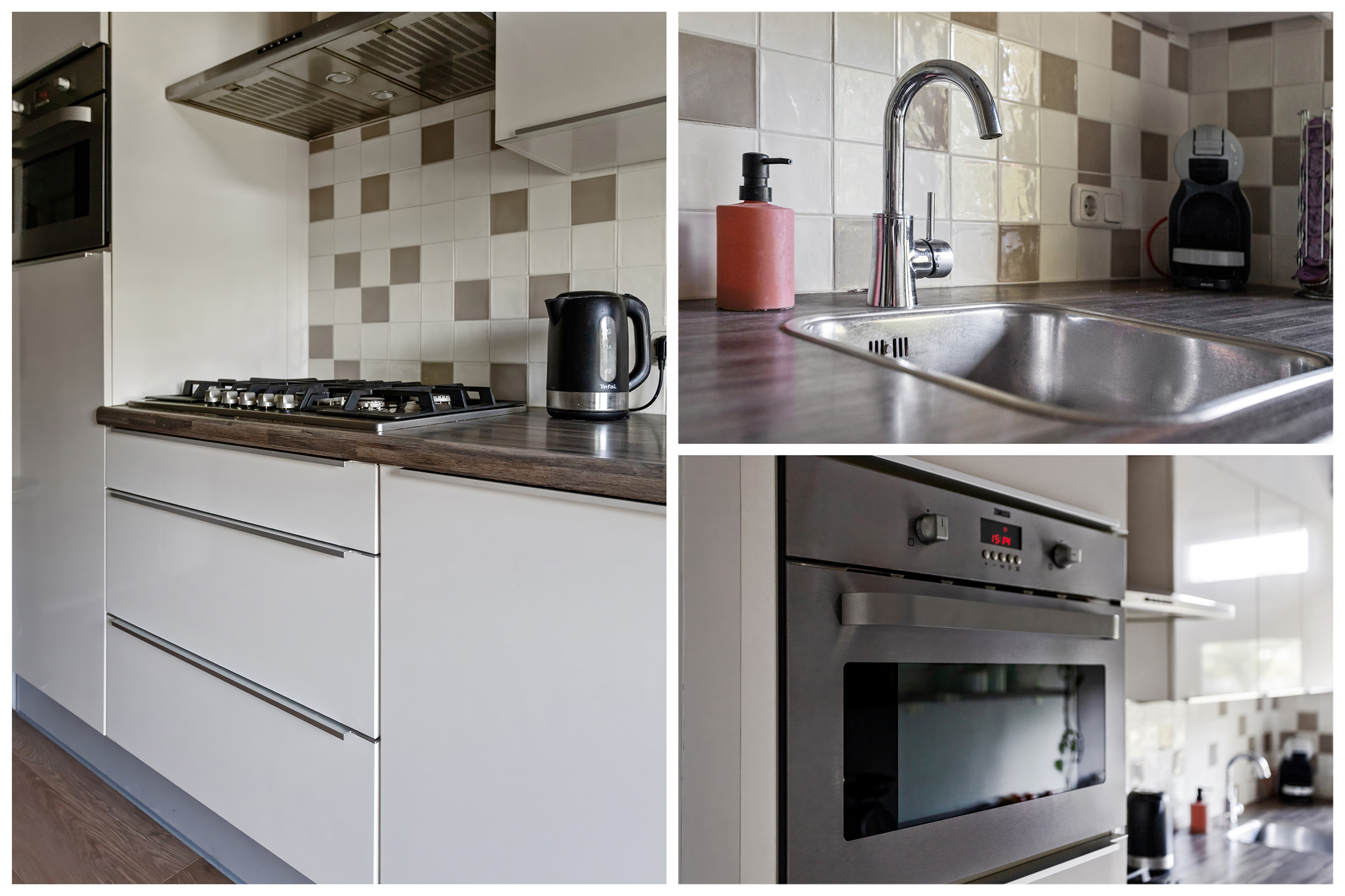De keuken is stijlvol en strak vormgegeven, met glanzend witte fronten en een donker werkblad dat mooi contrasteert. Je hebt hier alle ruimte om te koken en te bakken, met praktische inbouwapparatuur zoals een oven, gaskookplaat, afzuigkap en koelkast. Ook is er plek voor een wasmachine. De tegels op de achterwand geven de keuken een speelse touch, terwijl de deur naar het balkon zorgt voor licht en een directe verbinding met buiten.