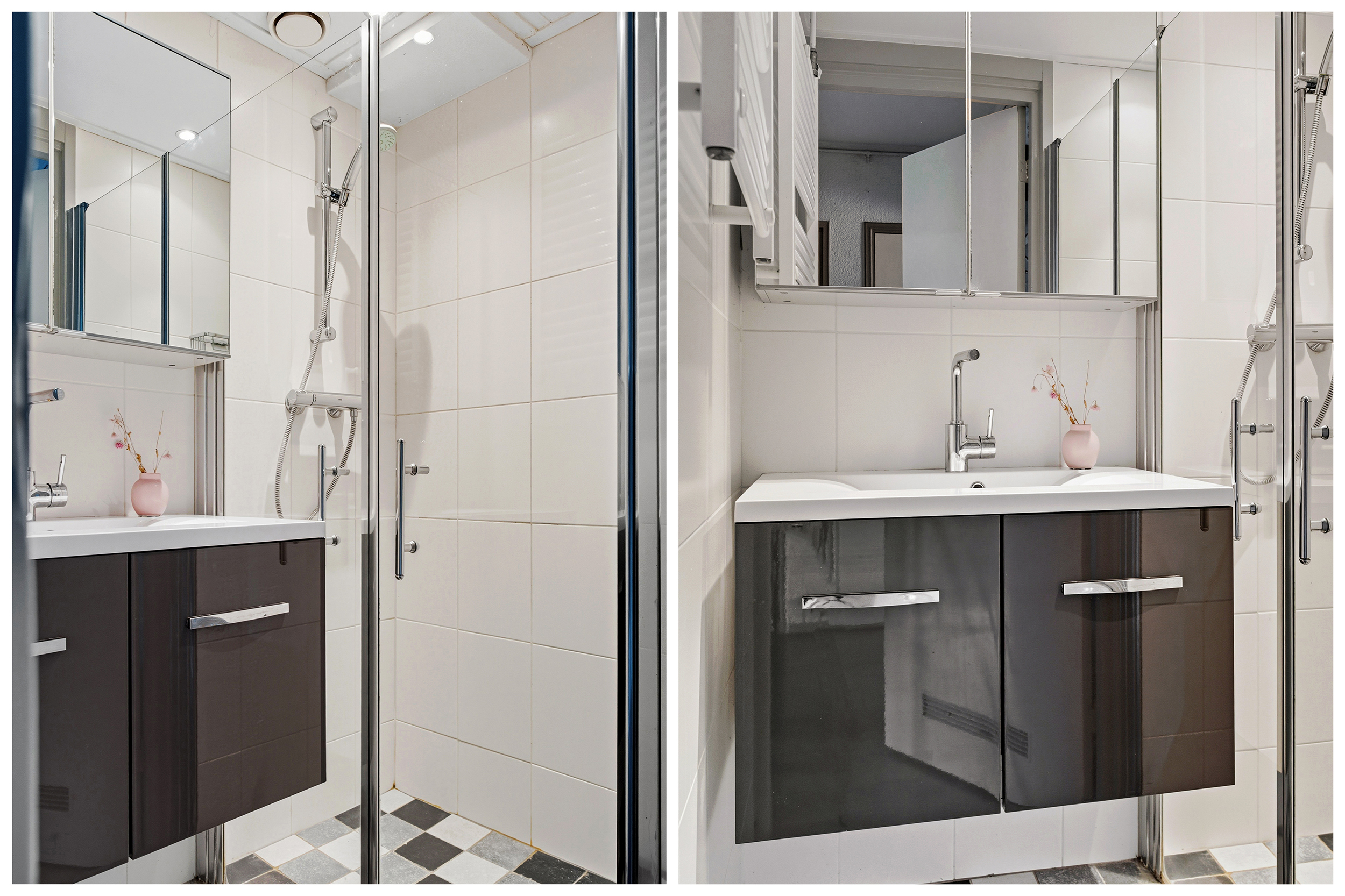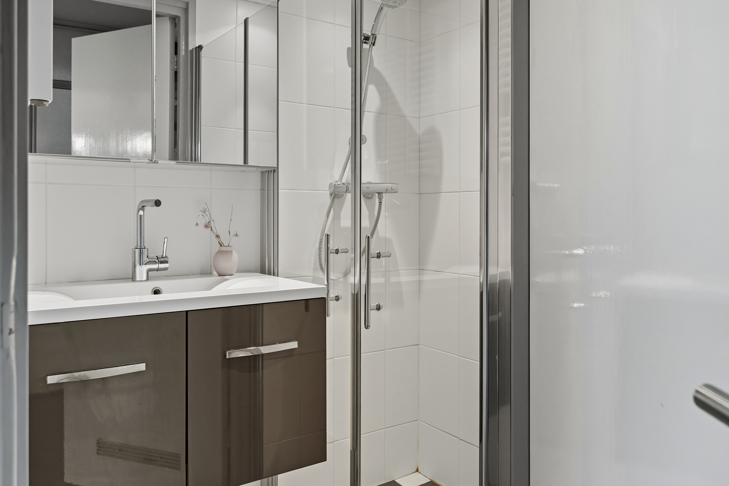 De compact en praktisch ingedeelde badkamer beschikt over een douche en wastafel met meubel. Het separate toilet bevindt zich ook aan de hal.