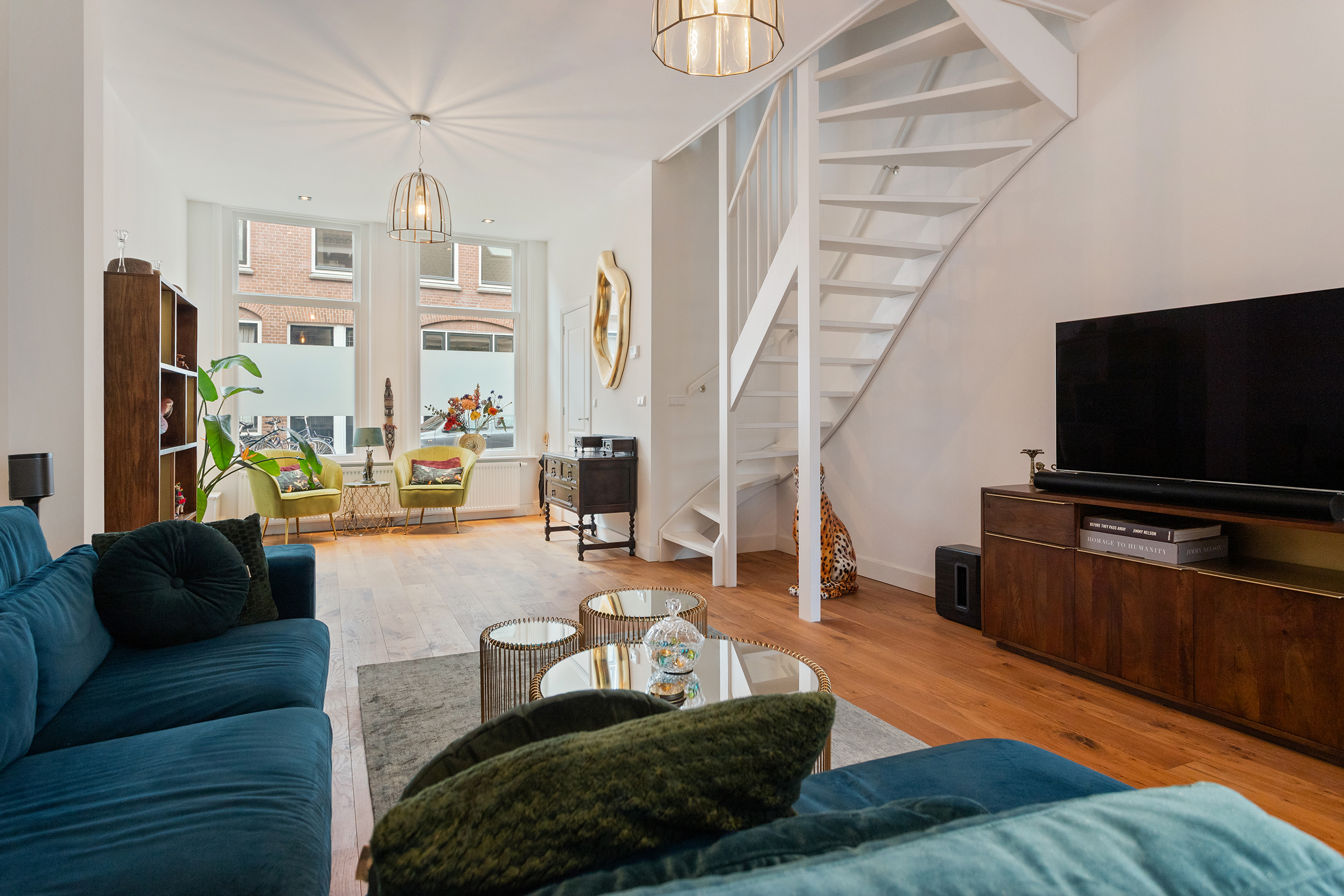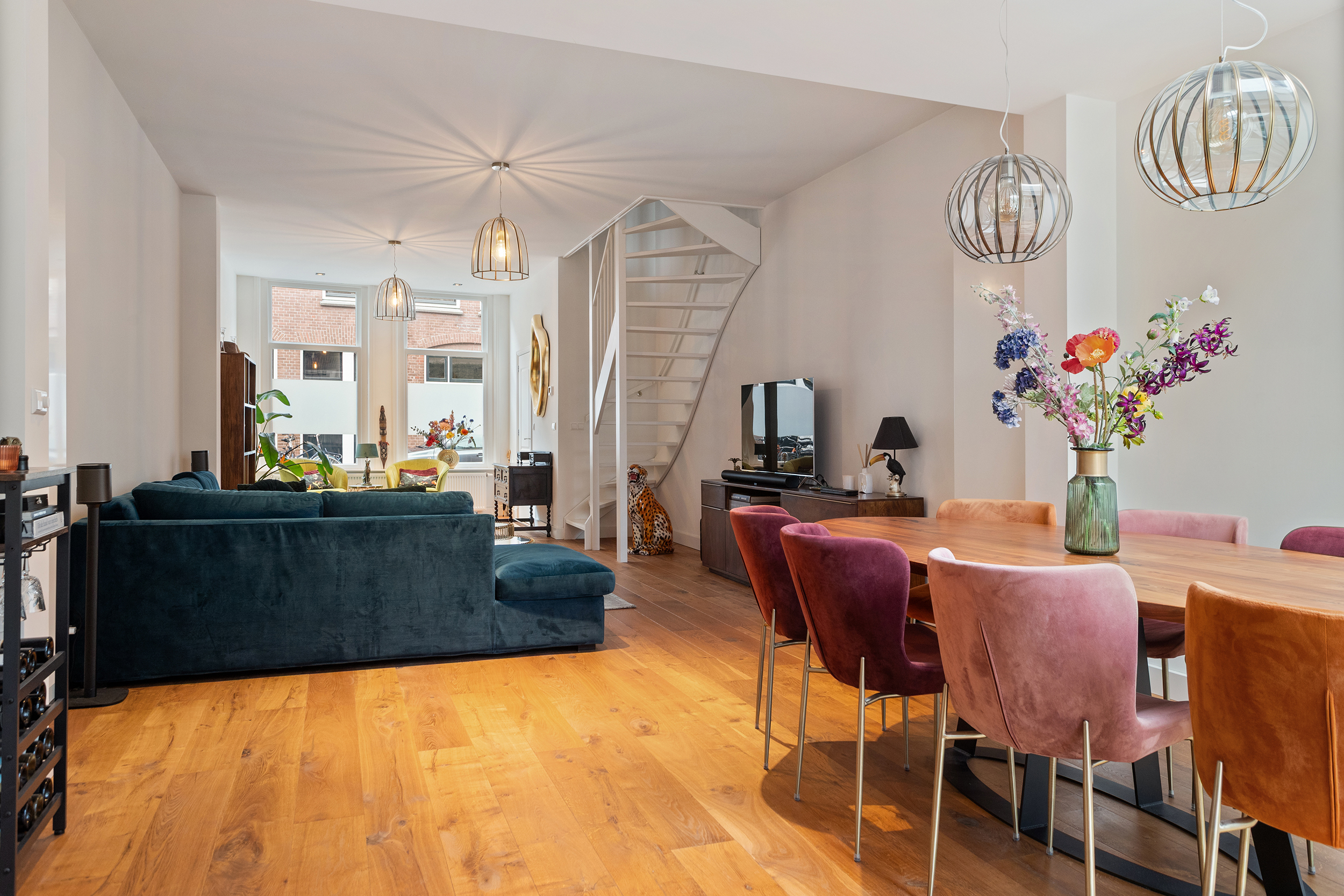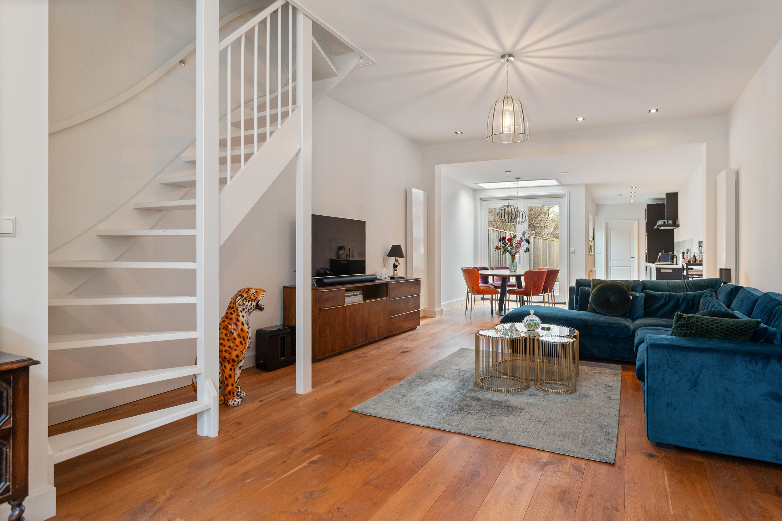 De woonkamer is ronduit indrukwekkend. Ruim 50 m² aan leefruimte strekt zich uit over vrijwel de volledige lengte van de woning en voelt vanaf het eerste moment groots en open aan. De hoge plafonds geven lucht en spanning, de doorlopende houten vloer brengt warmte en samenhang over de hele woonverdieping.
