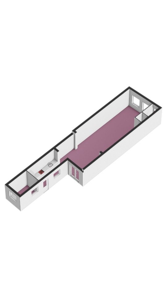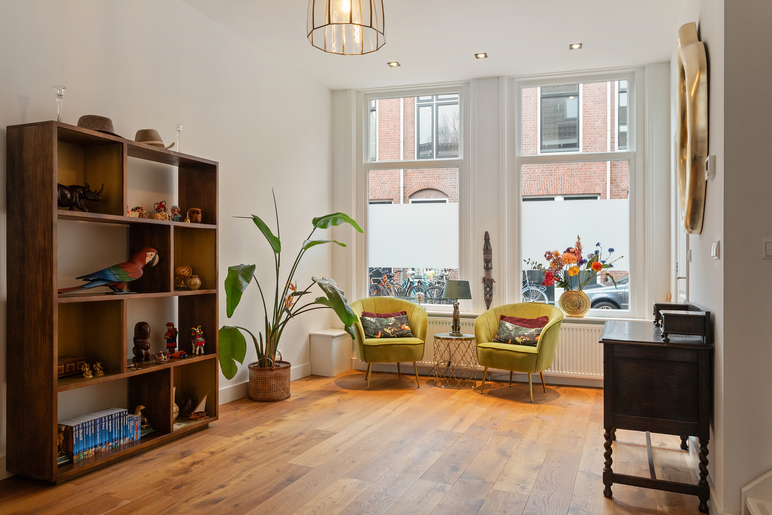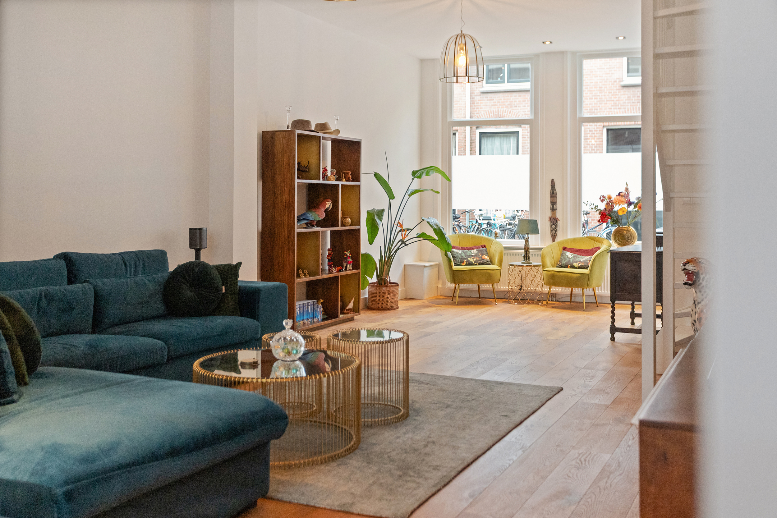 De woonkamer is ronduit indrukwekkend. Ruim 50 m² aan leefruimte strekt zich uit over vrijwel de volledige lengte van de woning en voelt vanaf het eerste moment groots en open aan. De hoge plafonds geven lucht en spanning, de doorlopende houten vloer brengt warmte en samenhang over de hele woonverdieping.