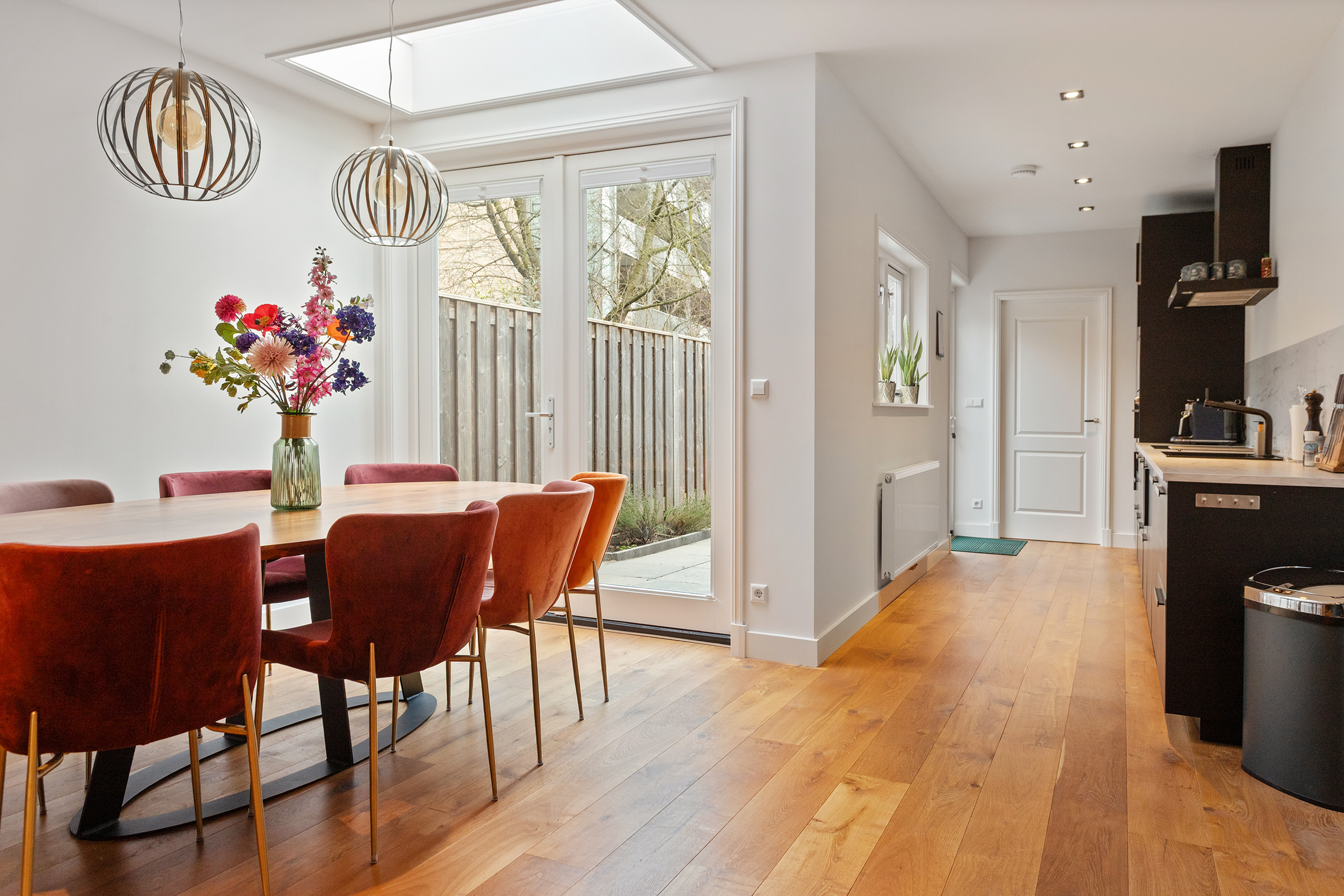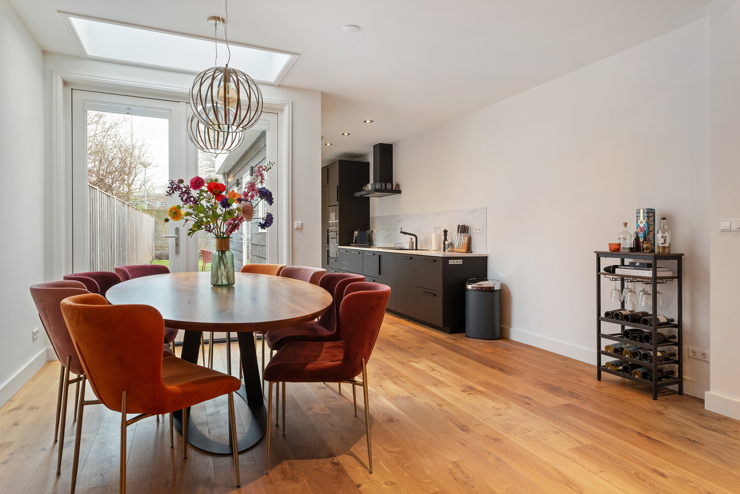 Aan de voorzijde is ruimte voor een comfortabel zitgedeelte. Aan de achterzijde, onder de lichtkoepel, is ruimte voor een grote eettafel: dé plek waar je het liefst samenkomt en waar lange diners en gezellige avonden vanzelf ontstaan. De openslaande deuren naar de tuin versterken het open karakter en verbinden binnen met buiten op een prachtige manier.