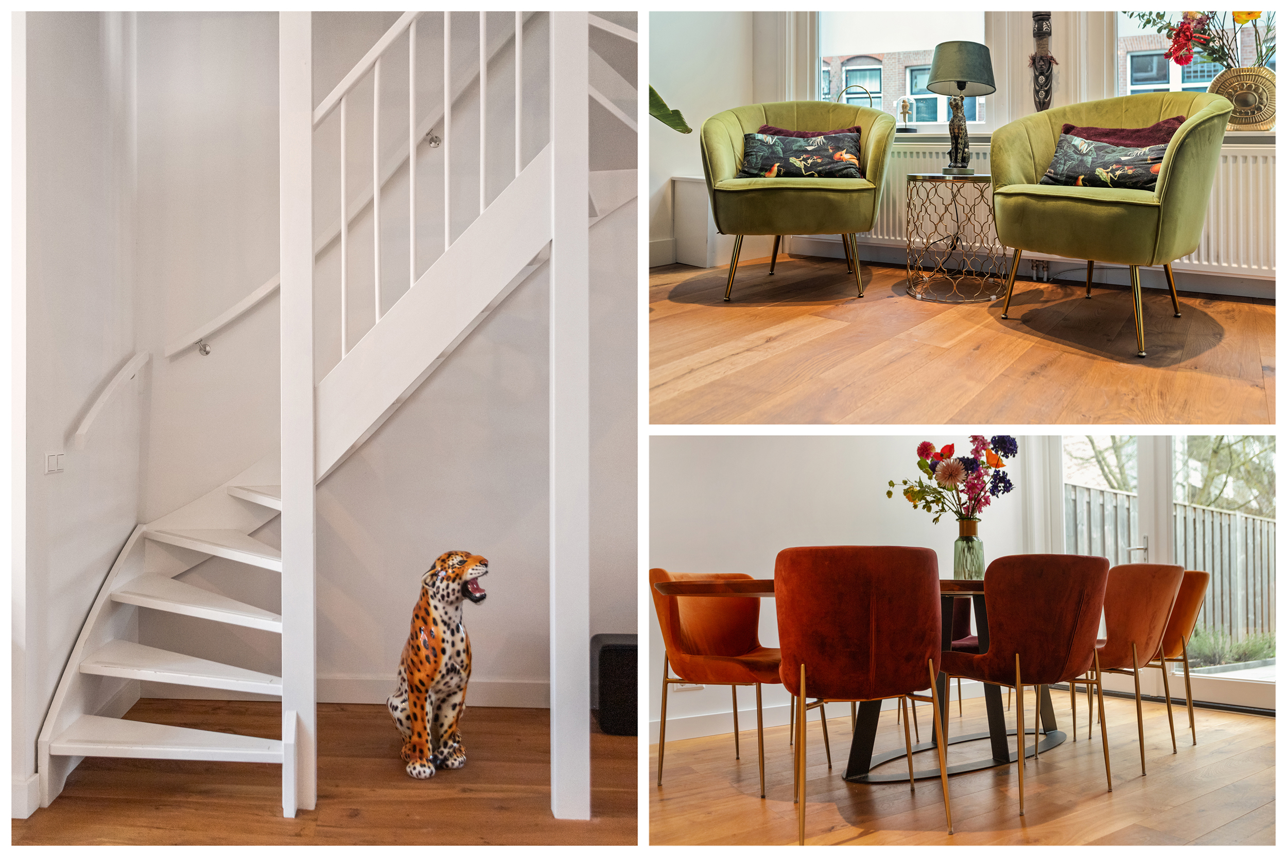 Het licht is hier fenomenaal. Dankzij de vele raampartijen, het dakraam en de openslaande deuren aan de achterzijde valt het daglicht rijkelijk binnen en verandert de sfeer gedurende de dag continu.