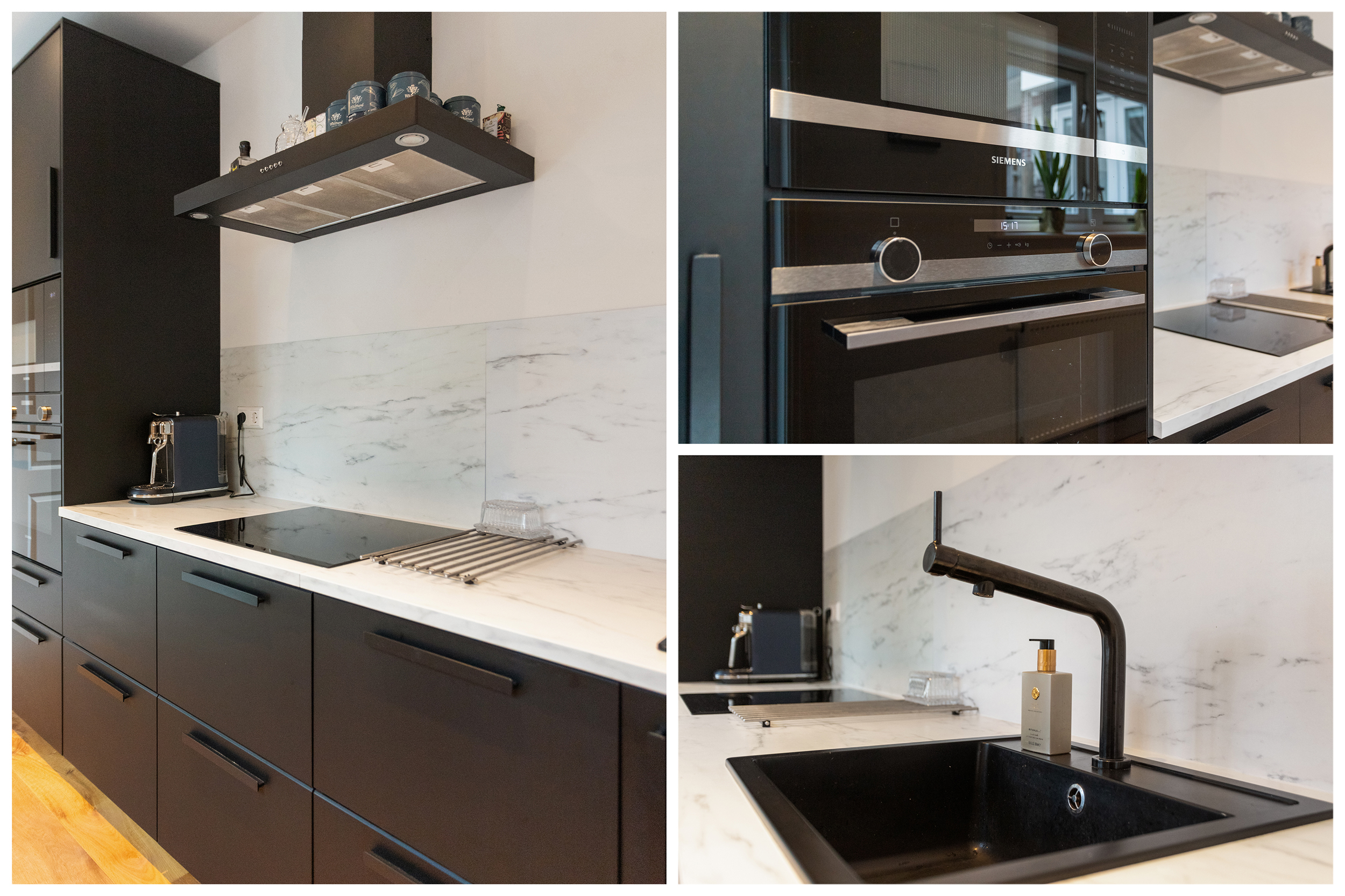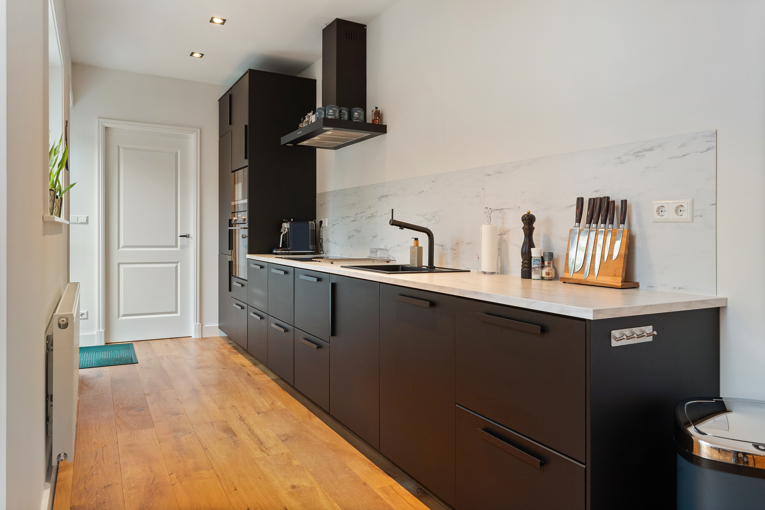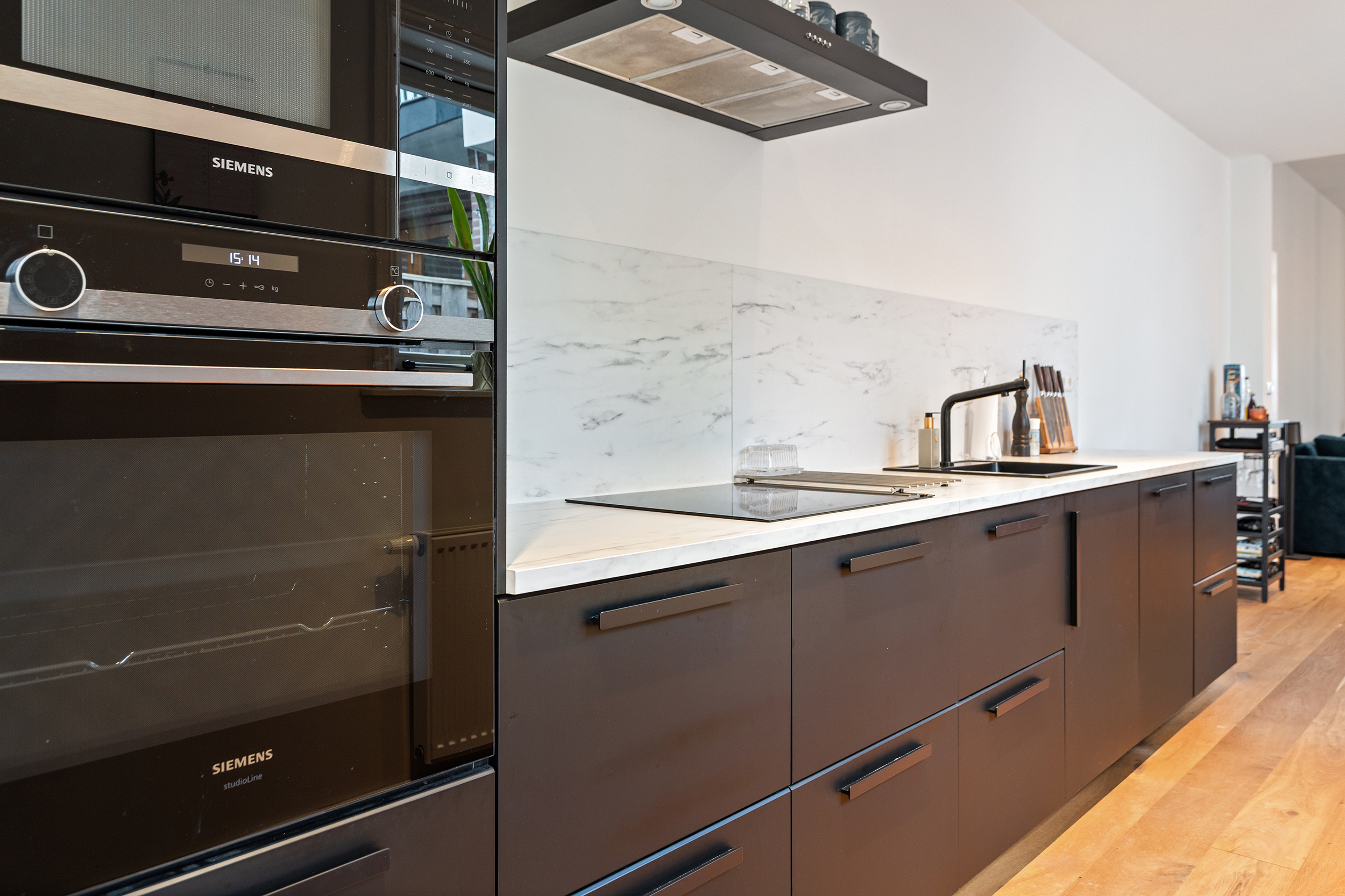 De keuken vormt een vanzelfsprekend verlengstuk van de woonkamer en sluit naadloos aan op het woon- en eetgedeelte. De strakke vormgeving, met donkere fronten, een licht werkblad en een marmerlook achterwand, geeft de keuken een krachtige en hoogwaardige uitstraling die perfect past bij de rest van de begane grond. De keuken beschikt over alle benodigde voorzieningen, zoals een inductiekookplaat, oven, koel-/vriescombinatie en vaatwasser, en biedt daarnaast volop kastruimte en werkruimte.