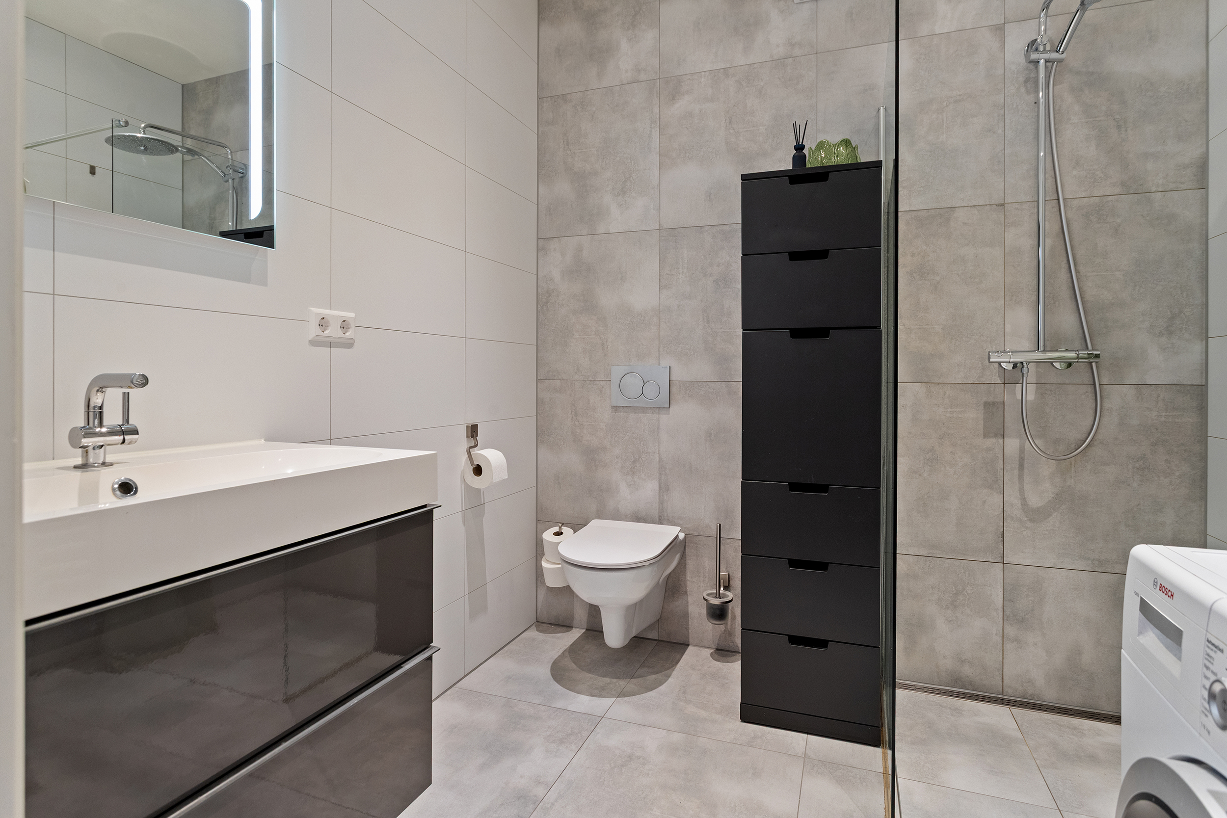 De badkamer is stijlvol uitgevoerd en beschikt over een toilet, een inloopdouche, een wastafel met meubel, een wasmachineaansluiting en een designradiator. Een comfortabele en verzorgde ruimte die perfect aansluit bij het niveau van de woning.