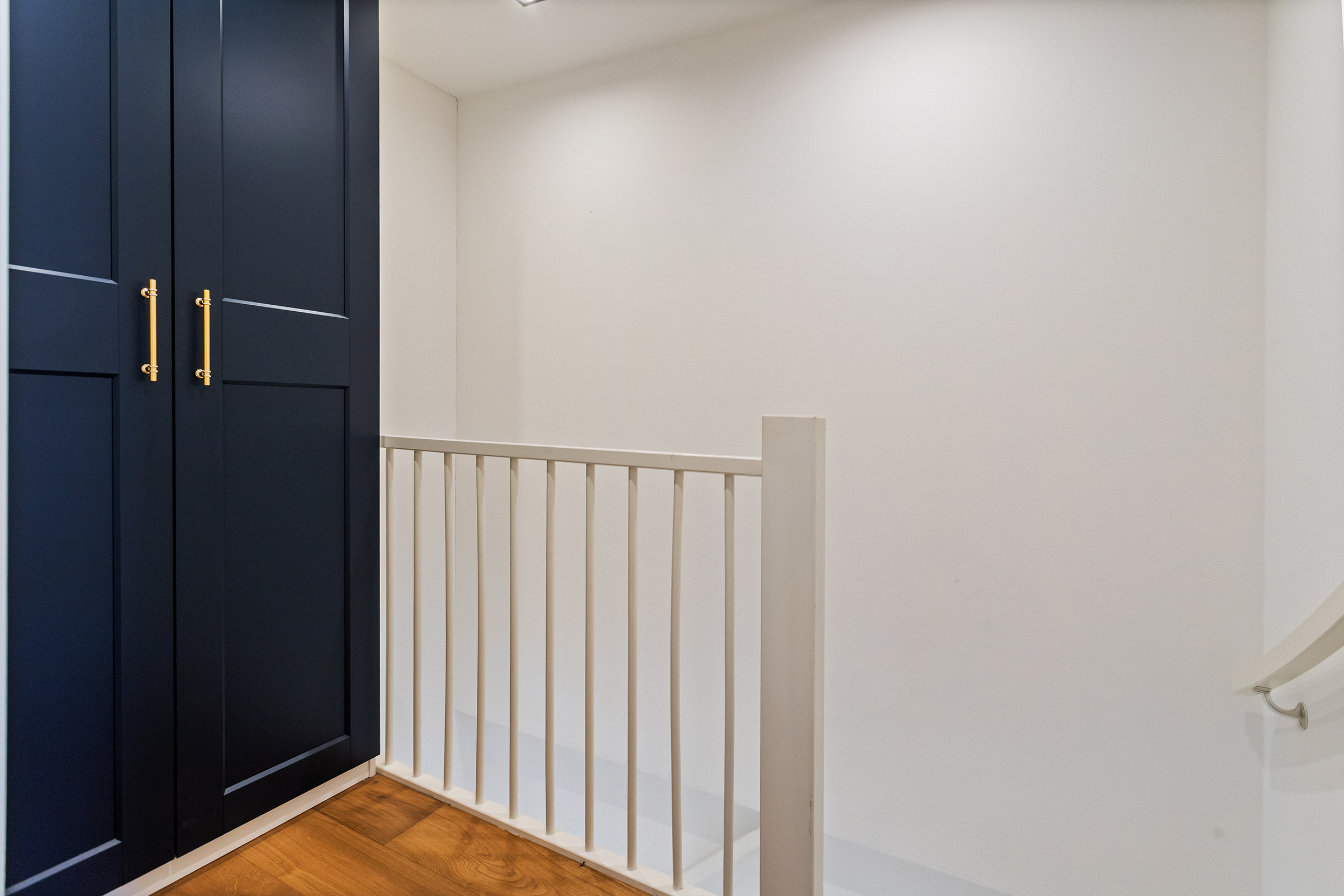 Op de eerste verdieping geeft de overloop toegang tot de vertrekken. Hier ligt dezelfde fraaie houten vloer als op de begane grond, wat zorgt voor een mooie continuïteit en een rustige uitstraling.